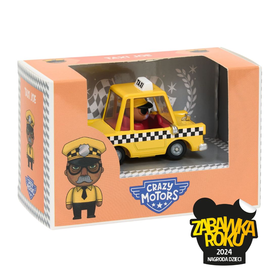 Dokąd jedziemy? Taksówkarz Joe zna każdą uliczkę Crazy miasta, ponieważ taksówka to nie tylko jego praca, to całe jego życie! Ciężko zliczyć ile ludzidowiózł już na miejsce. Taxi Joe to samochodzik z nowej kolekcji Djeco - CrazyMotors. Jak sama nazwa wskazuje są to odjazdowe wyścigówki inspirowanekierowcami światowego formatu takimi jak Niki Lauda czy Michael Schumacher.Każde autko z serii jest wykonane z metalu i pojedynczych plastikowych części,które nadają unikatowego wyglądu. Posiadają metalowe zawieszenie i gumowe opony. Pojazdy pomalowane są metaliczną farbą. Każde autko prowadzi inny, przymocowany na stałe kierowca, którego głowa obraca się. Zabawka możestanowić część kolekcji, która liczy ponad 20 modeli oraz akcesoria takie jaklaweta, puzzle droga i piętrowy warsztat samochodowy z windą, myjnią, parkingiem i stacją ładowania pojazdów.