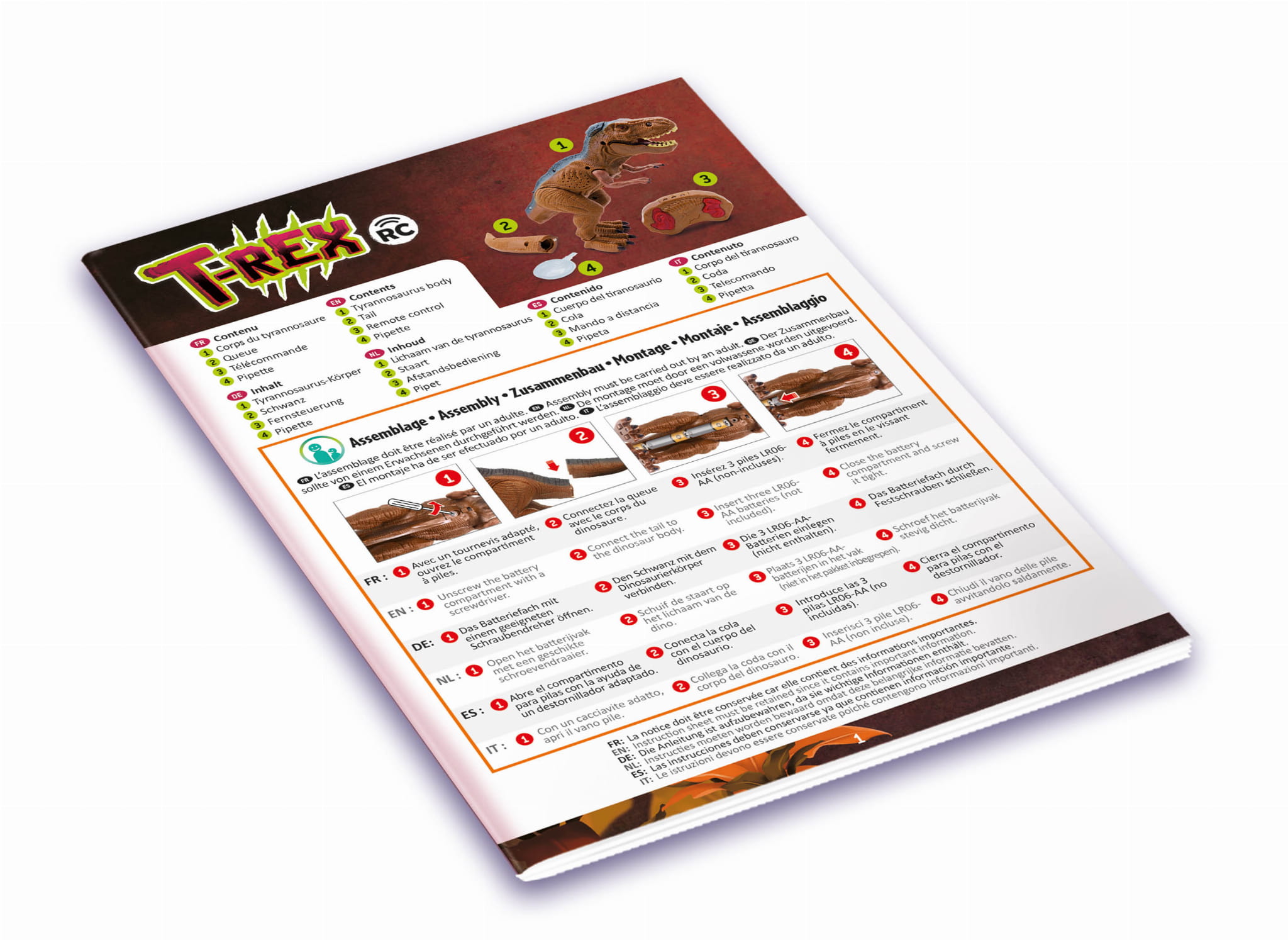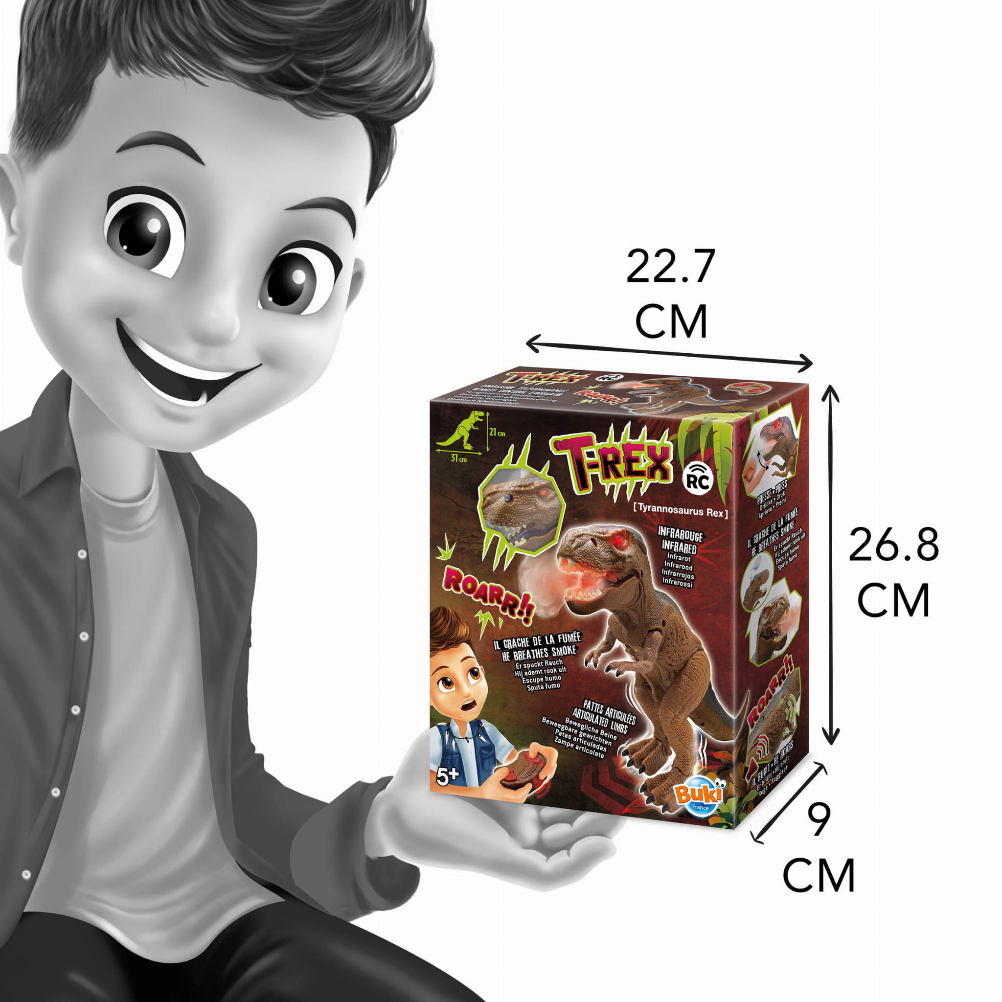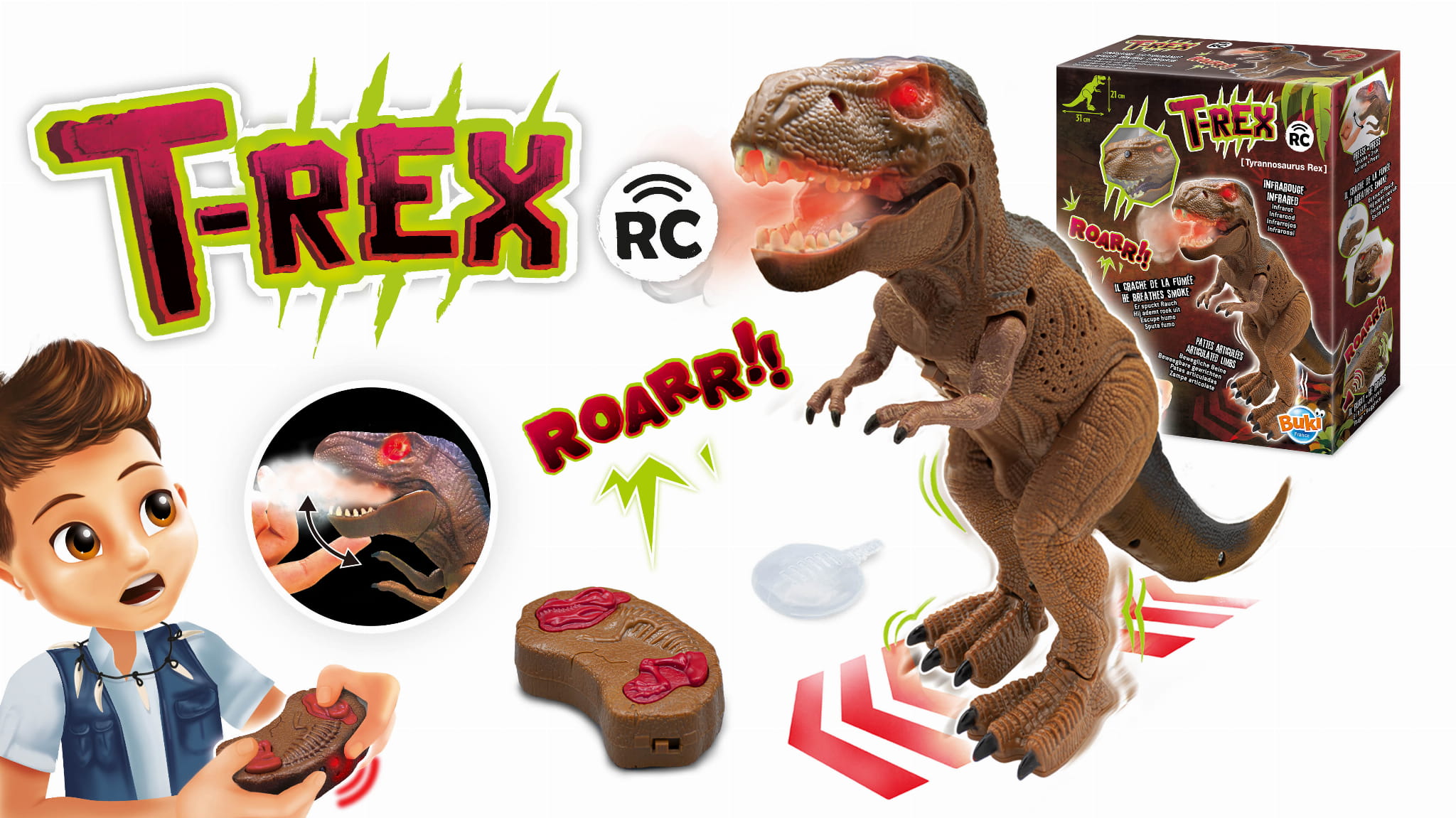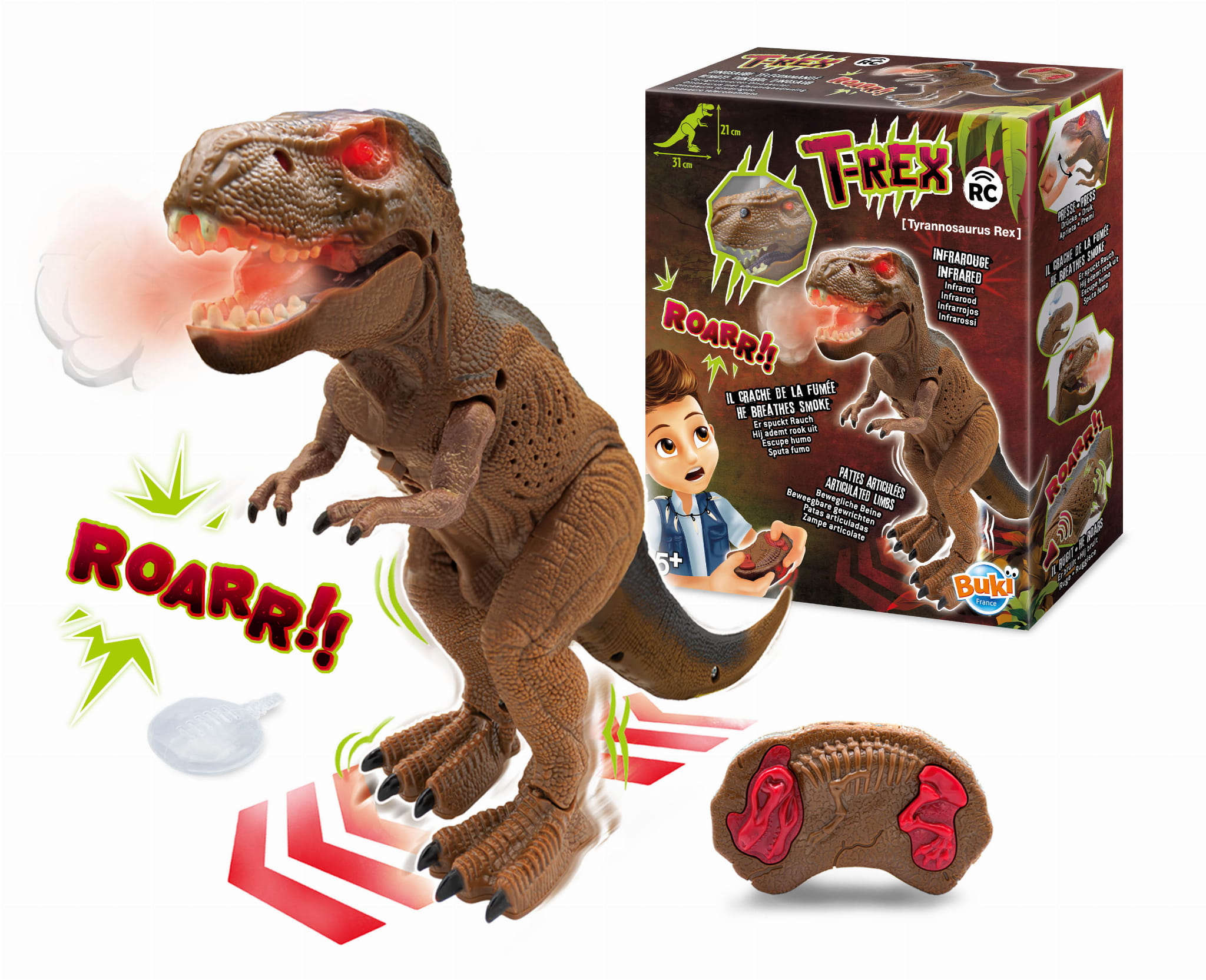 Zdalnie sterowany tyranozaur porusza swoimi nogami i powoli przesuwa się do przodu. W trakcie wędrówki jego oczy świecą się na czerwono, a z paszczy wydobywa się dym.