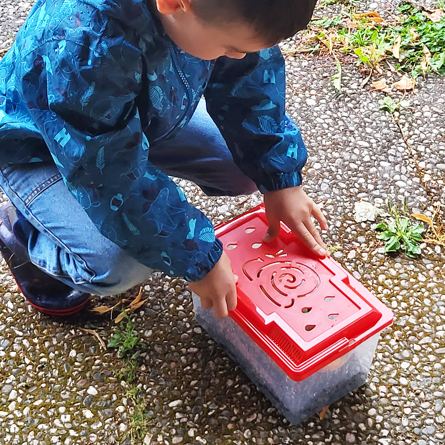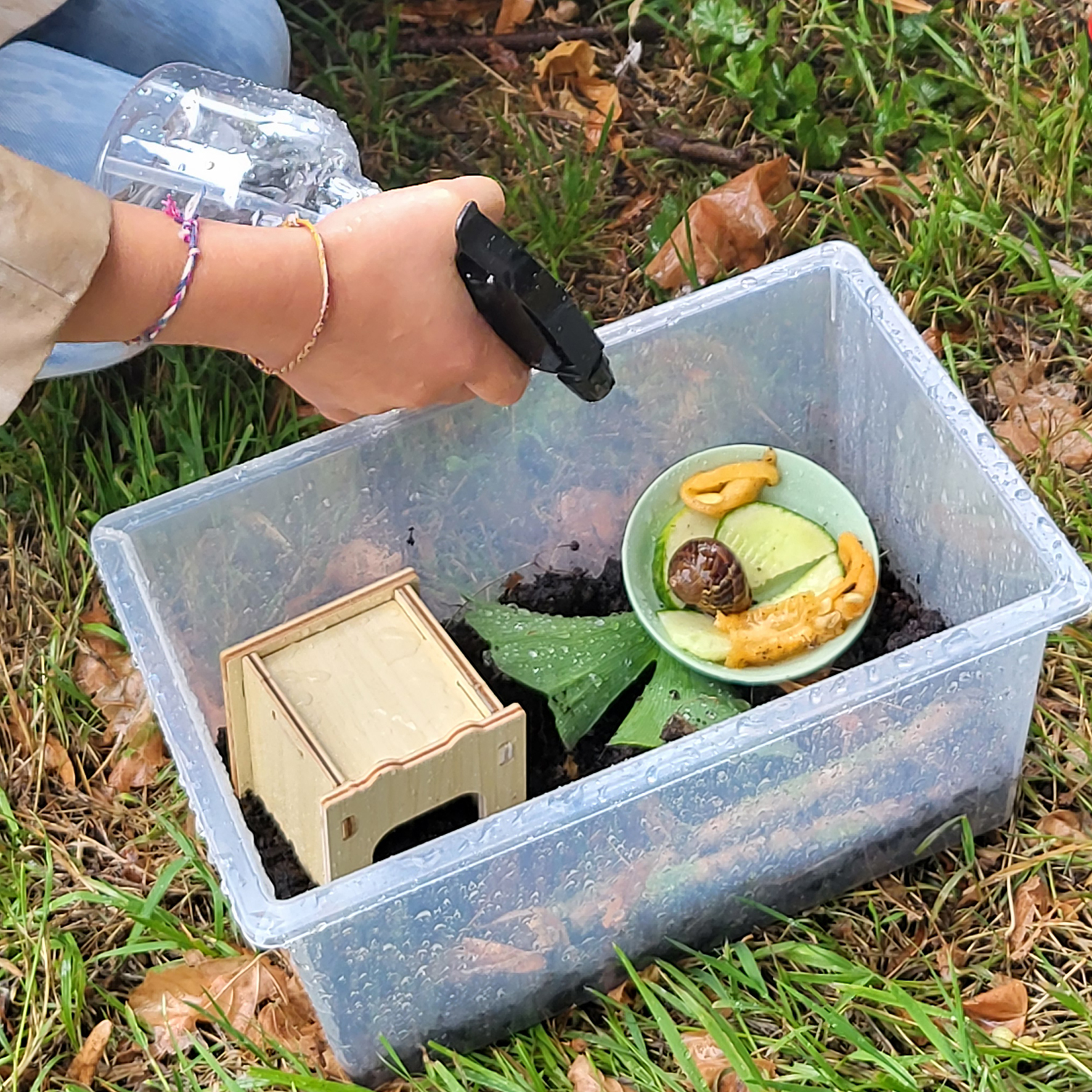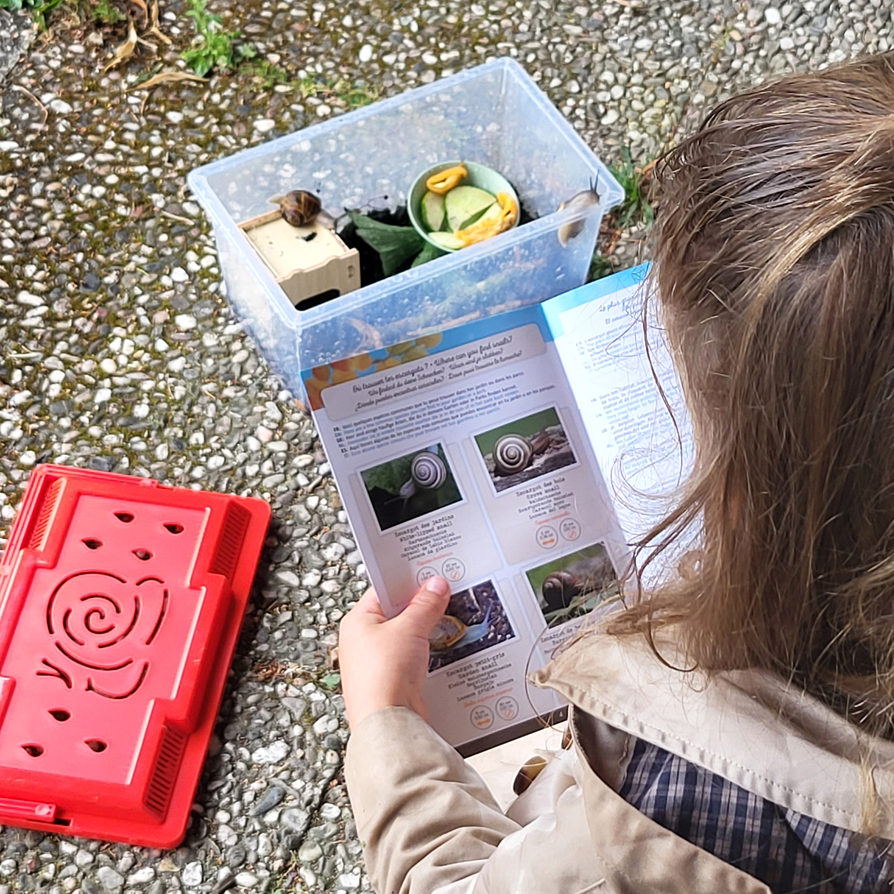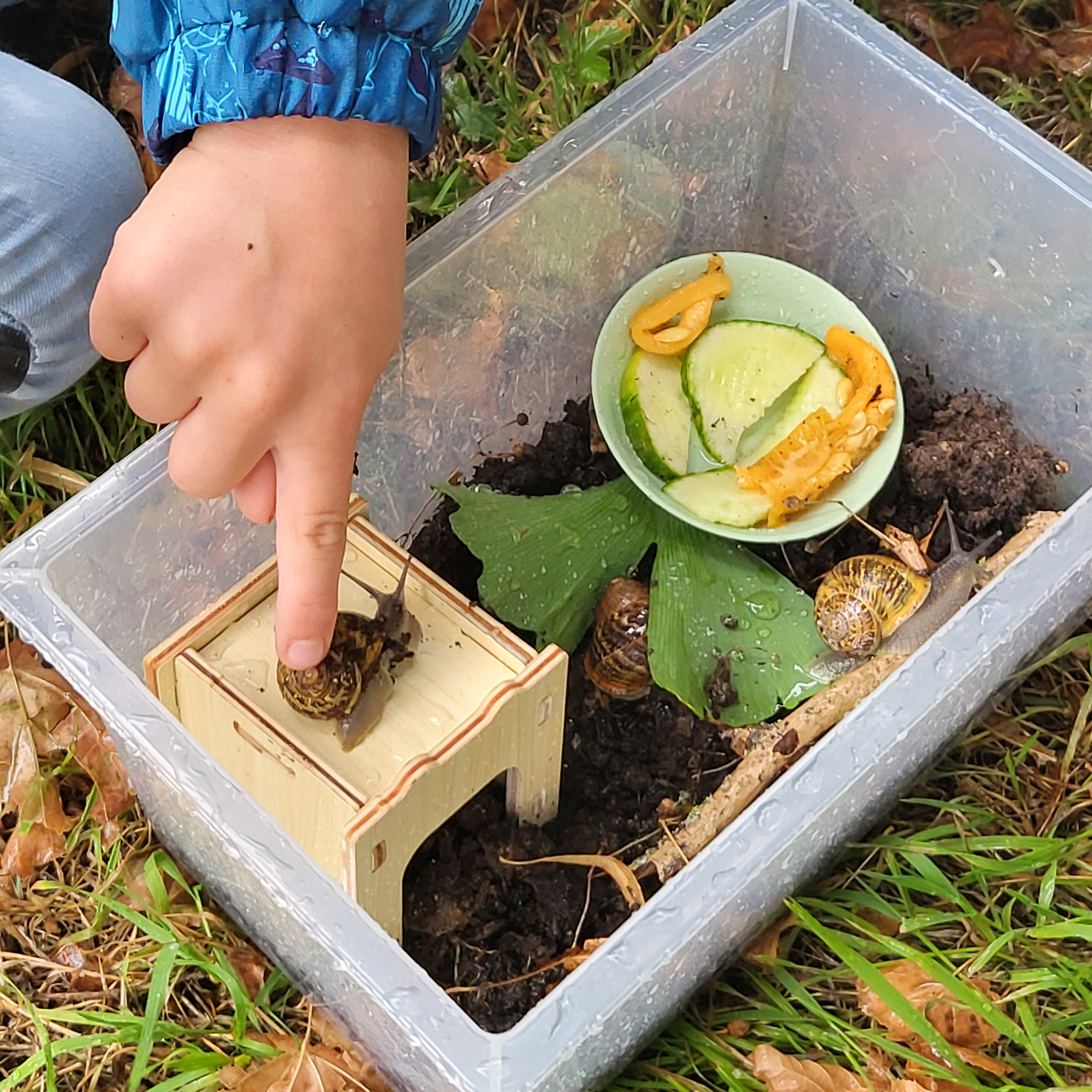 Dzieci kochają obcować z naturą. Przestronne pudełko od Buki to specjalne miejsce dla prawdziwych ślimaków z ogrodu, którym należy stworzyć odpowiednie środowisko. Zadanie dzieci polega na złapaniu i wpuszczeniu do środka kilku stworzeń oraz zapewnieniu im odpowiednich warunków do życia. Aktywność należy zacząć od wsypania odpowiedniej ilości ziemi lub kompostu oraz dodania obiektów takich jak zwiędłe liście lub mech. Ślimaki będą mogły się schronić w specjalnym domku dołączonym do zestawu.