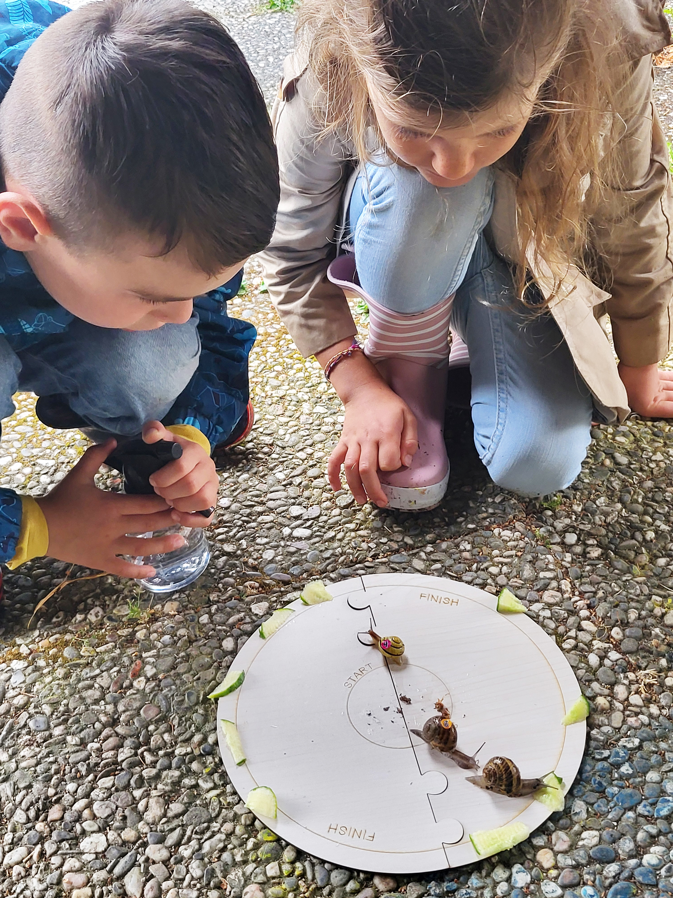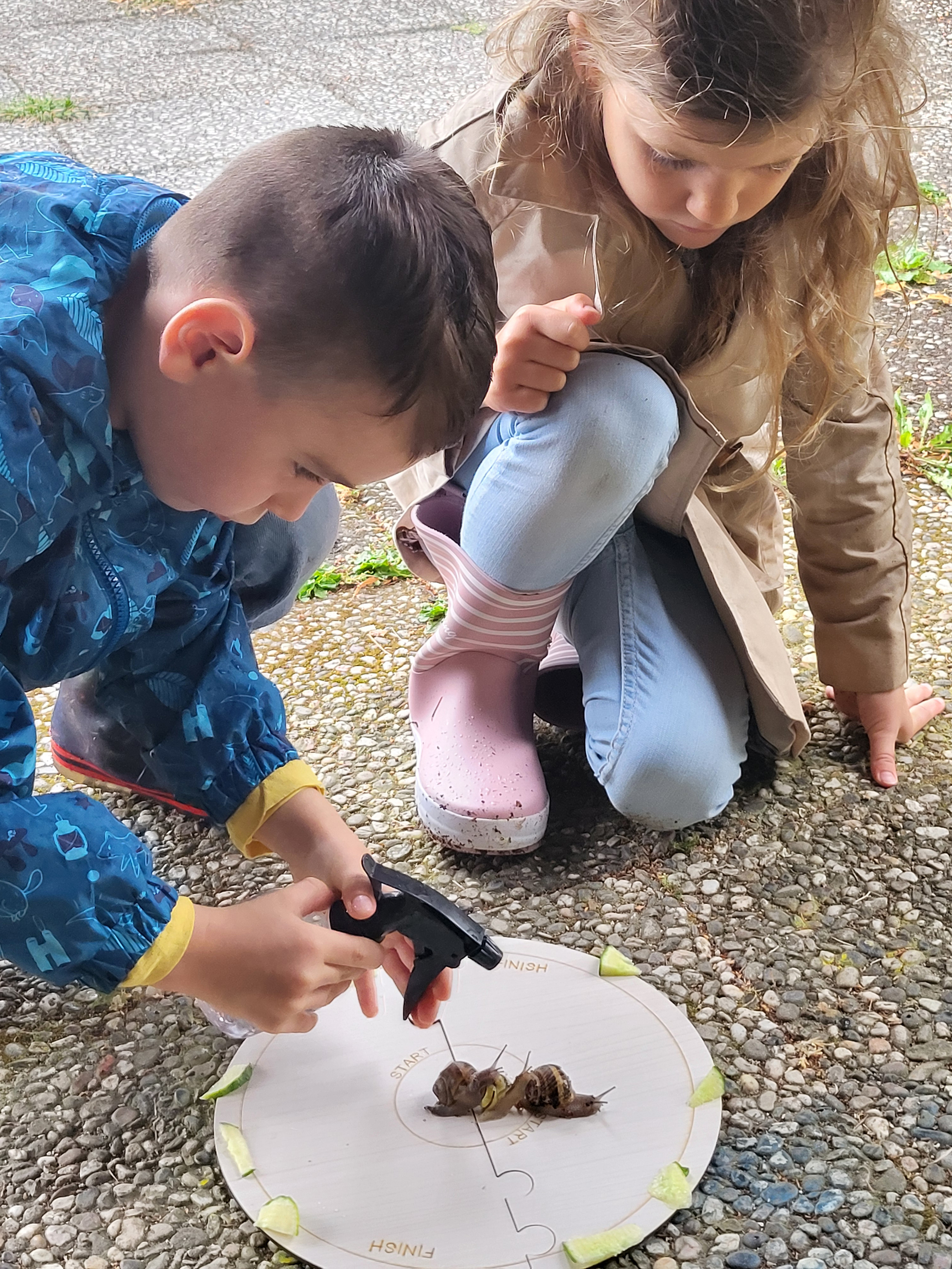 W zestawie znajduje się również specjalna podstawka, która stanowi grę dla ślimaków! Należy ułożyć na brzegach planszy pokarm, na ślimaki nakleić oznaczenia z cyframi i prowadzić obserwacje, który z nich dotrze do brzegu jako pierwszy!