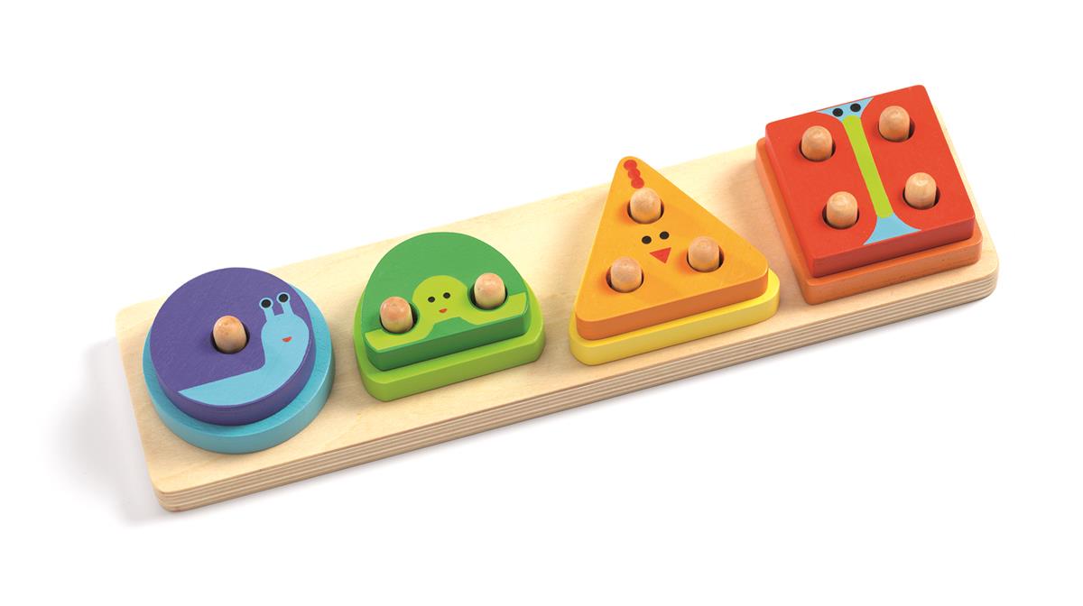 Drewniana układanka dla najmłodszych dzieci (od 18 miesięcy), która uczy kształtów i kolorów. Dzieci mogą układać puzzle i układać je na planszy. Do zabawy 4 zwierzęta: ślimak, żółw, kurczak i biedronka.