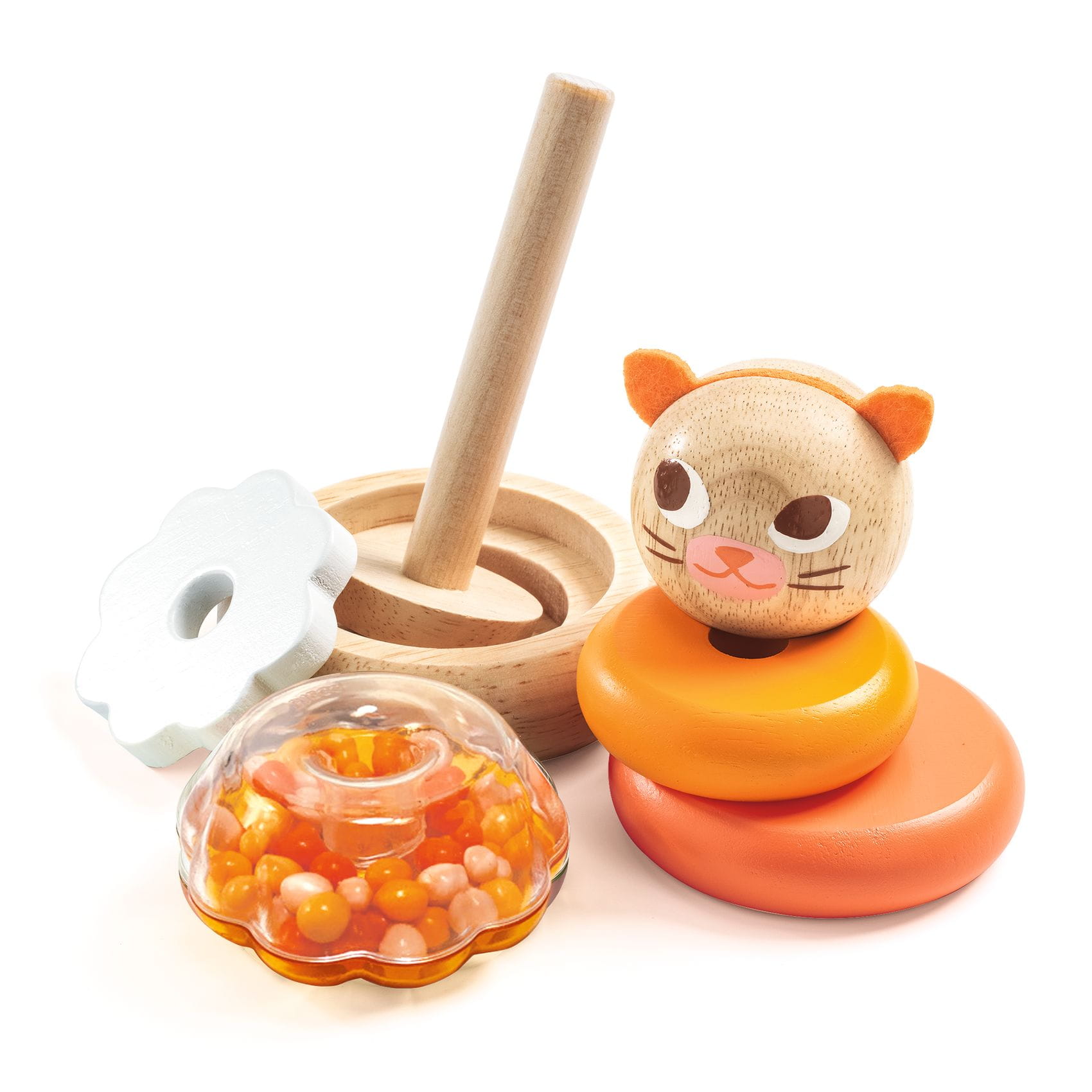 Drewniana zabawka, która polega na złożeniu kotka składającego się z 4 okręgów, zaczynając od największego. Jeden okręg jest przezroczysty i posiada w środku grzechoczące koraliki. Elementy zabawki są łatwe do chwycenia.