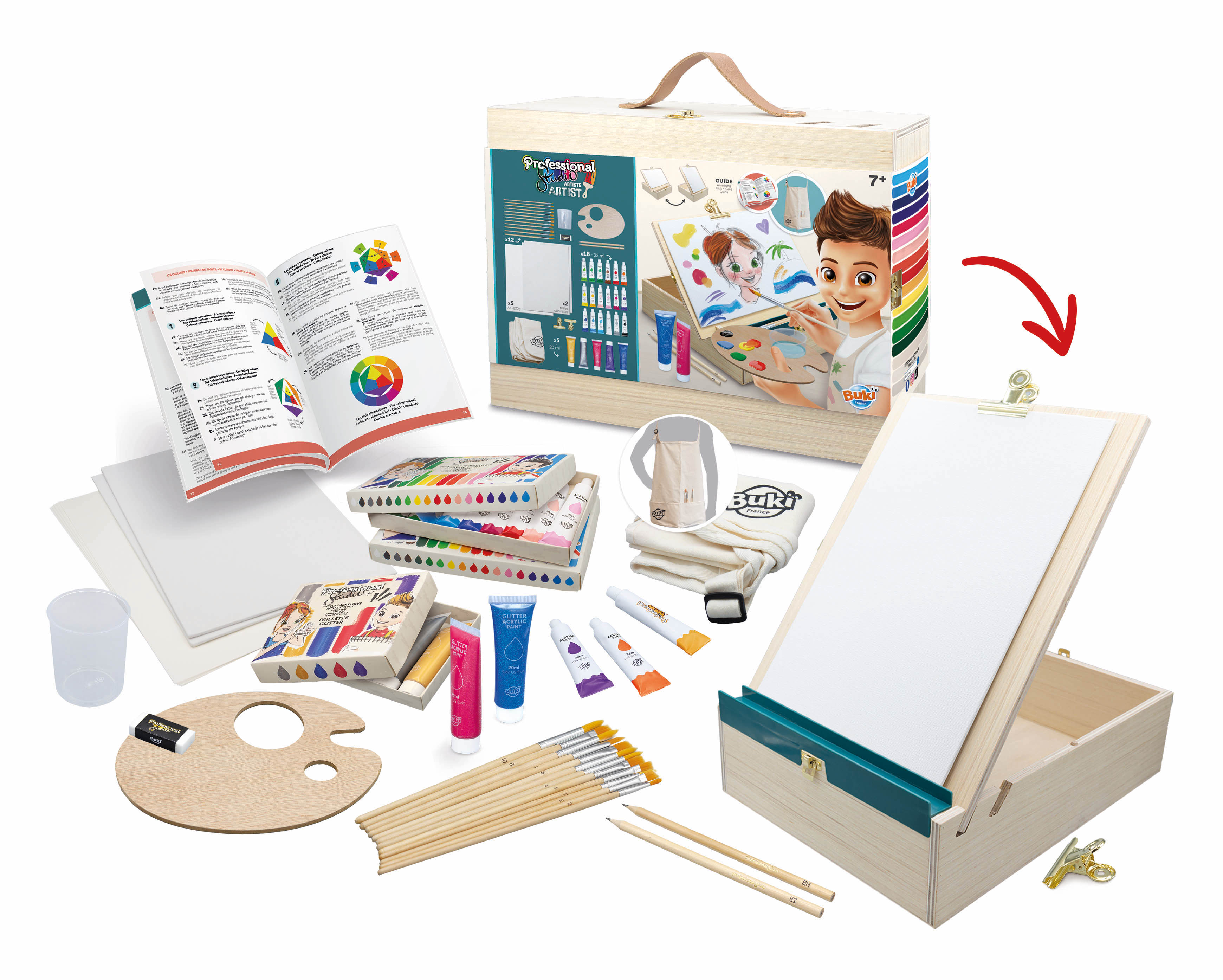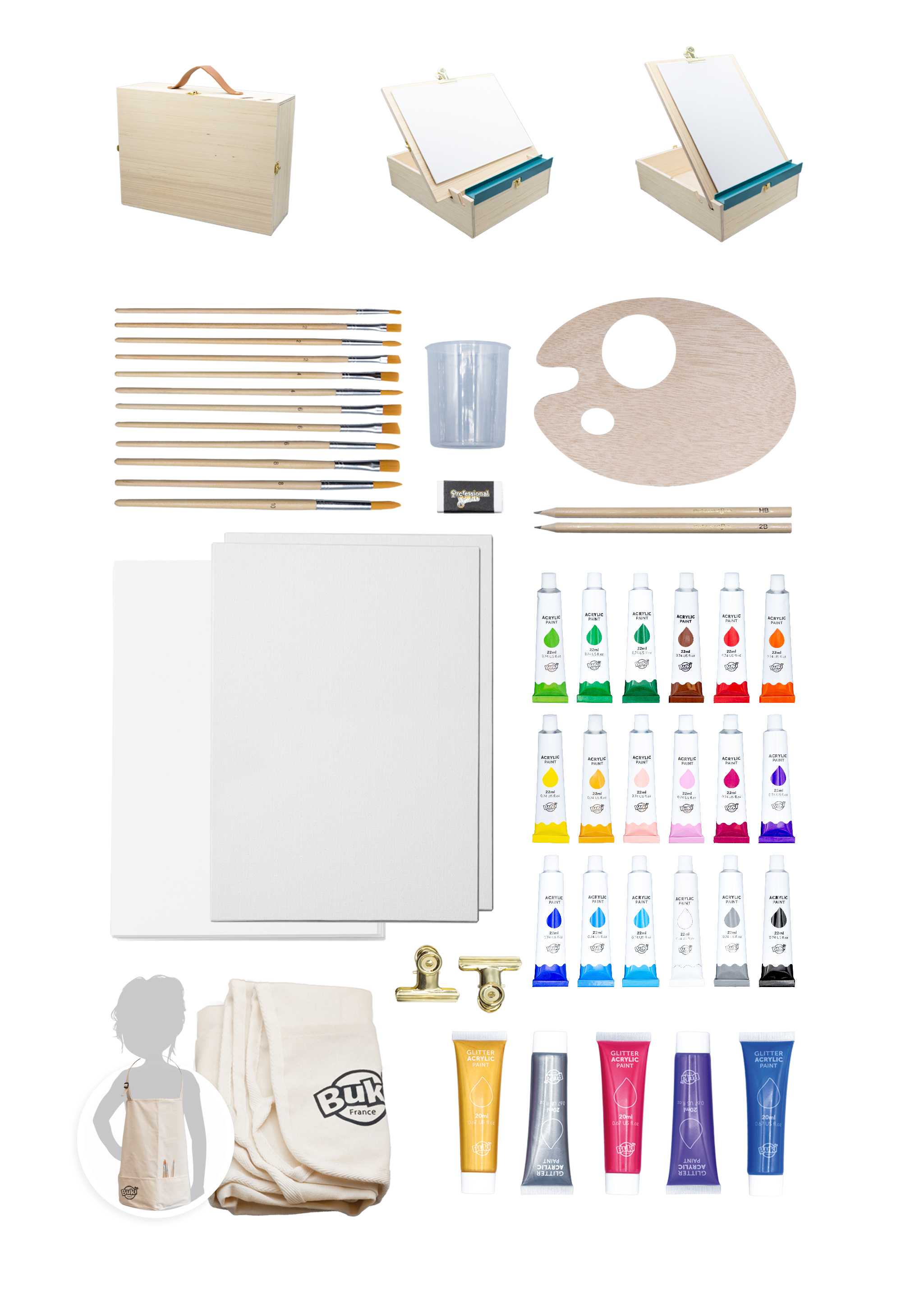 Drewniana walizka z akcesoriami zaprasza do świata kreatywności. Załóż fartuch, usiądź przy sztaludze i daj się ponieść wyobraźni. Zestaw artystyczny od BUKI zawiera wszystkie niezbędne akcesoria do tworzenia swoich unikatowych dzieł sztuki wraz z instrukcją dotyczącą różnych technik malarskich i mieszania kolorów.