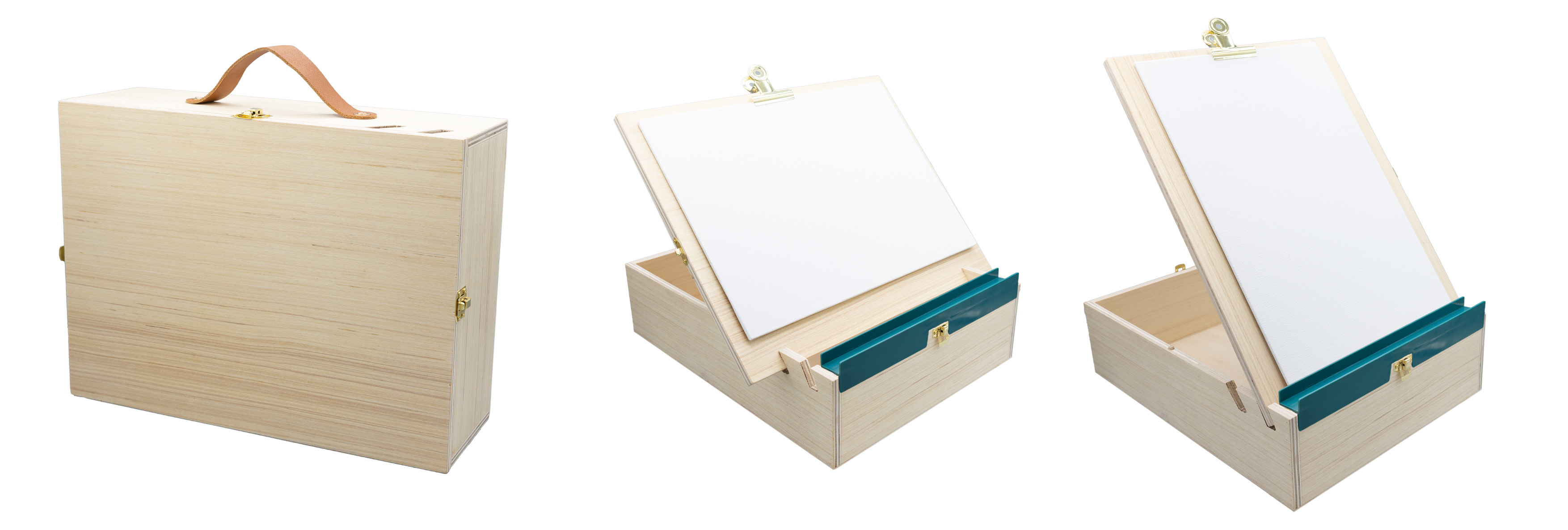 Walizkę można złożyć tak, aby stanowiła sztalugę. Pudełko ma dwa wycięcia, dzięki którym można wybrać kąt nachylenia płótna. Sztalugę można ustawić pionowo lub poziomo. Zabezpiecz arkusz papieru lub cienkie płótno dwoma dołączonymi klipsami.