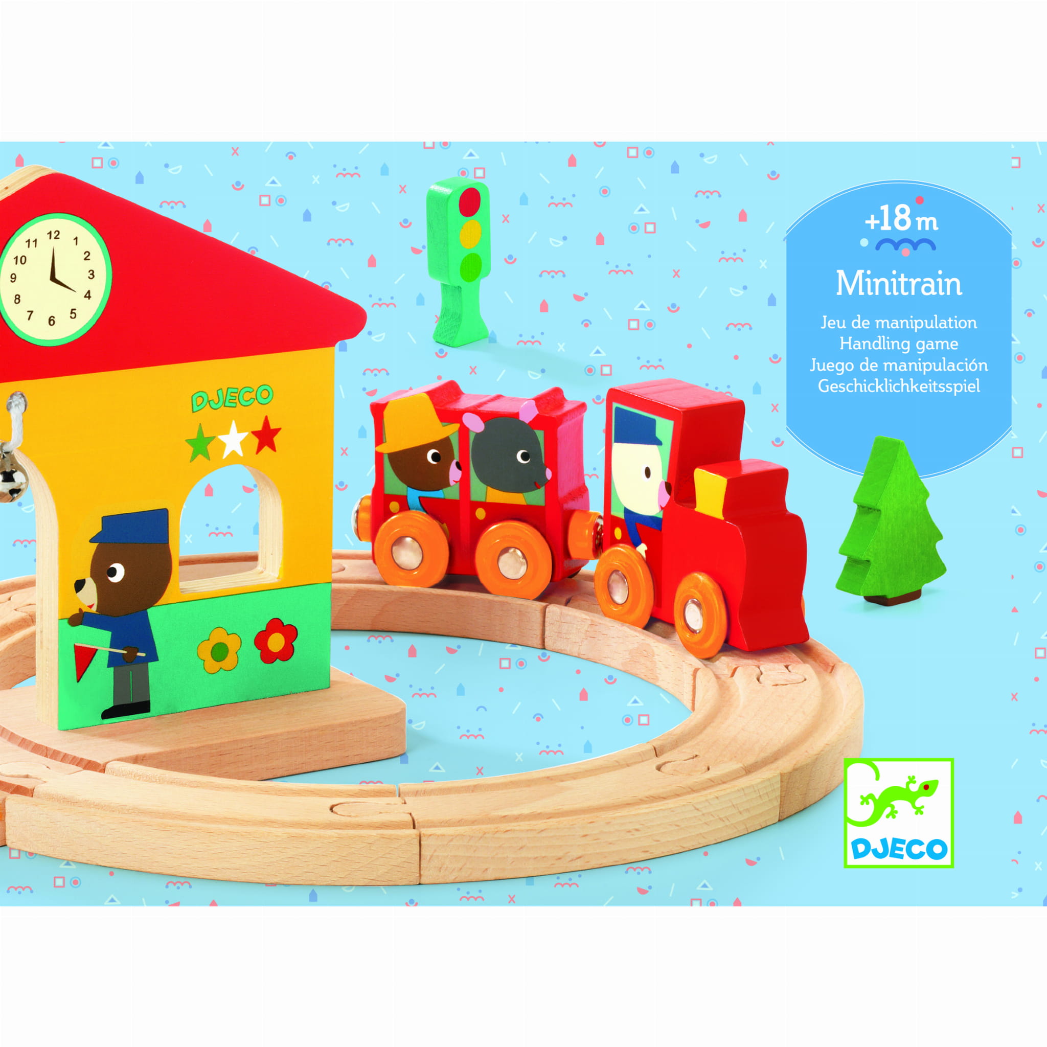 Piękny drewniany mini pociąg. Zestaw zawiera lokomotywę i wagoniki połączone ze sobą magnesami, szyny, sygnał świetlny, oraz małą stację z dzwonkiem dzwoniącym przy przejeździe pociągu. Dziecko samo decyduje w jaki sposób połączy szyny aby podróżujący dotarli do miejsca docelowego.
