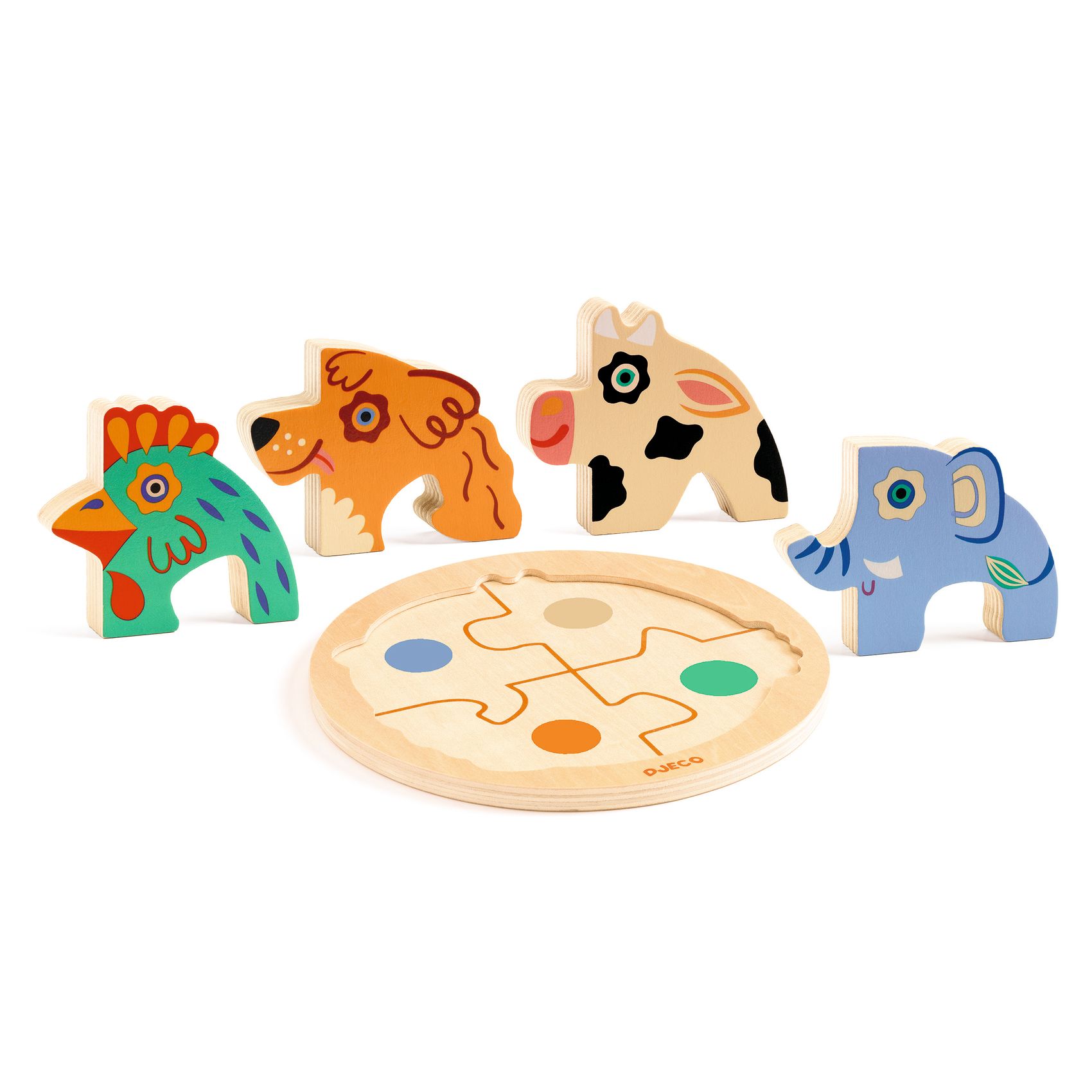Rondo Dog to zupełnie nowa forma drewnianej układanki dla maluszków. Duże elementy w formie puzzli należy ułożyć na okrągłej podstawce, tak aby tworzyły spójną kombinację. Cztery części układanki przedstawiają różne zwierzątka. Dla ułatwienia zadania na bazie do układania znajdują się kropki w kolorach, odpowiadających poszczególnym puzzlom.