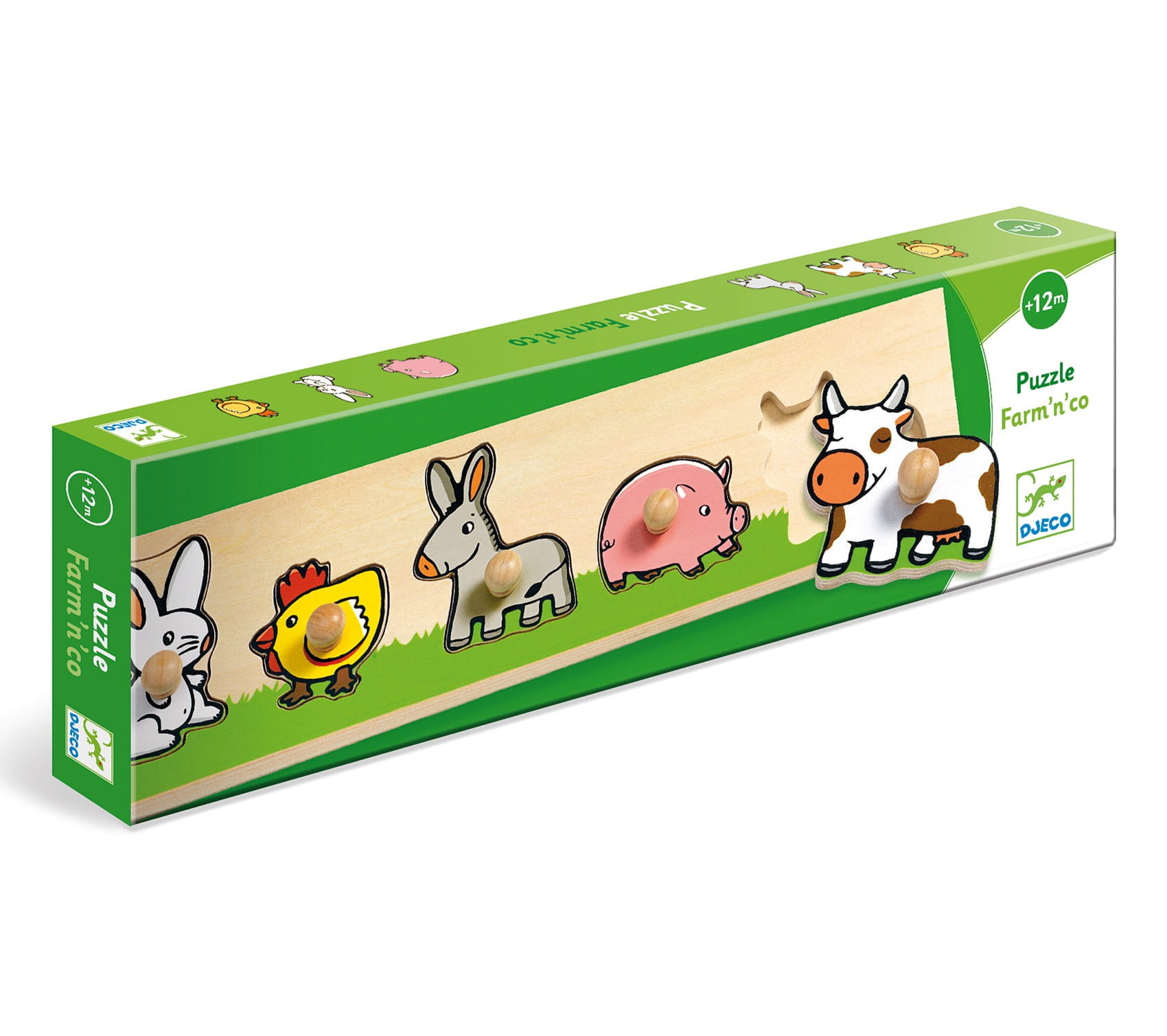 Drewniane puzzle FARMA to zestaw 5 elementów w kształcie wiejskich zwierzątek z uchwytami. Zadaniem dziecka jest dopasowanie puzzli do odpowiednich otworów w drewnianej podstawce. Zamontowane uchwyty na puzzlach są sporym ułatwieniem dla małych rączek, dzięki czemu układanka nadaje się dla dzieci już od 12. miesiąca życia. Zabawka rozwija zdolności motoryczne. Zapakowana jest w praktyczne pudełko, łatwe do przechowywania. Elementy zestawu wykonane zostały z drewna posiadającego certyfikat FSC®.