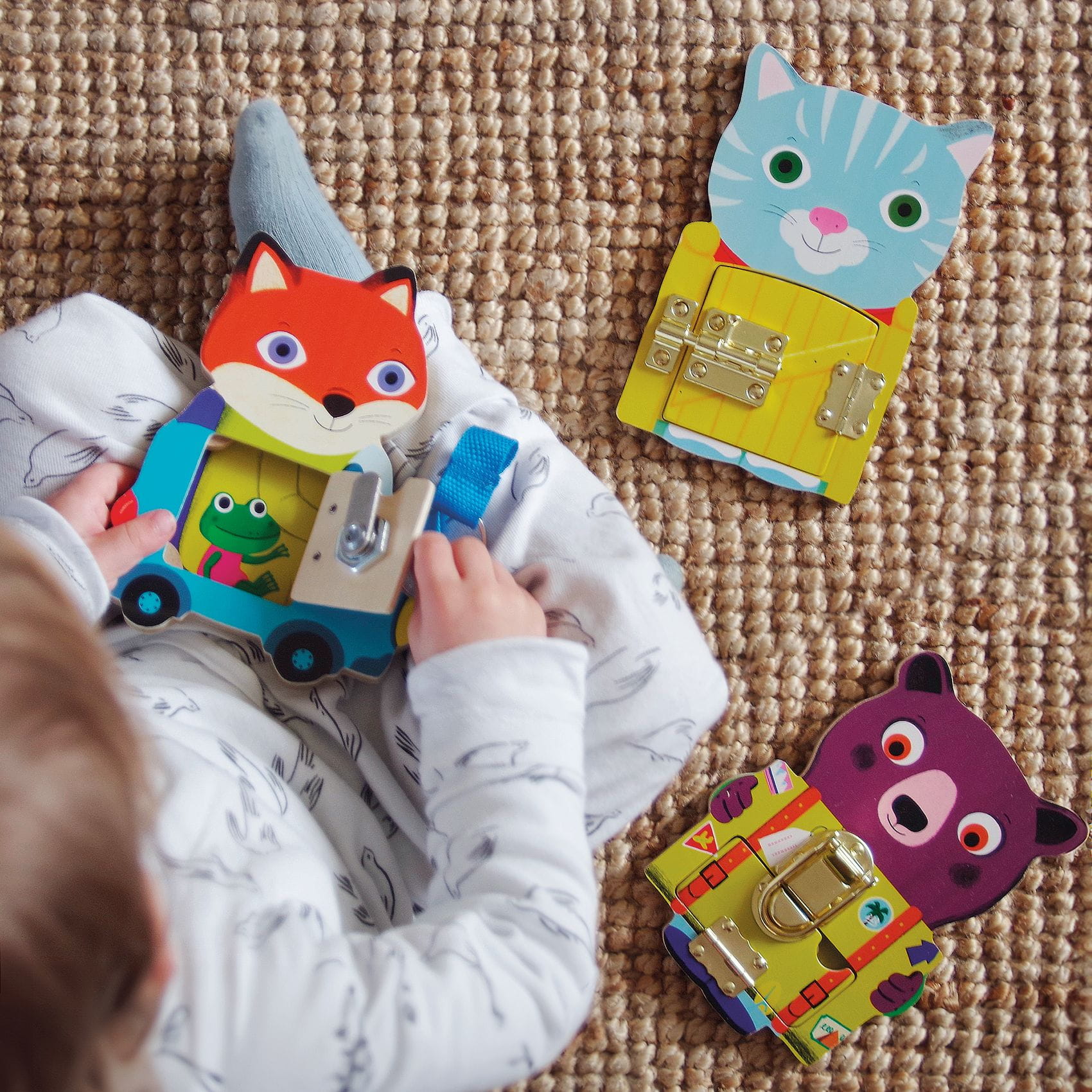 Super oryginalna drewniana gra składająca się z trzech uroczych zwierzątek ukrywających tajemnicę. Maluch będzie się dobrze bawić, otwierając drzwi każdy za pomocą innego zamka. Ta kolorowa gra edukacyjna zachęci malucha do posługiwania się małymi przedmiotami i rozwijania umiejętności motorycznych podczas zabawy.