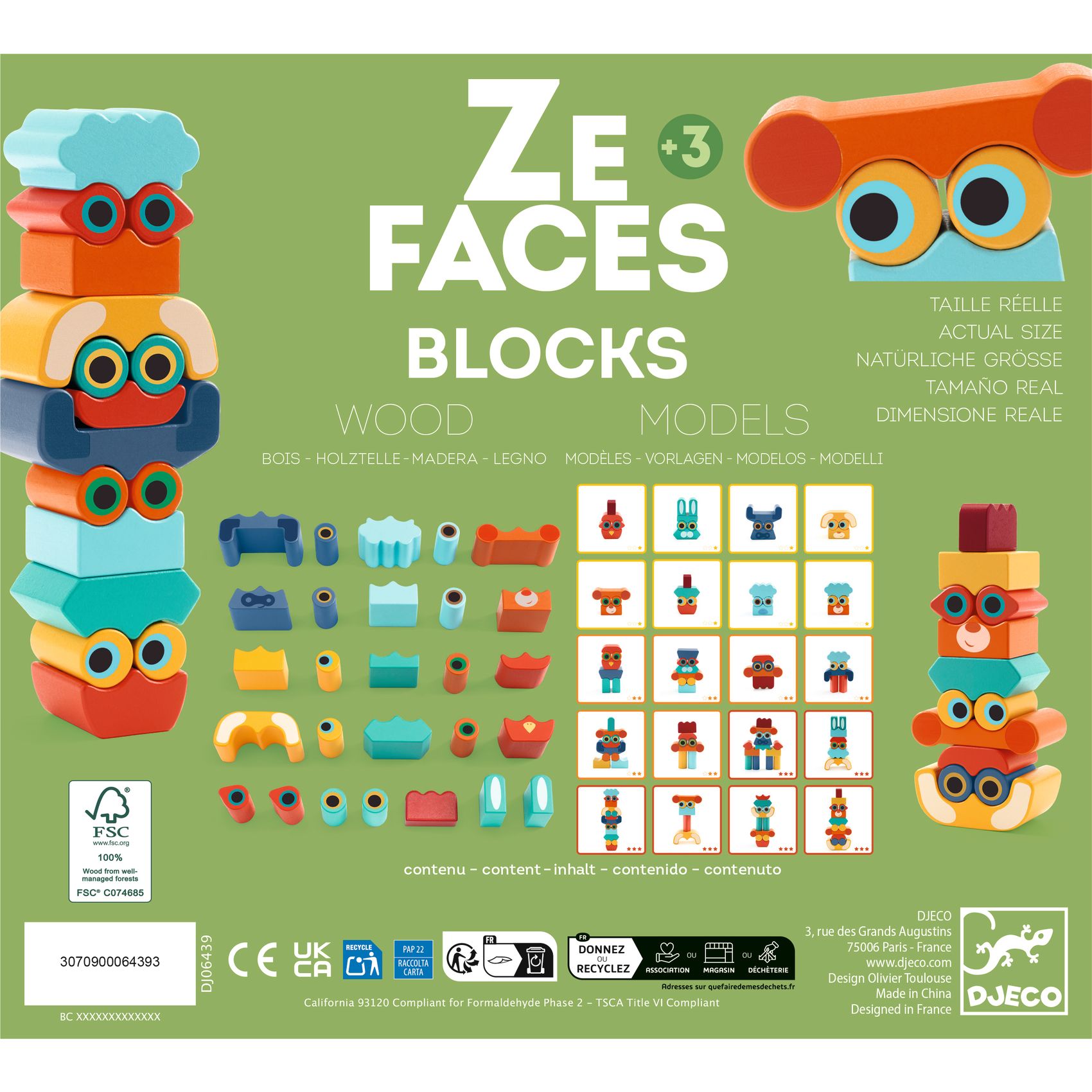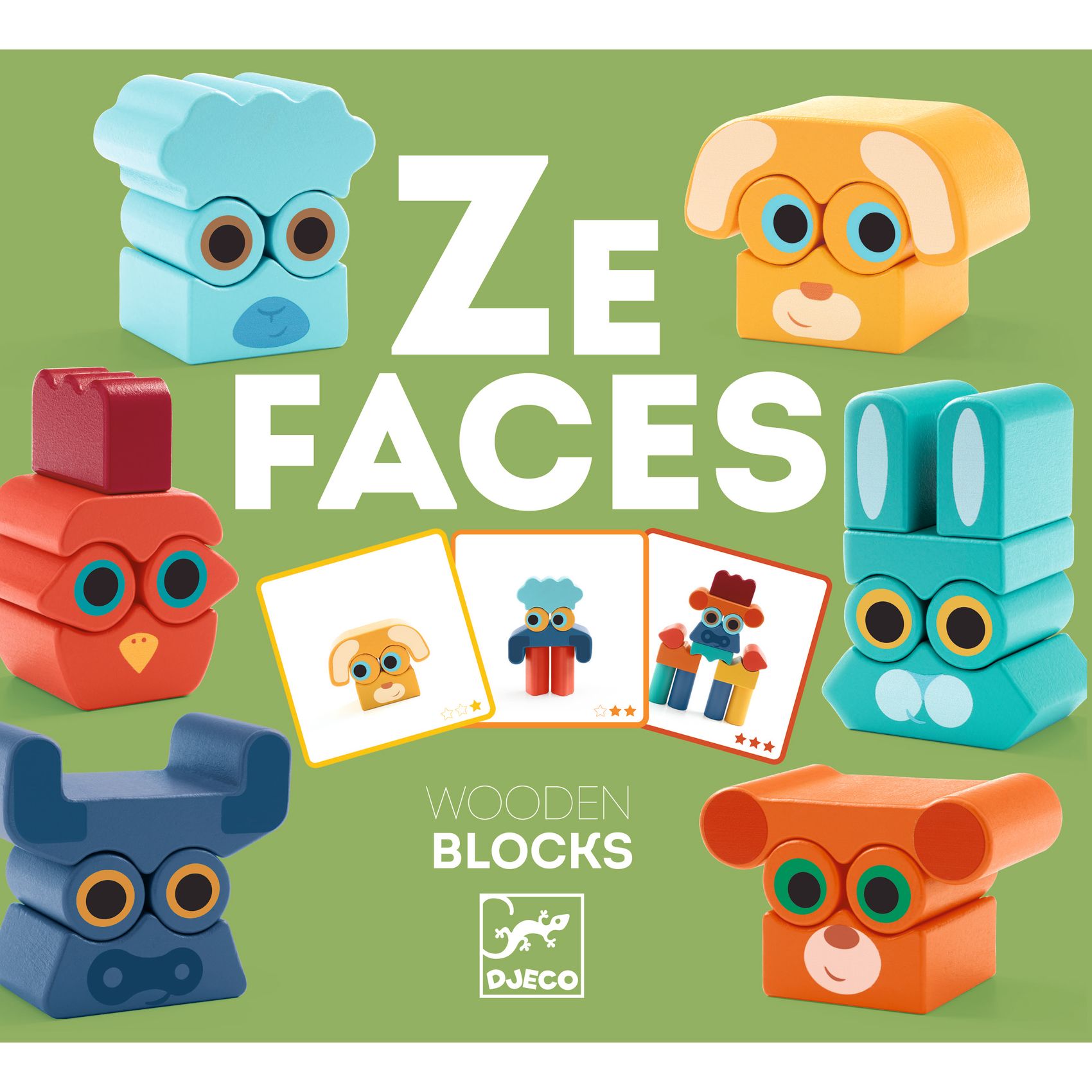 Ze Faces to gra łącząca umiejętności konstrukcyjne i wyobraźnię przestrzenną. Drewniane elementy należy ułożyć w sposób jaki pokazano na wybranej karcie modelowej. Dzieci uczą się rozpoznawania kształtów i kolorów podczas zabawy. 20 obrazków przedstawiających zwierzątka do odtworzenia posiada trzy różne poziomy trudności.