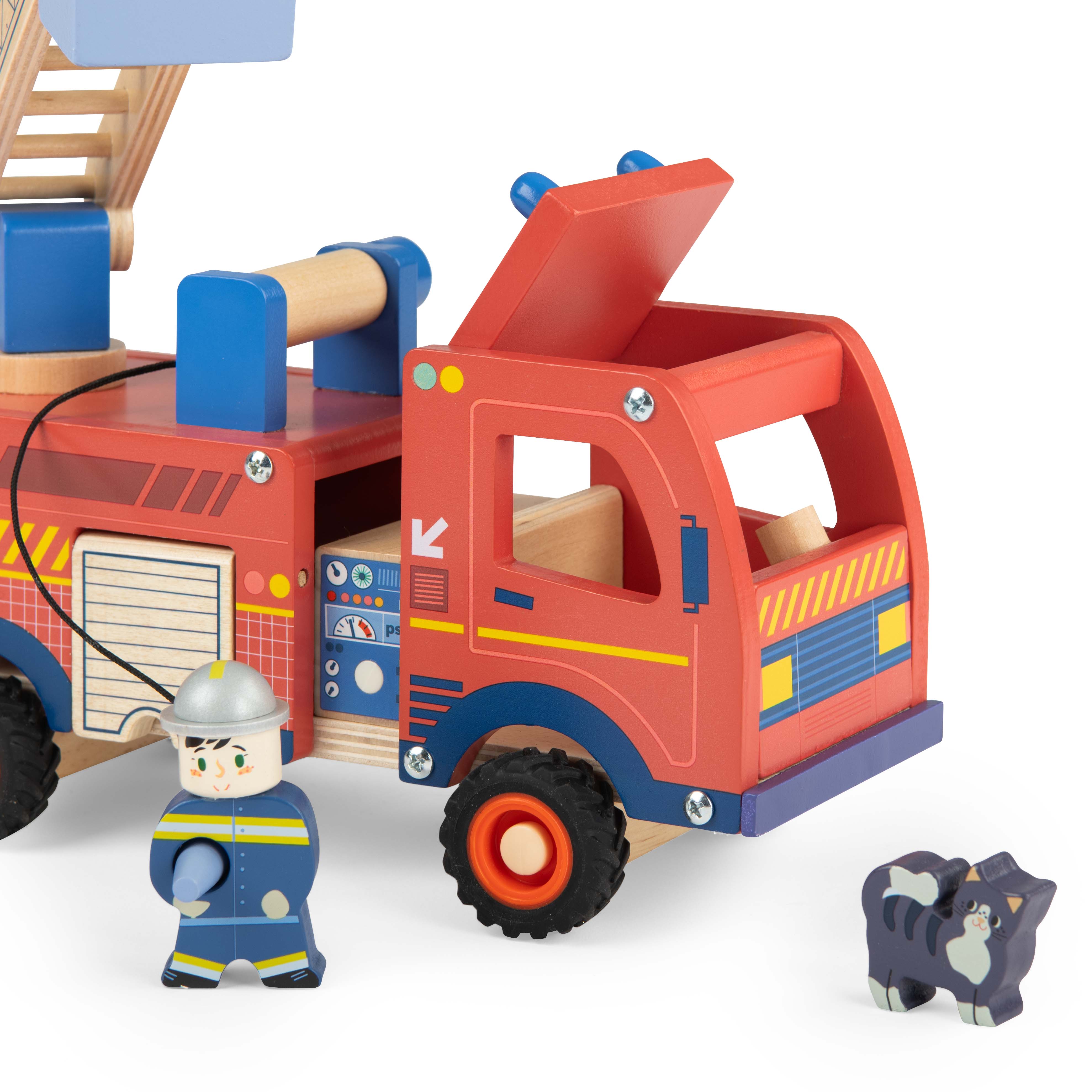 Drewniany pojazd straż pożarna z kolekcji Avenue du Moulin doskonale sprawdzi się do zabawy na role. Posiada wysoką rozkładaną drabinę z koszem oraz wąż gaśniczy. Otwierany bagażnik, pomieści wszystkie niezbędne akcesoria podczas akcji ratowniczej.