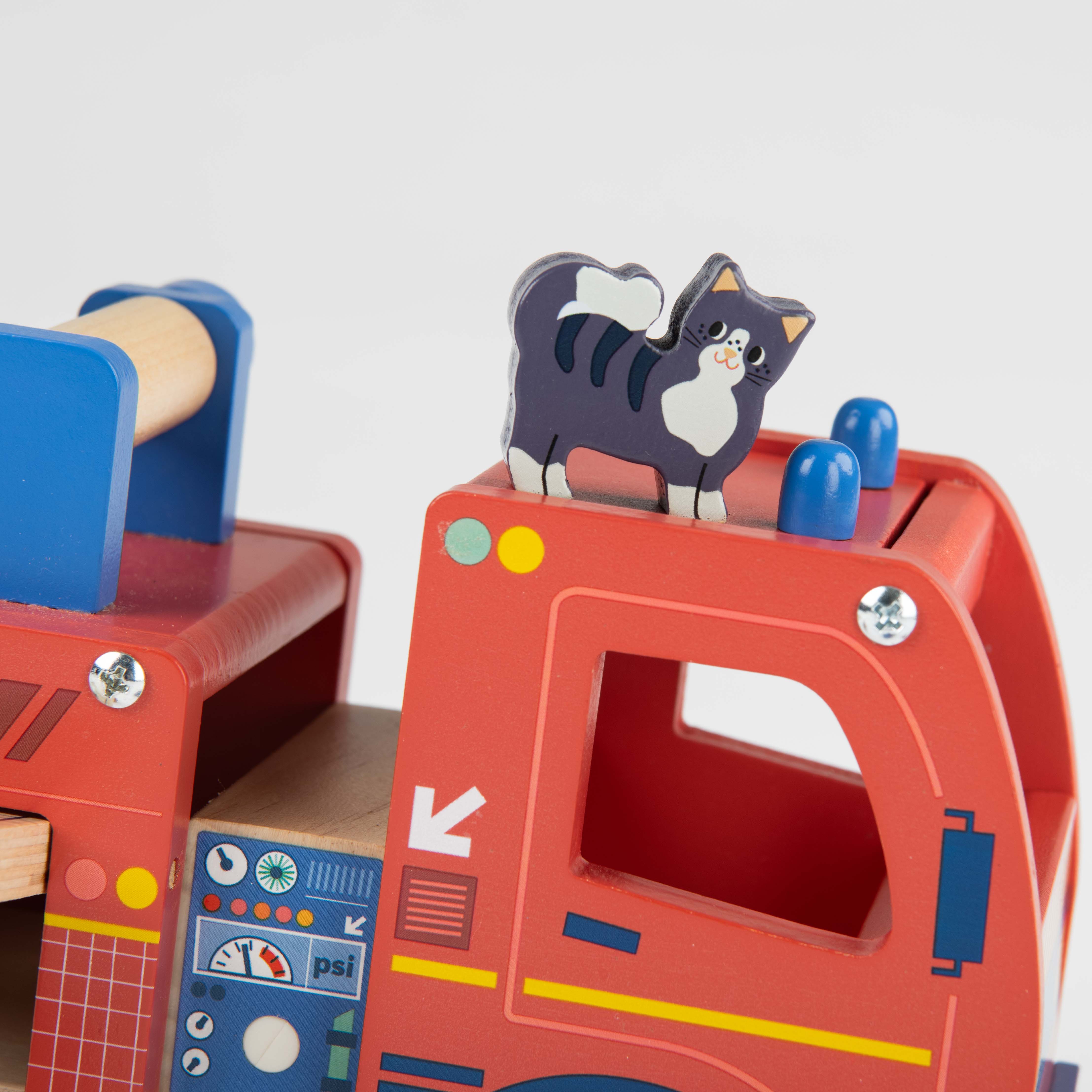 Zestaw zawiera dodatkowo 2 drewniane figurki strażaków oraz kotka, pachołek, tablicę ostrzegawczą i 2 ognie.