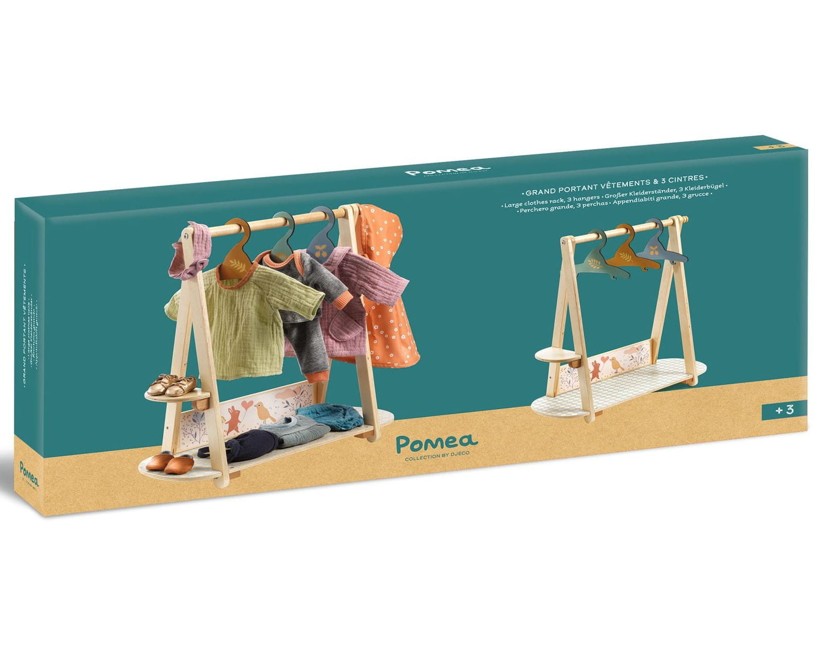 Drewniany stojak i 3 wieszaki na ubranka dla lalek z kolekcji Pomea. Wykonanyz drewna posiadającego certyfikat FSC®.