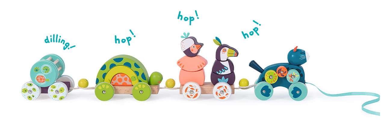Drewniany pociąg z kolekcji Dans La Jungle francuskiej firmy Moulin Roty.