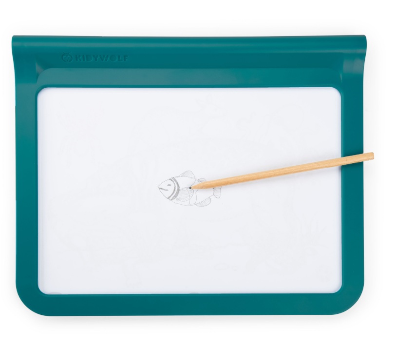 Tablet do rysowania z podświetleniem marki Kidywolf z grafikami Moulin Roty. Przeróżne zwierzątka znajdujące się na kartach ze wzorami należy podświetlić i przerysować za pomocą dołączonego rysika. Z drugiej strony tabletu znajdziemy dodatkowo czarną tablicę z neonowym podświetleniem do rysowania za pomocą załączonych mazaków.