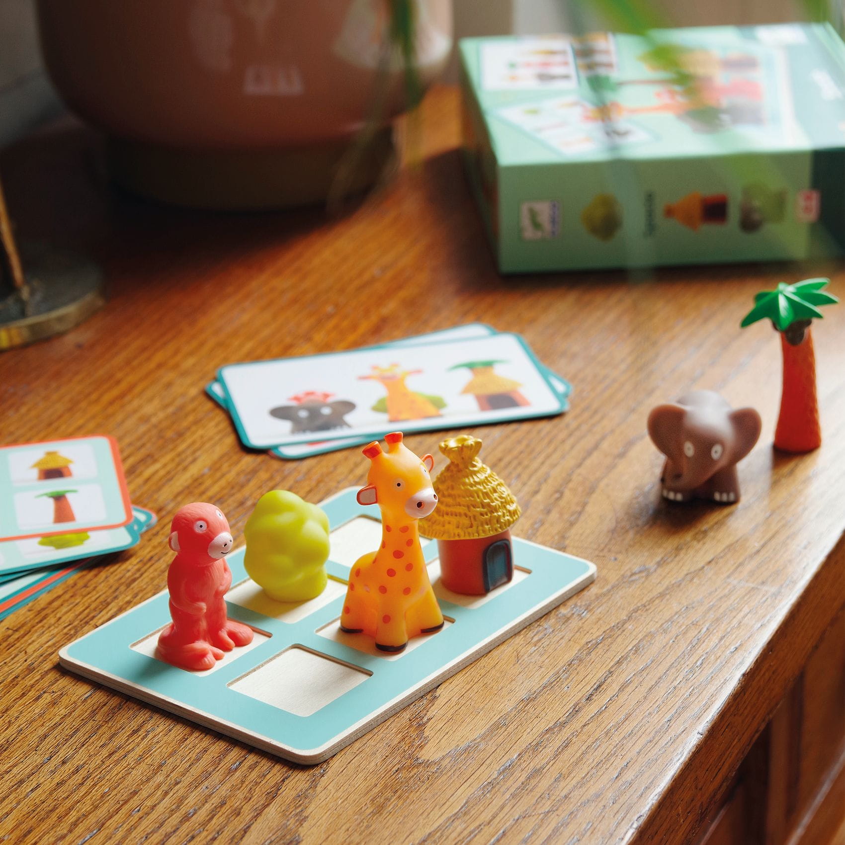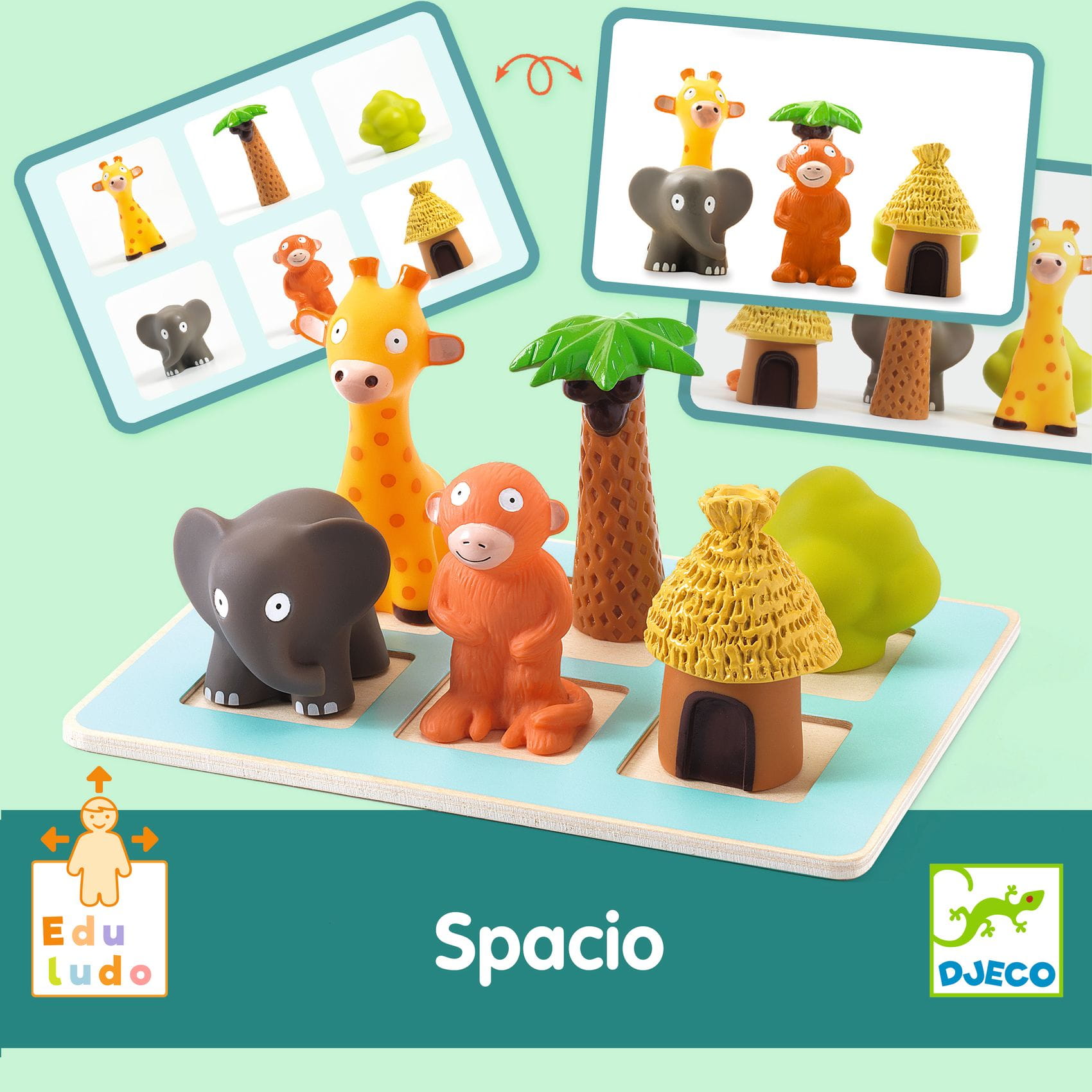 Orientacja w przestrzeni EDULUDO SPACIO to gra zawierająca 20 kart z obrazkami i 6 figurek zwierzątek oraz 1 drewnianą planszę. Aby odtworzyć schematy przedstawione na karcie, dziecko musi prawidłowo ustawić figury na planszy: Gdzie jest żyrafa? Przed słoniem czy z tyłu? Rozwiązania przedstawione jest na odwrocie kart. Jest to doskonała nauka poprzez zabawę.