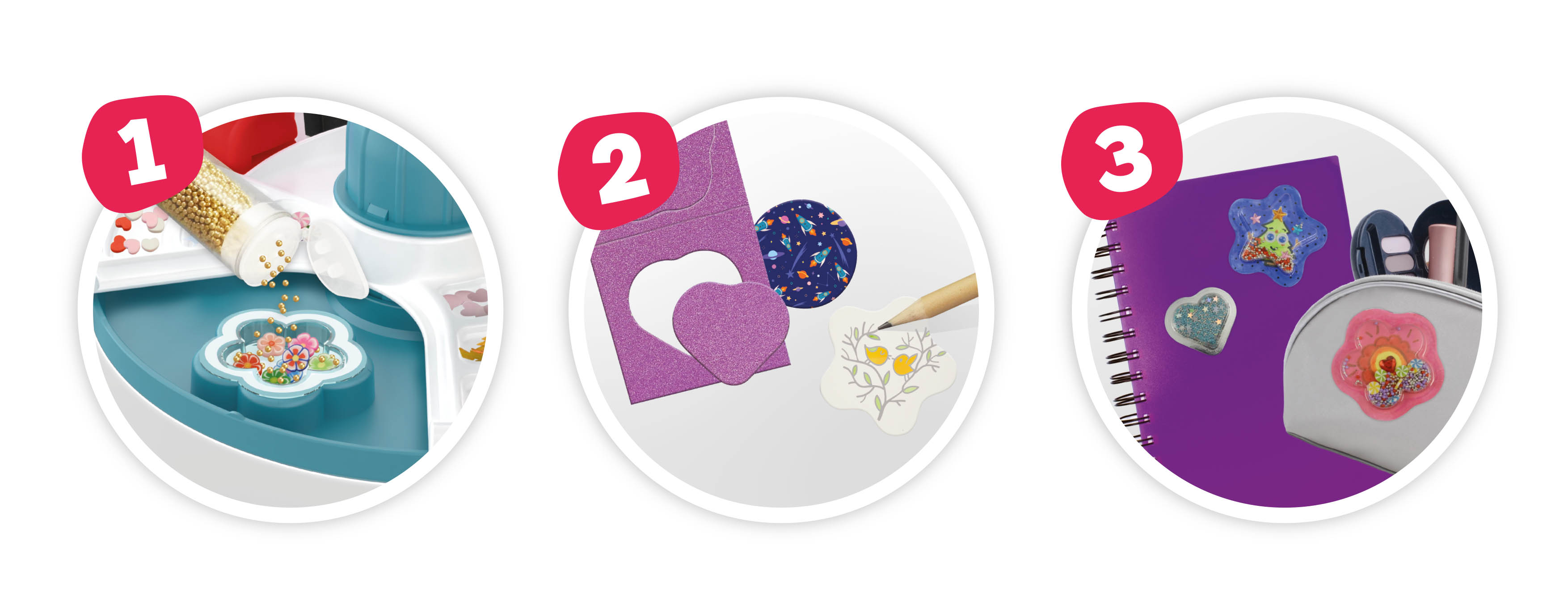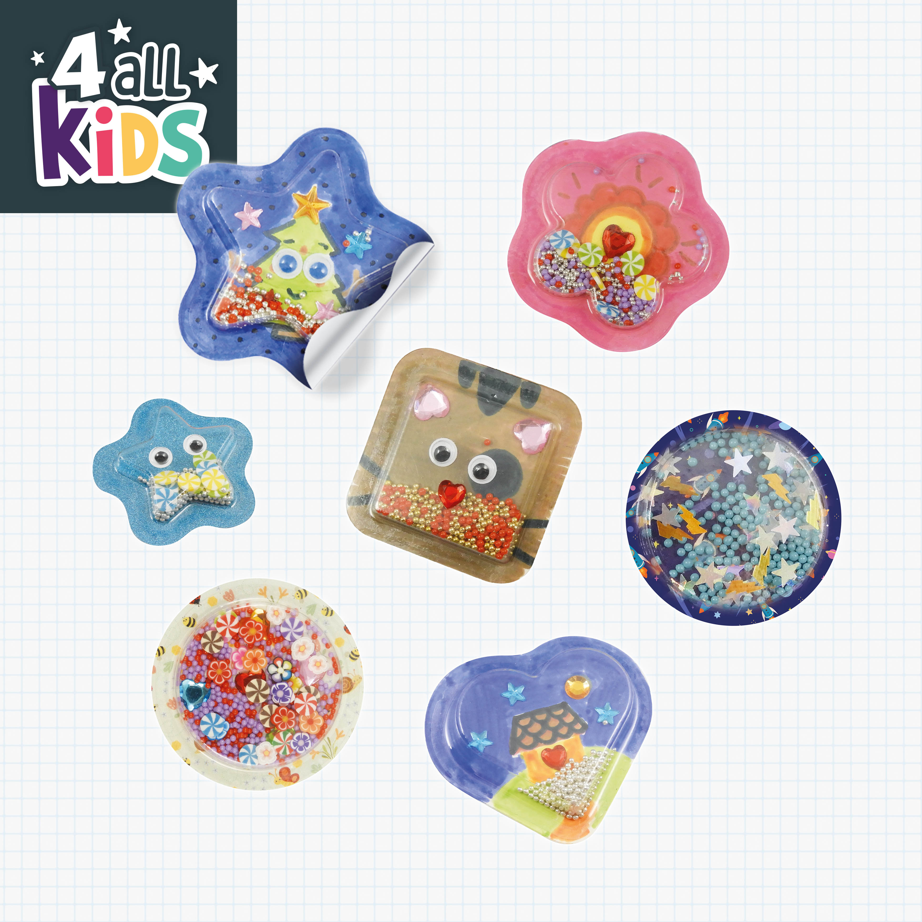 Zadanie polega na umieszczeniu przezroczystej osłonki na tacy i wypełnieniu ją minikoralikami, cekinami, diamencikami i samoprzylepnymi oczkami. Załączone do zestawu osłonki są różnych kształtów.