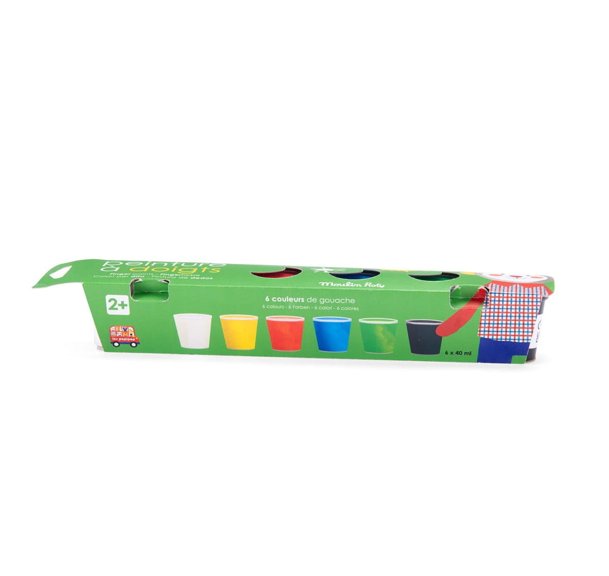 6 słoiczków z farbami do malowania palcami pobudzi kreatywność maluszków już od 2. roku życia! Wystarczy zanurzyć paluszek w farbie i przenieść ją na kartkę papieru, gdzie powstanie unikalny obrazek. Farby są bardzo łatwo zmywalne i testowane dermatologicznie. W zestawie znajduje się sześć podstawowych kolorów: biały, żółty, czerwony, zielony, niebieski i czarny.