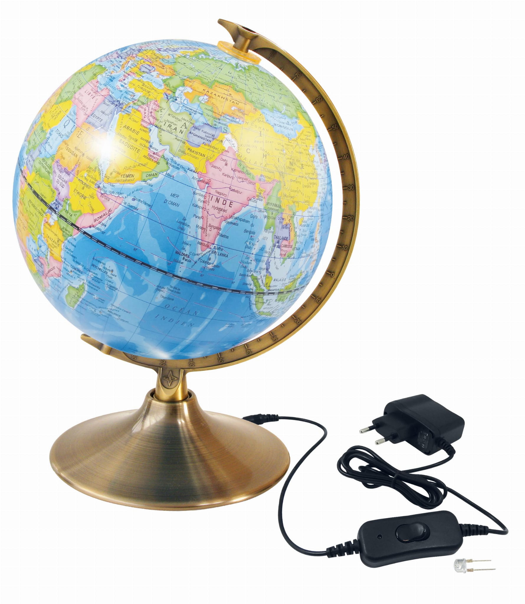 Globus o średnicy 21 cm. W ciągu dnia można wyświetlać mapę polityczną