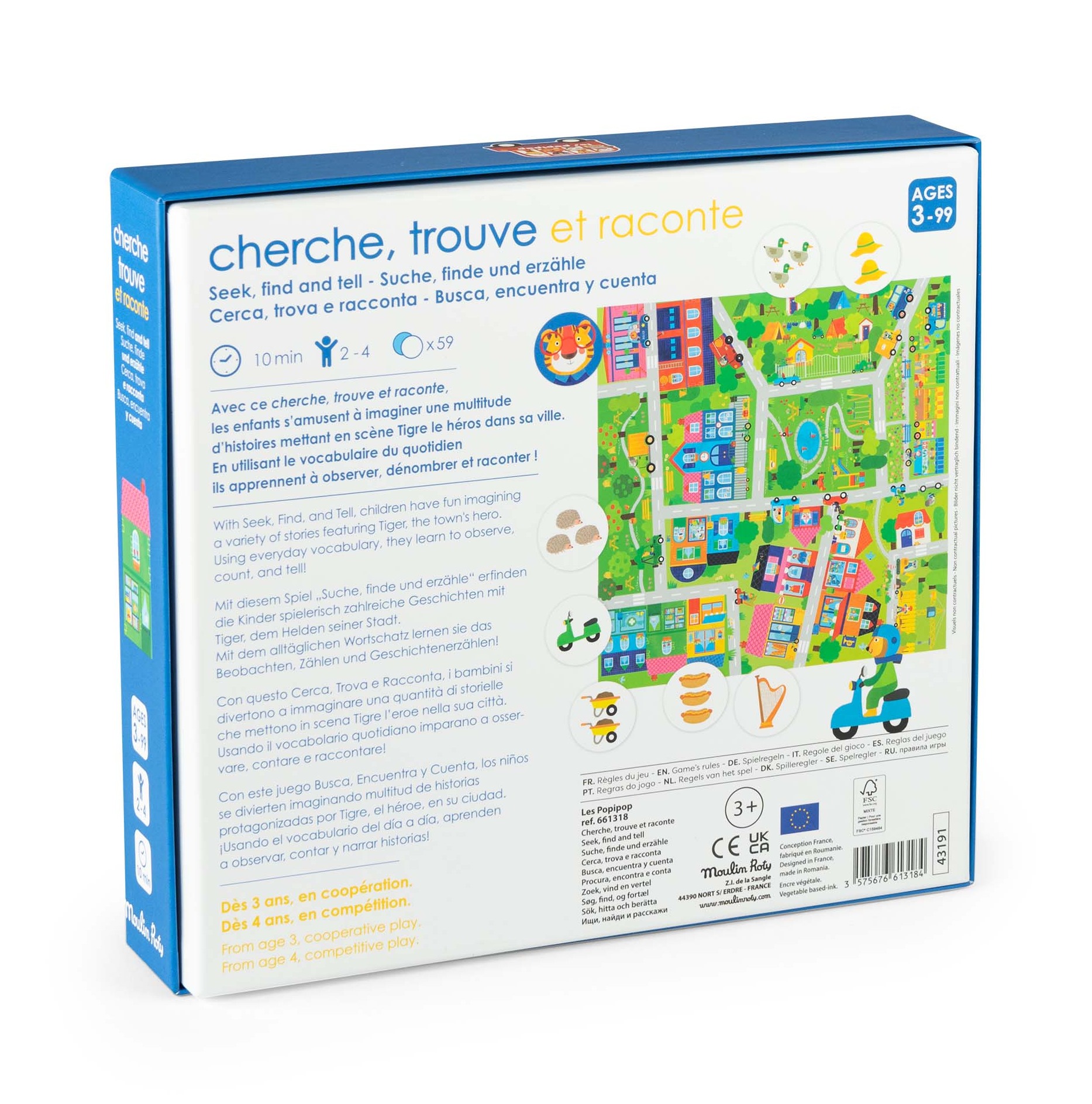 Pięknie ilustrowana gra z kolekcji Les Popipop pobudzająca wyobraźnię dzieci: bawcie się wymyślając różne historie razem z Tygryskiem lokalnym super bohaterem. Za pomocą codziennego słownictwa dzieci uczą się obserwować, liczyć i opowiadać.