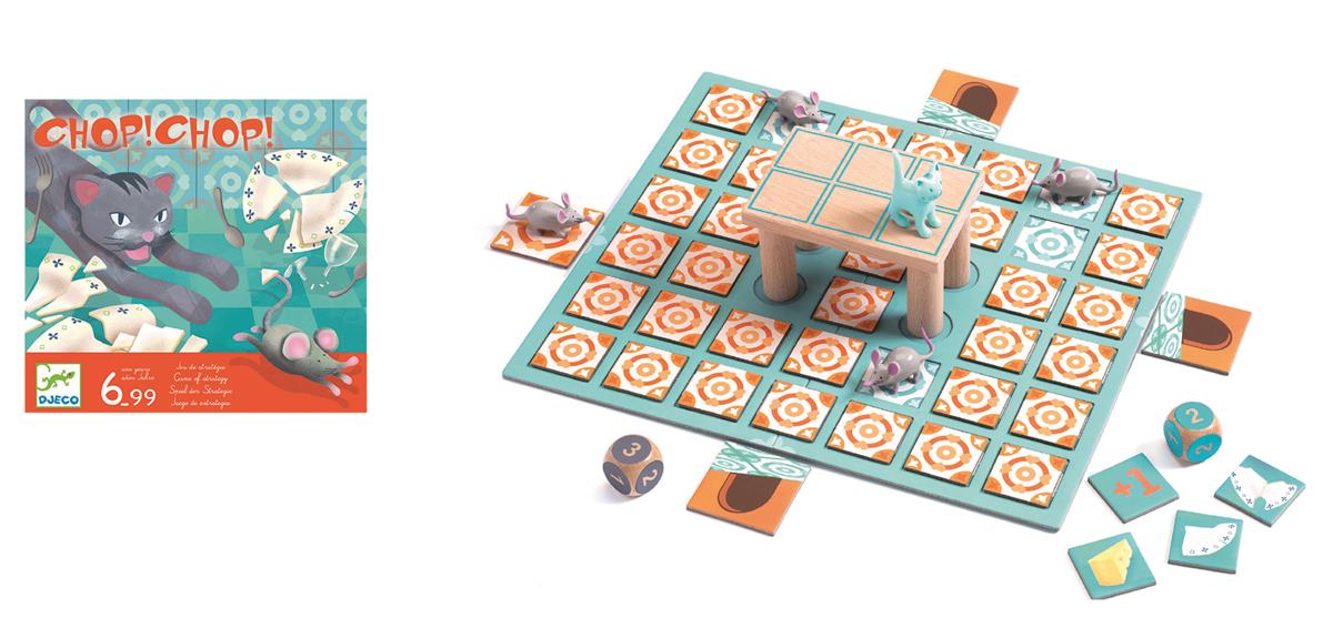 Chop Chop to strategiczna gra planszowa w której zwycięzca może być tylko jeden: myszki lub kocur. Czyja taktyka okaże się bardziej trafna? Celem myszek jest zebranie 10 kawałków sera, podczas gdy kot próbuje ich przed tym powstrzymać.
