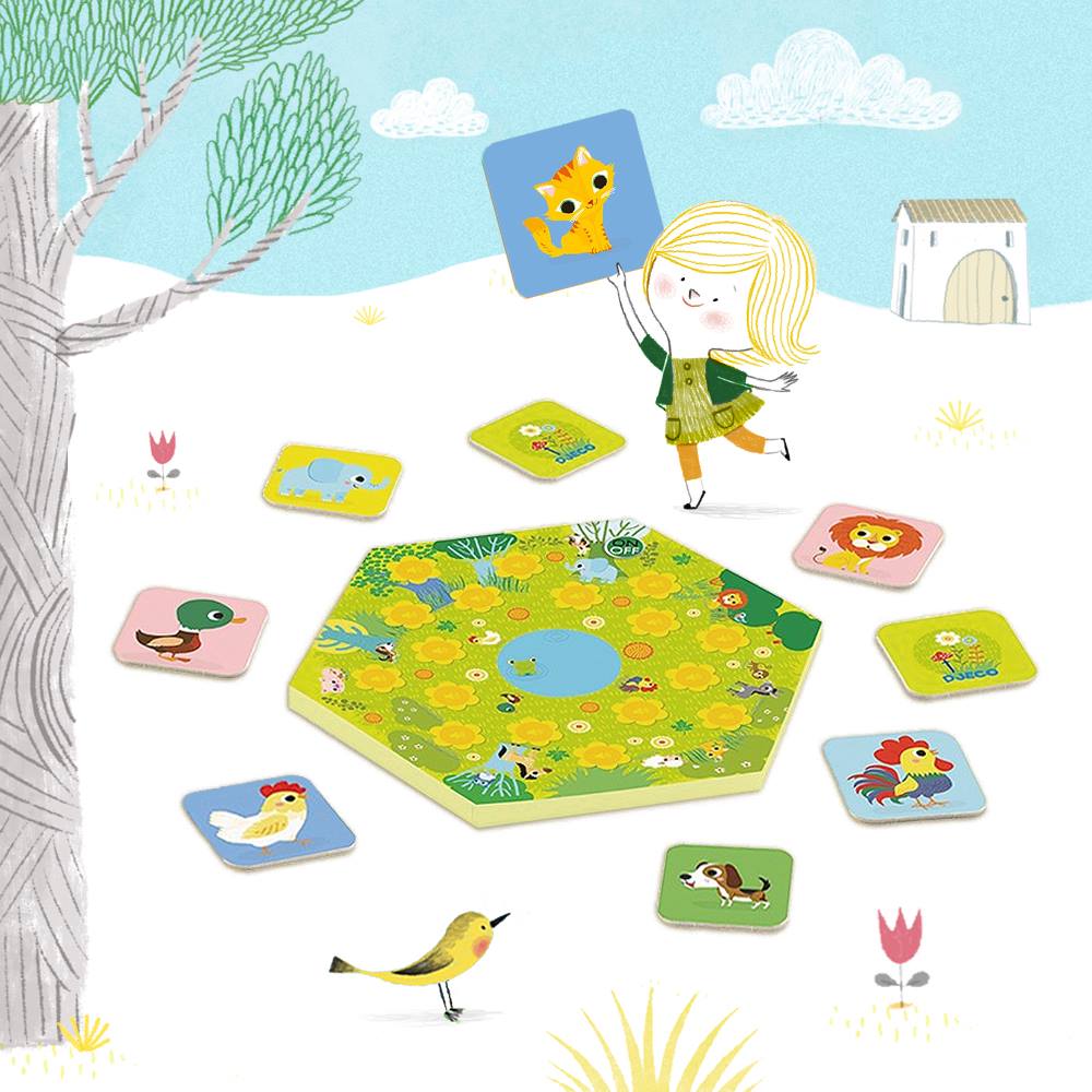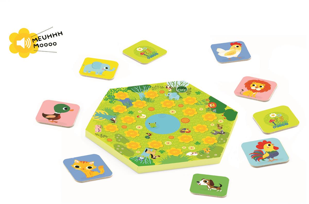 Zabawna gra dźwiękowa, ćwicząca pamięć. Plansza do gry posiada pola wydające dźwięki zwierząt. Gracz losuje kartę ze zwierzątkiem i próbuje odnaleźć pole z pasującym dźwiękiem, naciskając na nie. Jeśli trafi, przykrywa to pole czerwonym żetonem. Jeśli nie uda się odnaleźć właściwego pola, kolejka przechodzi na następnego gracza, a kartę należy odłożyć zakrytą na miejsce.