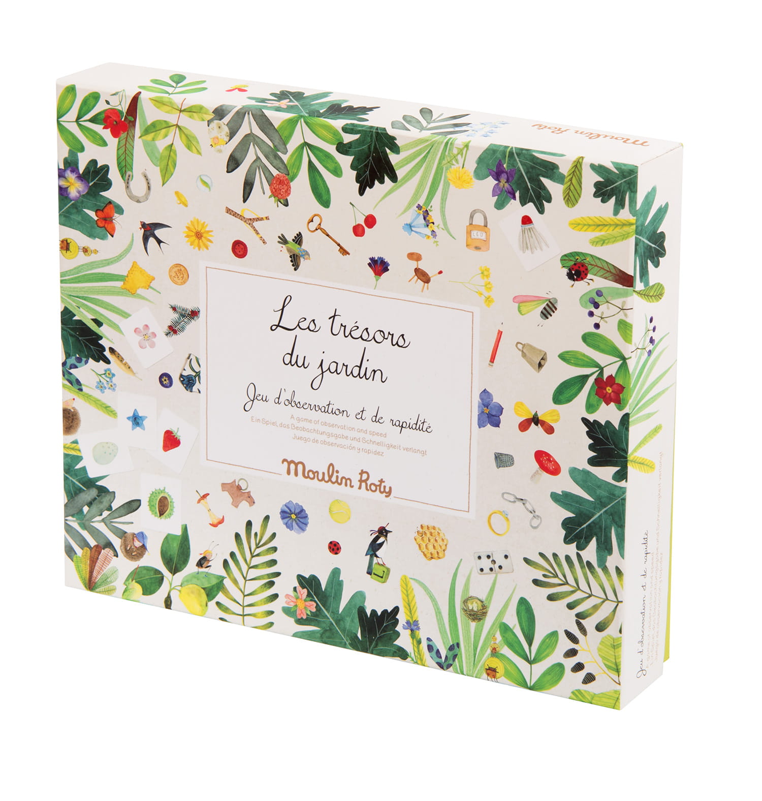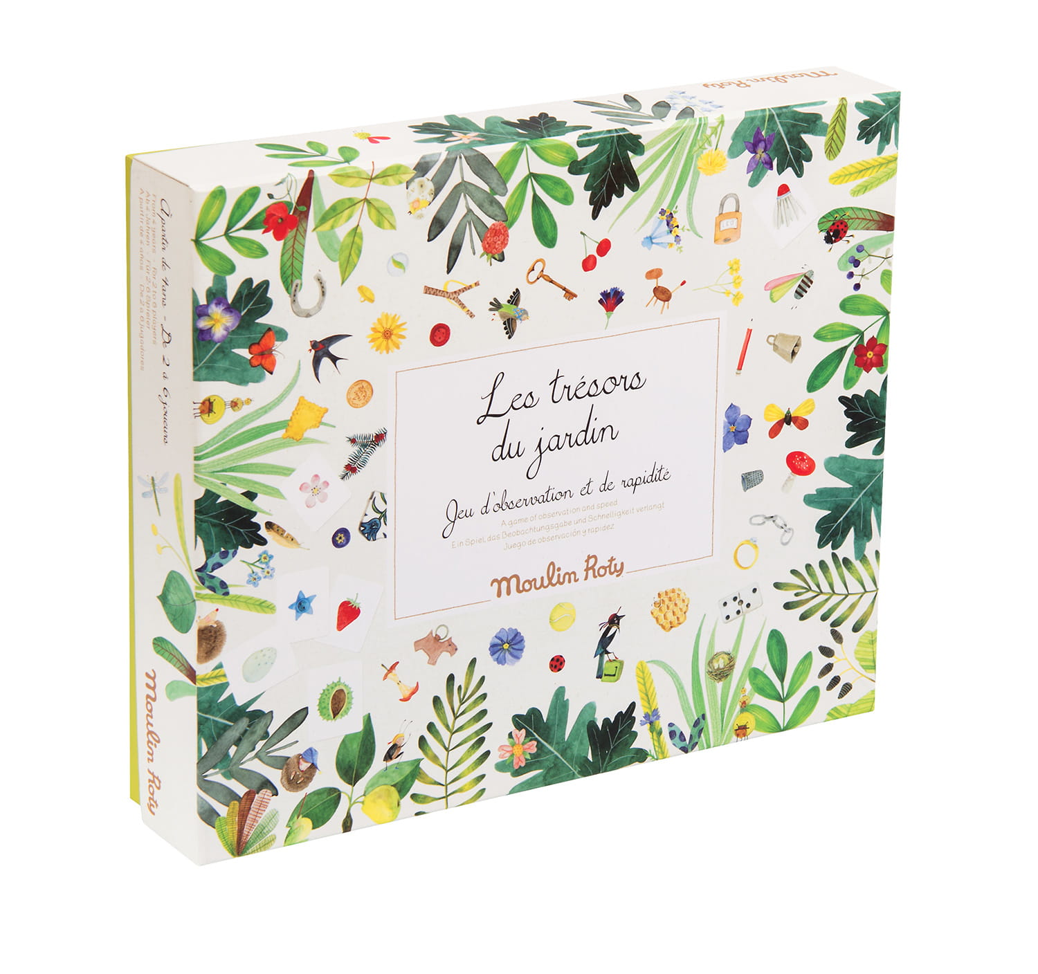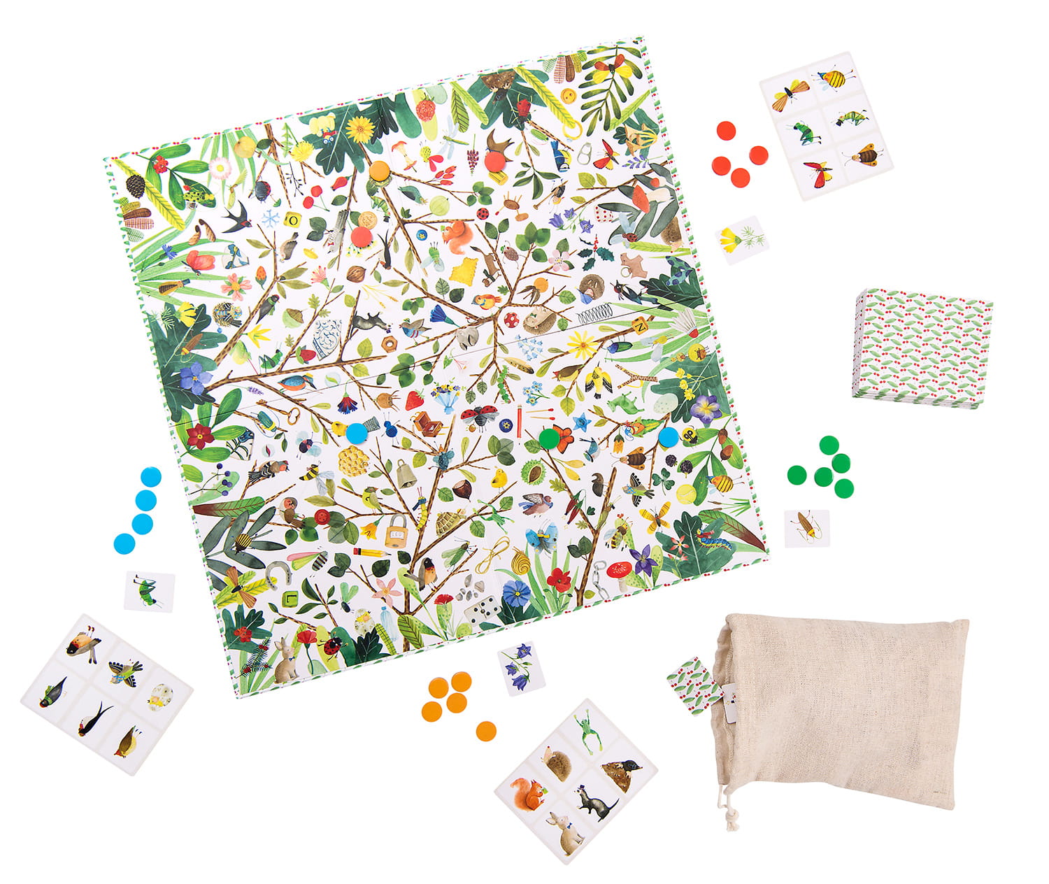 Piękna gra obserwacji i szybkości z ilustracją natury. Dziecko nauczy się rozpoznawać różne elementy ogrodu lub lasu. Gra zawiera planszę przedstawiającą świat natury: liście, ptaki, owady, gałązki, motyle ... W pudełku znajdują się 24 kolorowe pionki, 24 plansze z 6 rysunkami, 200 małych ilustrowanych kart i torbę z tkaniny.