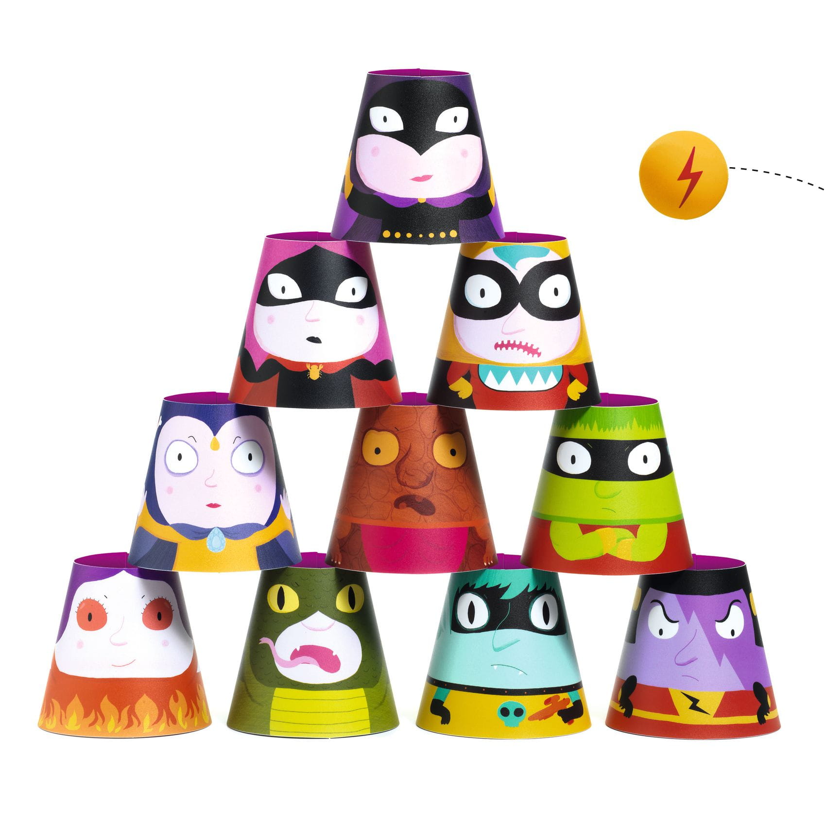 Klasyczna gra zręcznościowa w wersji od Djeco, która polega na strącaniu kubeczków, dołączoną do zestawu piłką. Świetna zabawa dla całej rodziny. Proste zasady zachęcą do zabawy nawet najmłodsze dzieci. Wystarczy ułożyć kubeczki do góry dnem w kształt piramidy i próbować strącić jak największą ilość w jak najmniejszej liczbie rzutów. Kubeczki są ilustrowane wizerunkami zabawnych postaci.