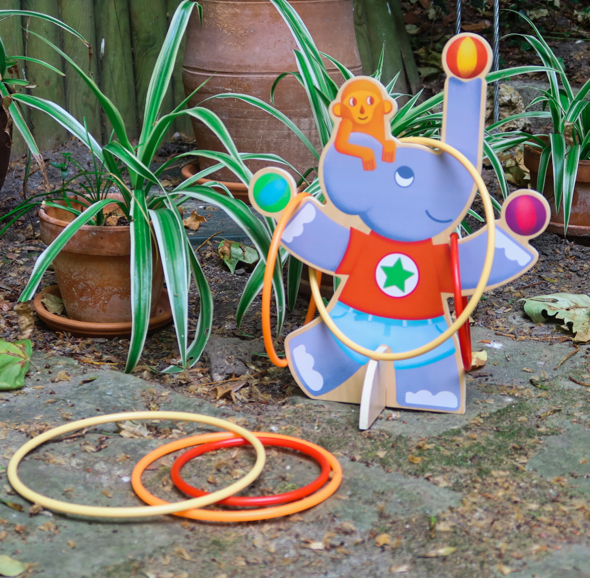 Zawartość: 1 drewniany cel w kształcie słonika (wysokość: 36 cm), 6 kolorowych plastikowych obręczy (2 x 21 cm/ 2 x 17 cm/ 2 x 13 cm), 1 bawełniany woreczek do przechowywania