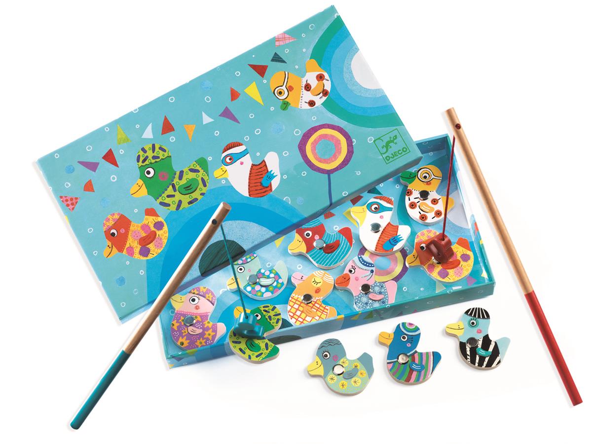 kolorowe kaczuszki oraz 2 wędki z magnesem. Kaczuszki należy "złowić" na wędkę.