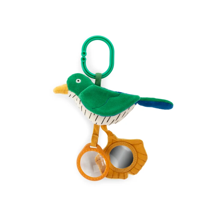 Interaktywna przywieszka z pluszowym ptaszkiem z kolekcji La Foret Mawa zaciekawi każdego maluszka. Posiada dzwoneczek, lusterko i powiększający pryzmat. Żywe kolory pobudzą ciekawość dzieci. Zabawkę można przypiąć do wózka, fotelika lub łóżeczka.