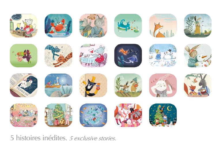 Okładkę kalendarza zdobi domek w drzewie bohaterów La Grande Famille, ozdobiony świątecznymi lampkami, które rozświetlają otaczający go las. W zaroślach kryją się leśne zwierzątka, które przyglądają się świątecznym przygotowaniom.