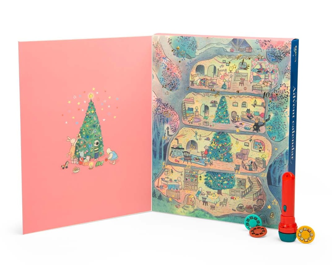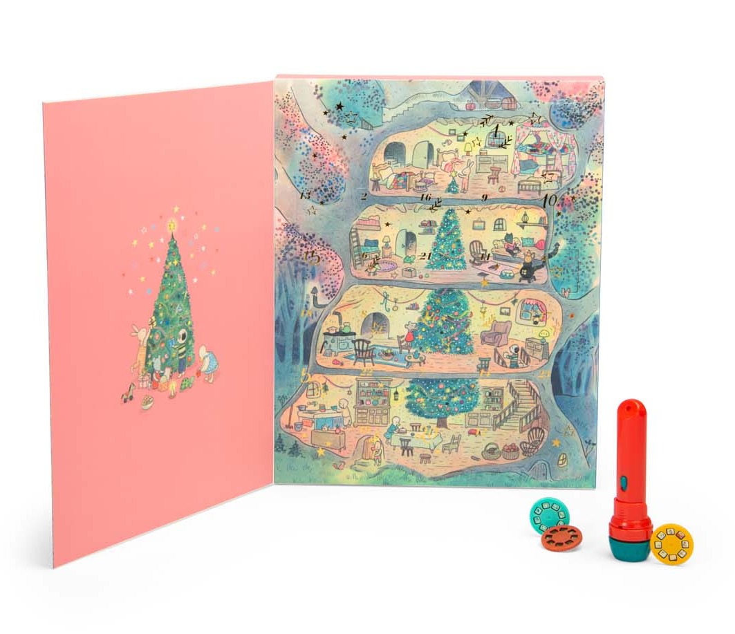 Kalendarz adwentowy pod przecudnie zdobioną okładką kryje 24 okienka do otworzenia w każdy z 24 dni poprzedzających Boże Narodzenie. W okienku nr 1 znajduje się latarka projektor, a w kolejnych znajdują się krążki z bajkami.