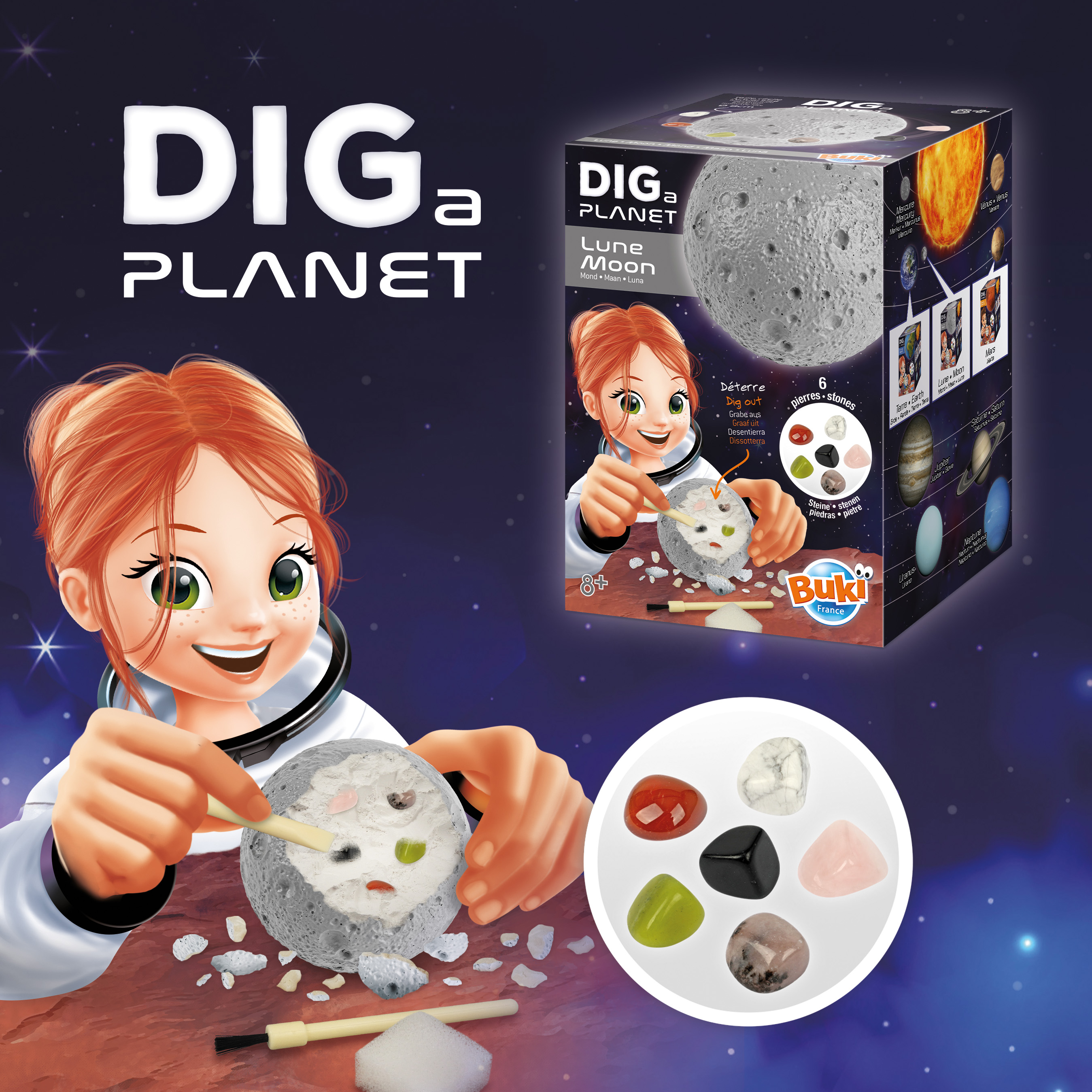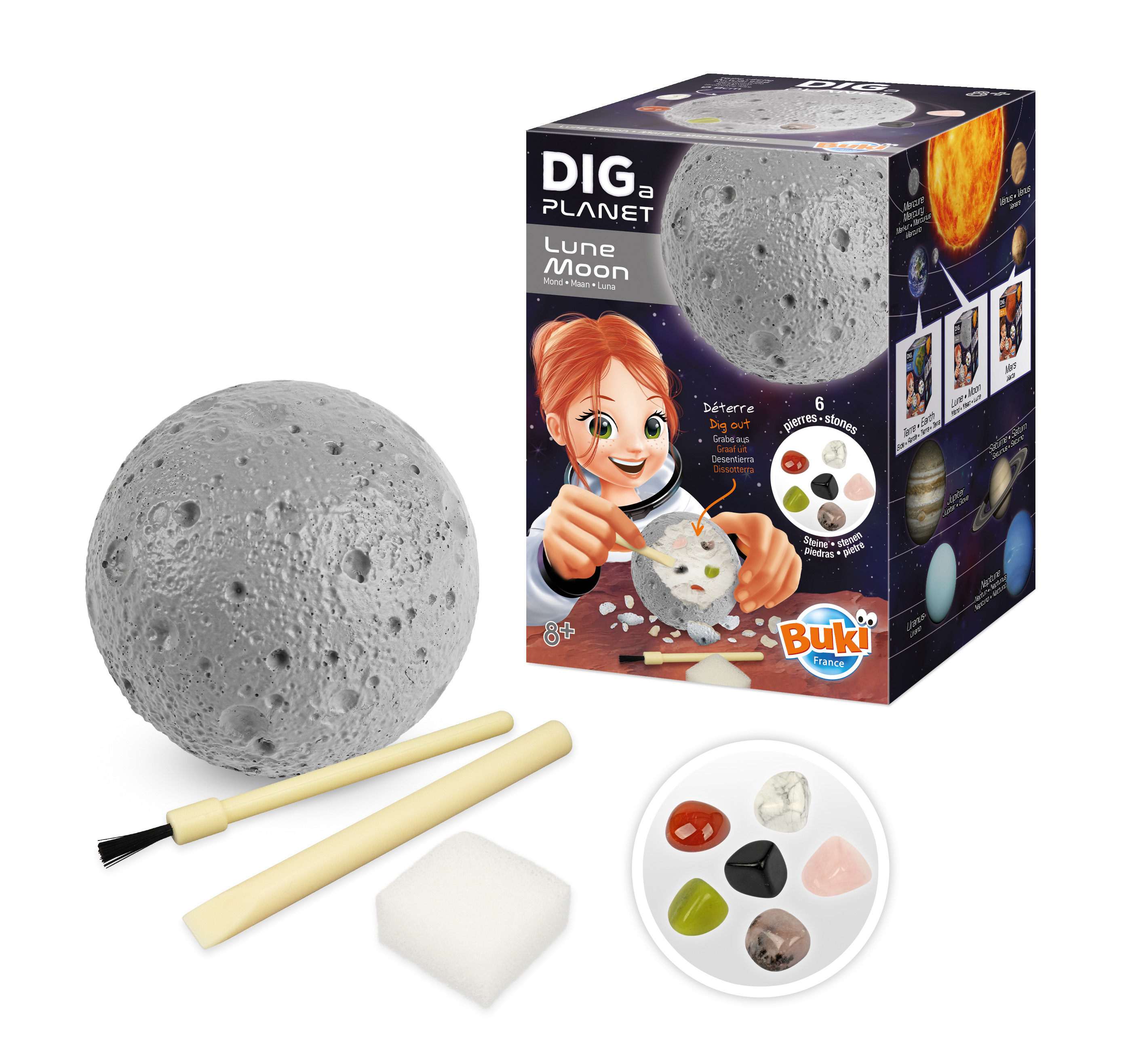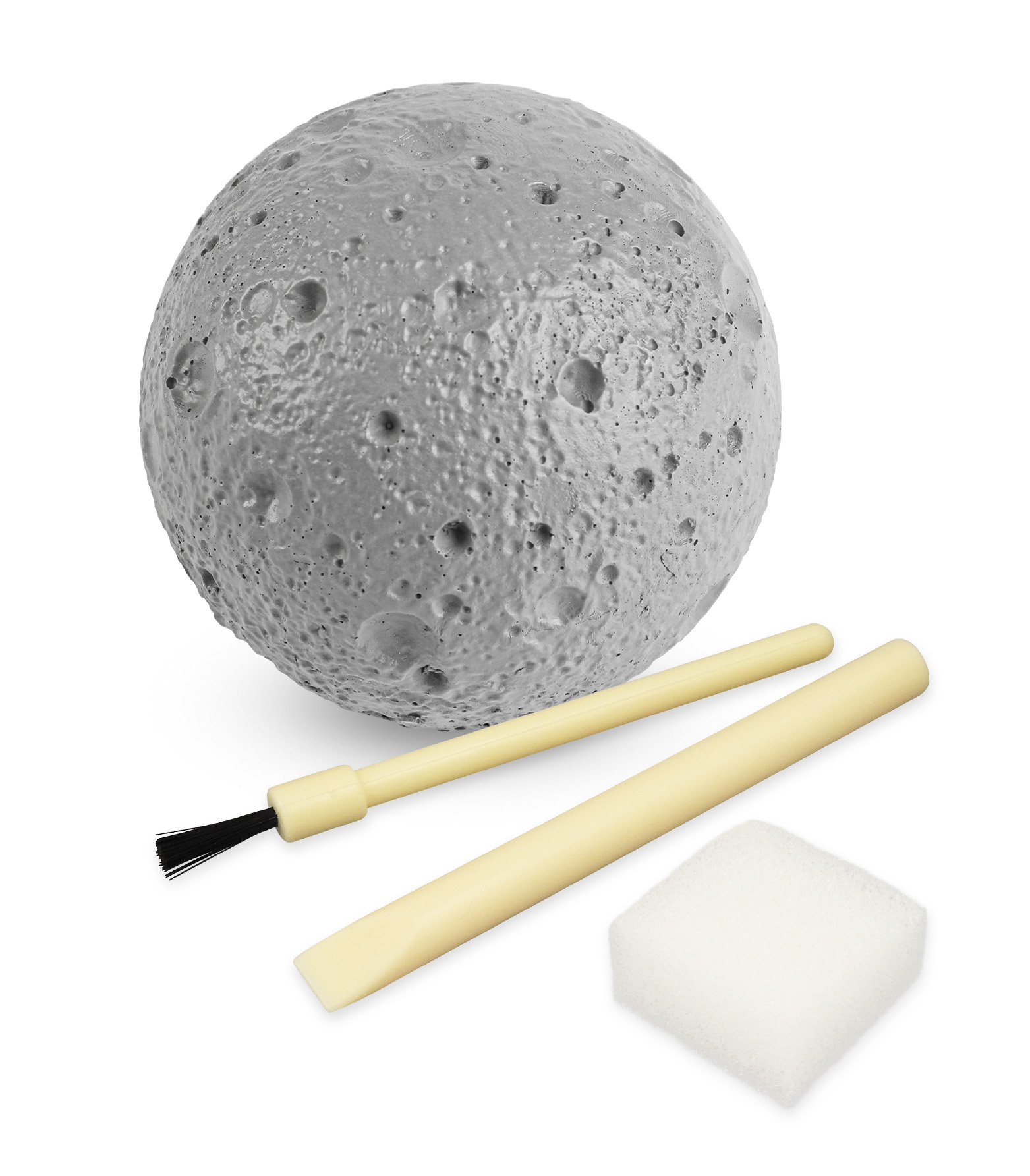 Rozpoczęły się prawdziwe kosmiczne wykopaliska! Za pomocą załączonych narzędzi należy wykopać 6 prawdziwych kamieni z gipsowej kuli imitującej Księżyc. Na odkrycie czekają między innymi howlit, karneol oraz obsydian. Wydobyte kamienie należy oczyścić z resztek gipsu załączonym pędzelkiem.