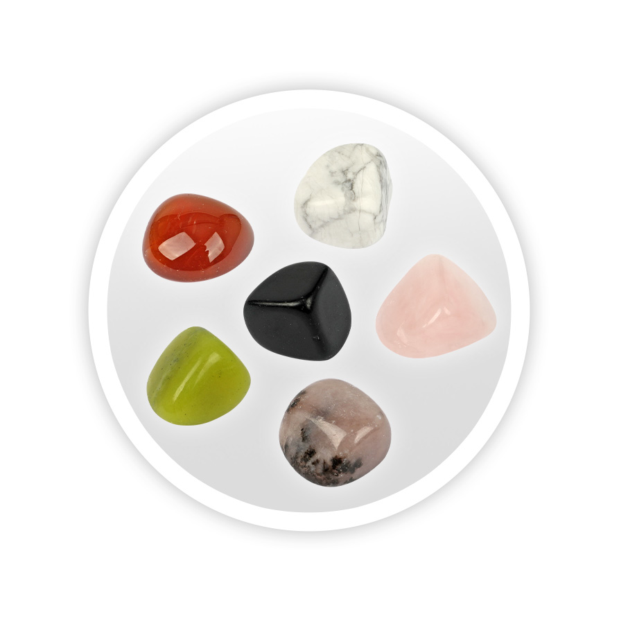 lepidolit, howlit, obsydian, nefryt, karneol),
