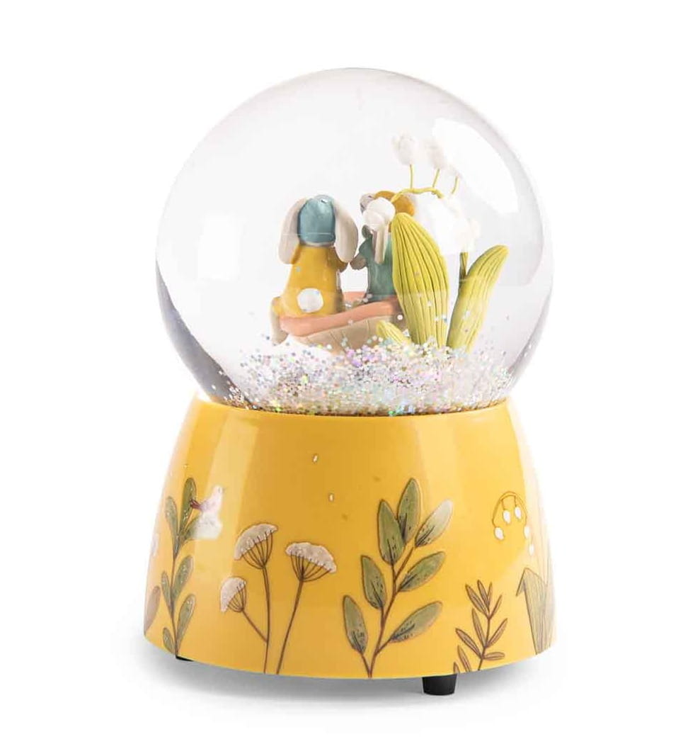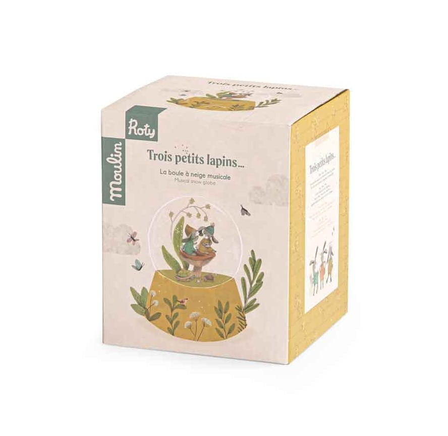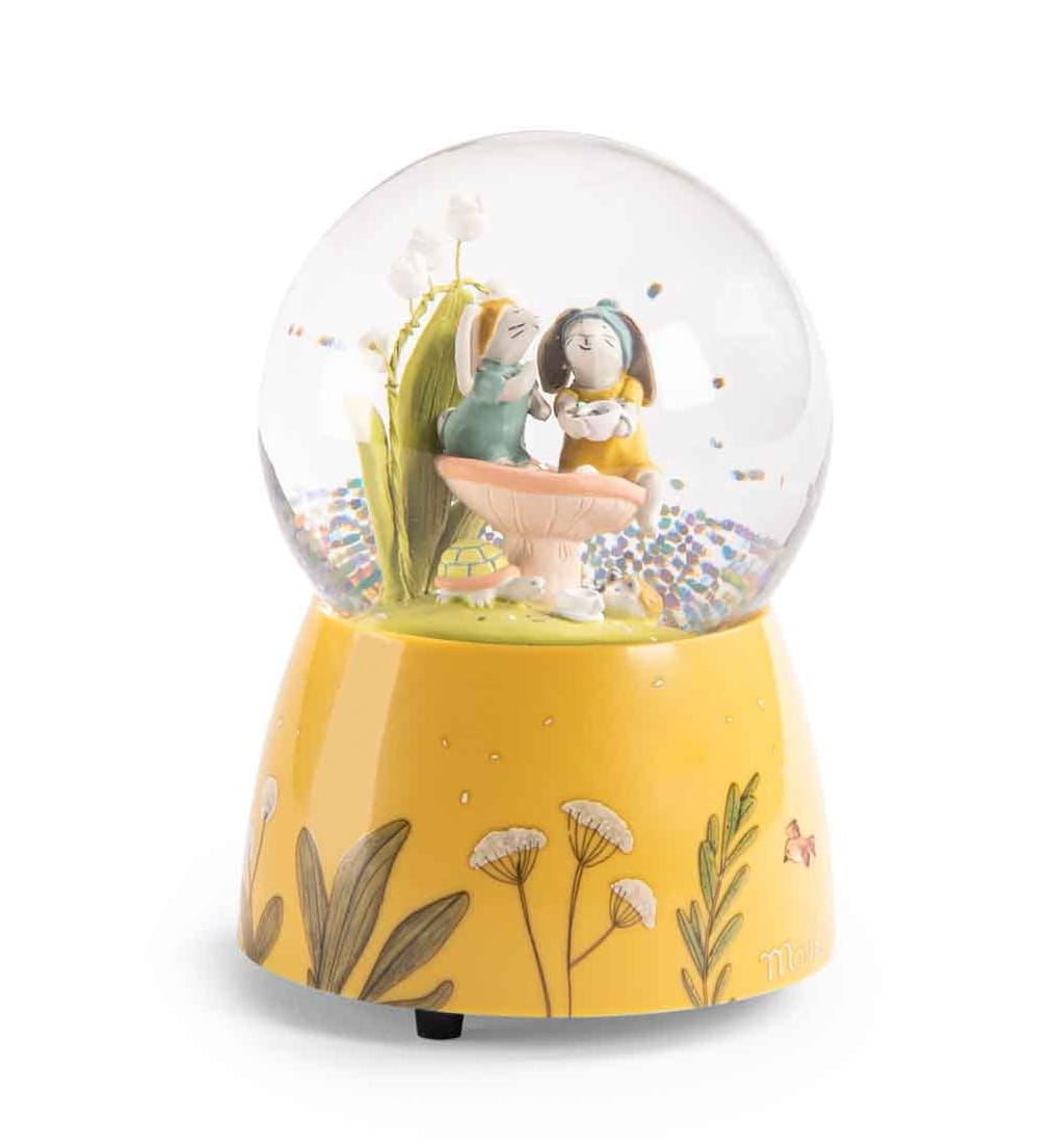 Piękna kula śnieżna w żółtych odcieniach z pozytywką z serii Trzy Małe Króliczki od Moulin Roty, oczaruje każde dziecko. W kuli pod deszczem konfetti znajdują się dwa urocze króliczki, siedzące na grzybku pod konwalią. Towarzyszą im żółwik i jeżyk. Zabawka będzie piękną ozdobą dziecięcego pokoju. Pozytywkę wprawia się w ruch poprzez nakręcenie korbki znajdującej się w podstawie kuli.