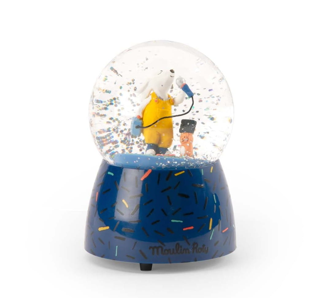 Piękna kula śnieżna w granatowym kolorze z pozytywką z serii Puce & Pilou od Moulin Roty, oczaruje każde dziecko. W kuli pod deszczem konfetti znajduje się piesek bohater kolekcji w żółtych ogrodniczkach, który daje swój niepowtarzalny koncert. Zabawka będzie piękną ozdobą dziecięcego pokoju. Pozytywkę wprawia się w ruch poprzez nakręcenie korbki znajdującej się w podstawie kuli.
