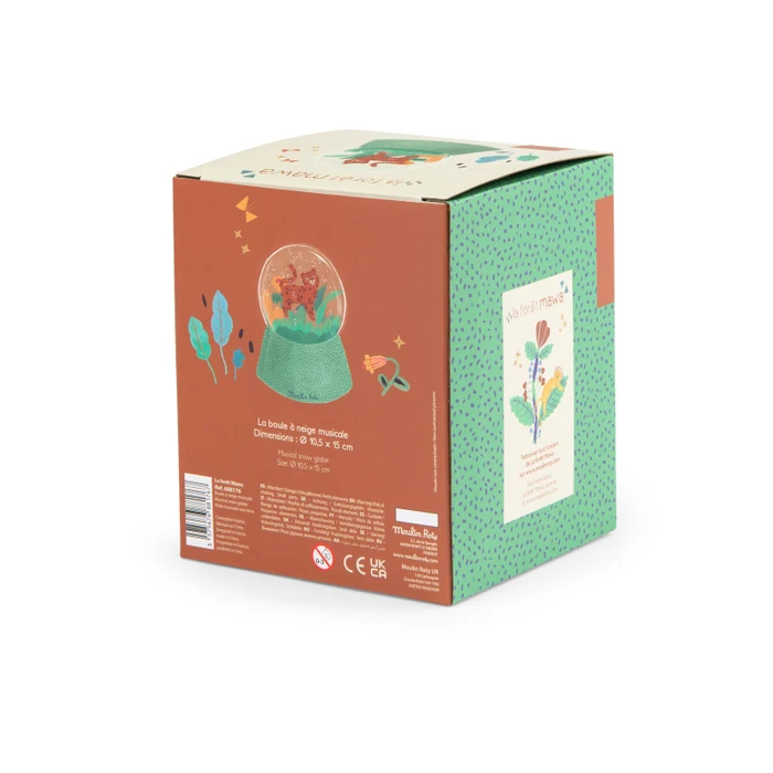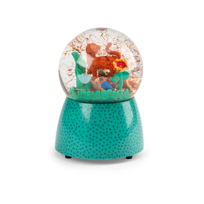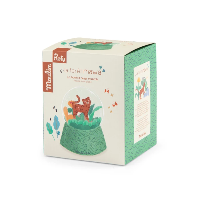 Piękna kula śnieżna w turkusowych kolorach z pozytywką z serii La Foret Mawa, oczaruje każde dziecko. W kuli pod deszczem konfetti znajduje się mały lampart Taigo. Kula stanowi doskonałą ozdobę dziecięcego pokoju. Pozytywkę wprawia się w ruch poprzez nakręcenie korbki znajdującej się w podstawie kuli.
