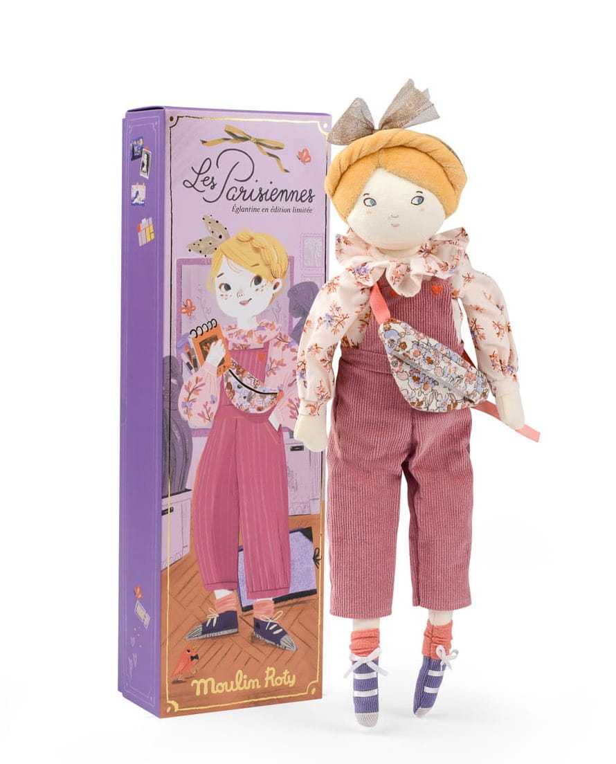 Limitowana edycja: Lalka Mademoiselle Eglantine szykuje się na lekcje rysunku w jednej z paryskich dzielnic. W związku z tym ubrała się w kwiecista koszulę z falbaną i ogrodniczki. Pod ręką ma swoją saszetkę nerkę, a na nogach wygodne baletki. Swoje spięte blond włosy przyozdobiła kokardą.