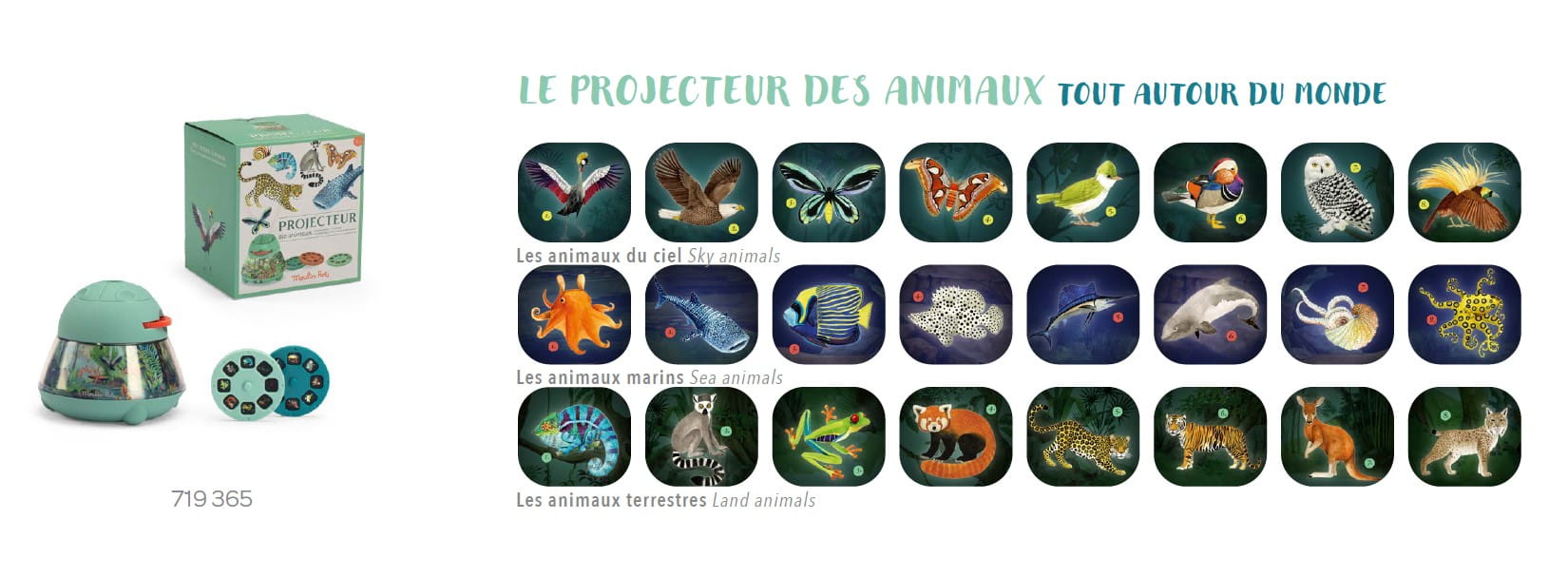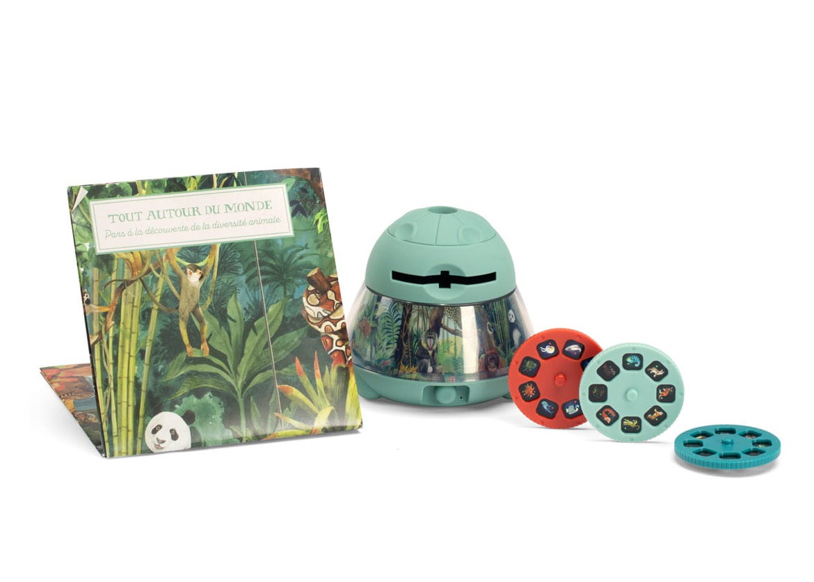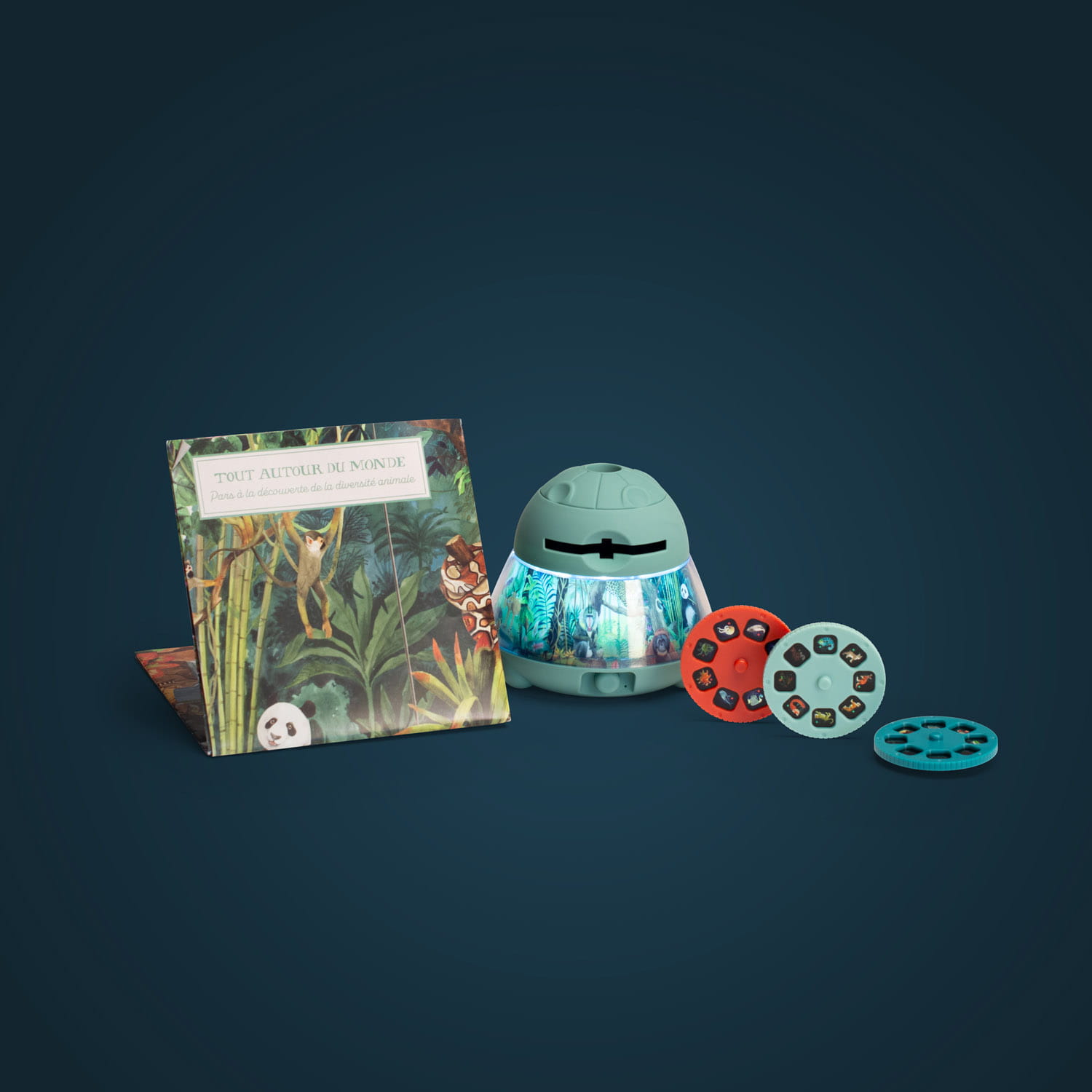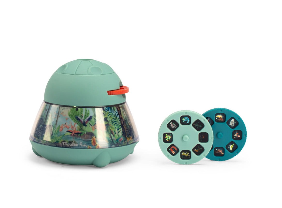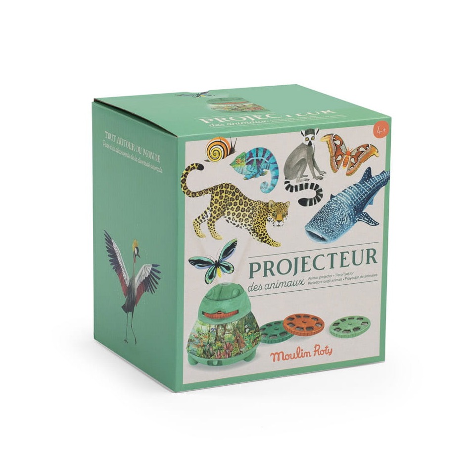 Poznajemy zwierzęta świata, dzięki lampce projektorowi od Moulin Roty! W zestawie znajdują się 3 dyski ze slajdami (po 8 na jeden), które należy umieścić w lampce i skierować obraz na gładką ścianę w ciemnym pokoju. Zwierzęta lądowe, wodne i żyjące na niebie czekają na odkrycie!