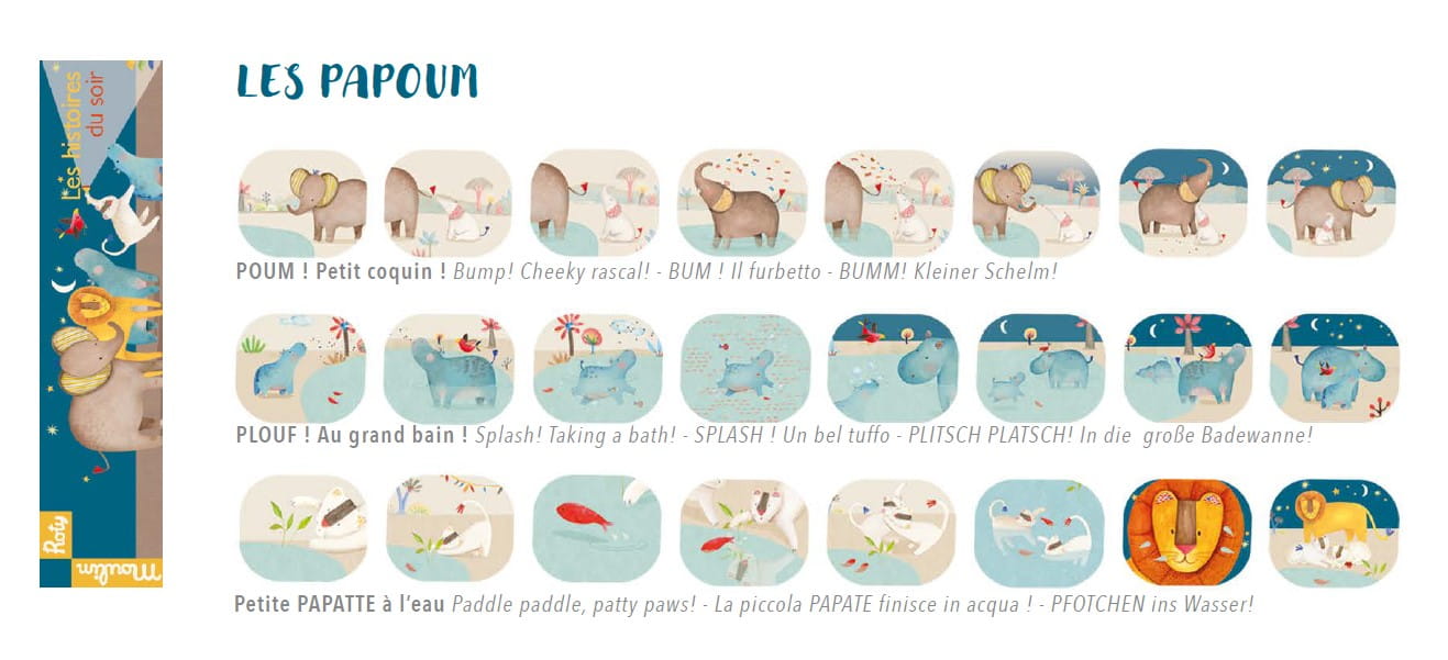Mała latarka projektor, do której wkładamy 3 różne filmiki , z których każdy opowiada historię o sawannie Papoum do projekcji na ścianie.