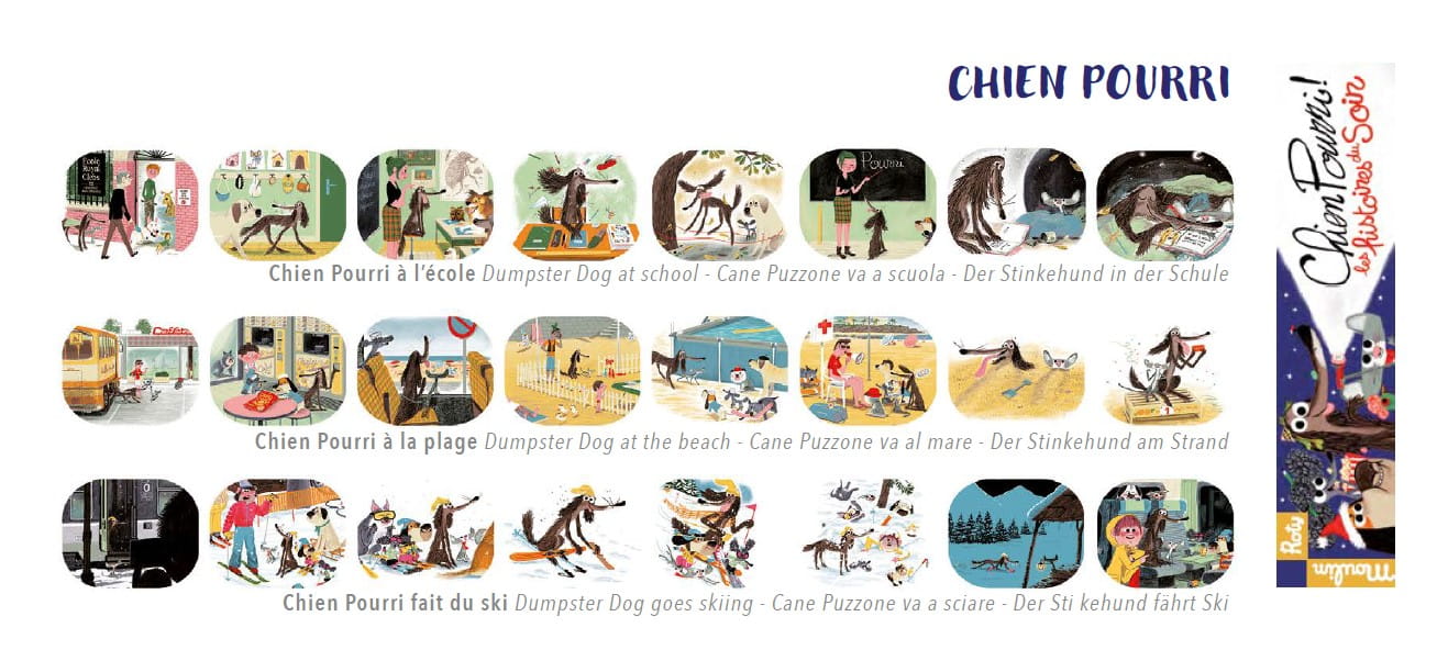 Tytuły bajek w zestawie: Pies Pourri w szkole, Pies Pourri na plaży, Pies Pourri jedzie na narty