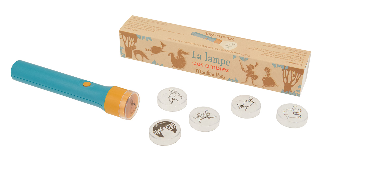 Projektor cieni firmy Moulin Roty to świetna zabawa dla młodszych i starszych dzieci. Zestaw zawiera latarkę - projektor i 6 nakładek z różnymi postaciami (smoka, rycerza, księżniczkę, wilka itp.). Wystarczy nałożyć wybraną nakładkę na latarkę i skierować ją na sufit lub ścianę i zacząć opowiadać hisotrię. Ogranicza nas tylko wyobraźnia.