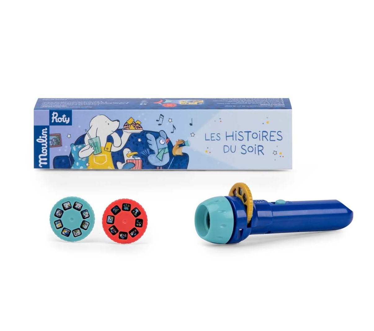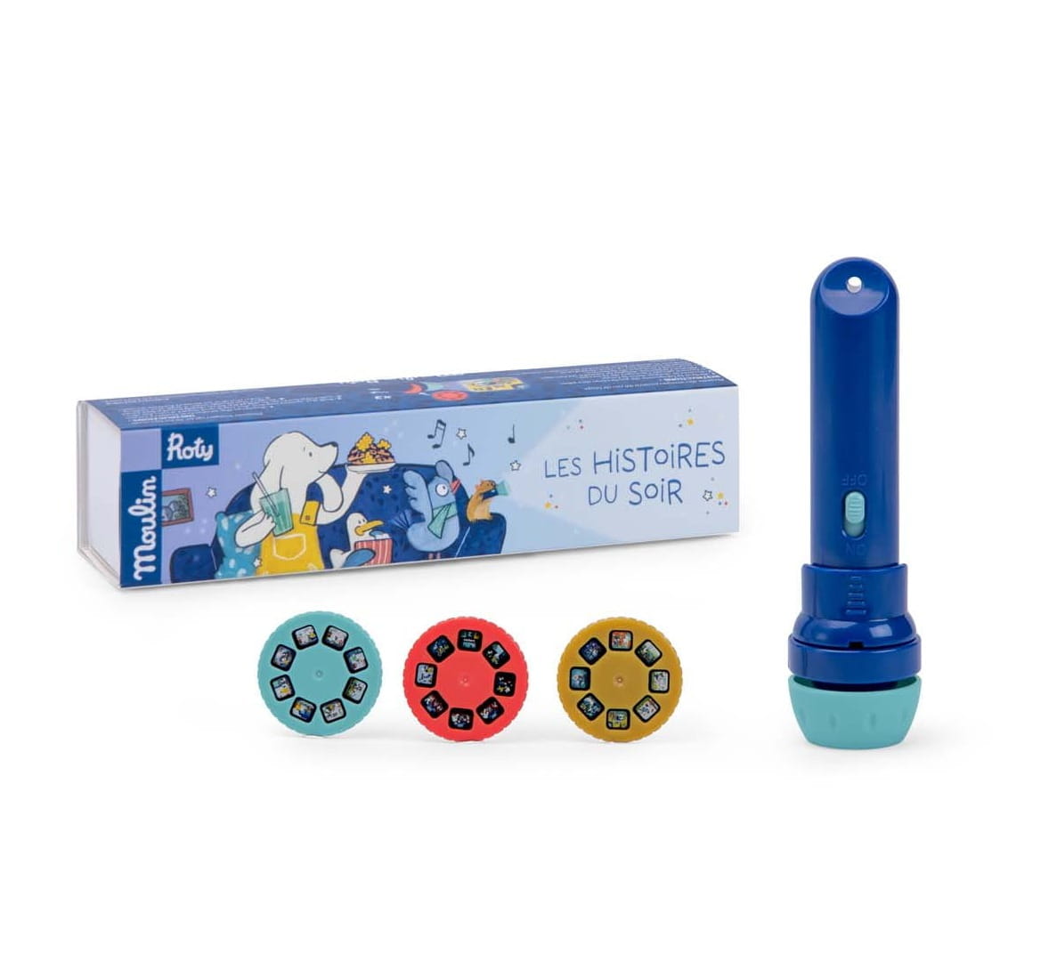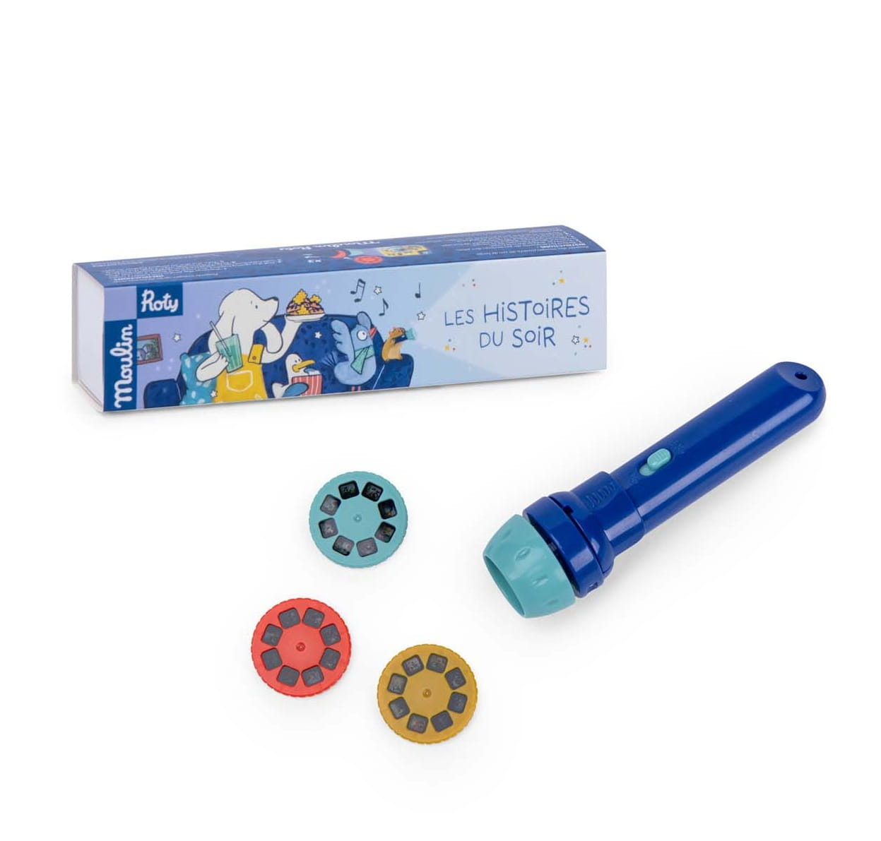 Latarka projektor to zabawka otwierająca drzwi do świata wyobraźni. W zestawie znajdują się 3 dyski, które wkłada się do latarki i wyświetla slajdy na gładkiej ścianie. Bajki opowiadają historie bohaterów kolekcji Puce & Pilou. Podczas zabawy z latarką -projektorem dziecko rozwija zdolności poznawcze, kreatywność i wyobraźnię. Oglądanie slajdów i opowiadanie historii to ciekawa alternatywa do wieczornego czytania książeczek i pomysł na wartościowy czas spędzony w rodzinnym gronie.