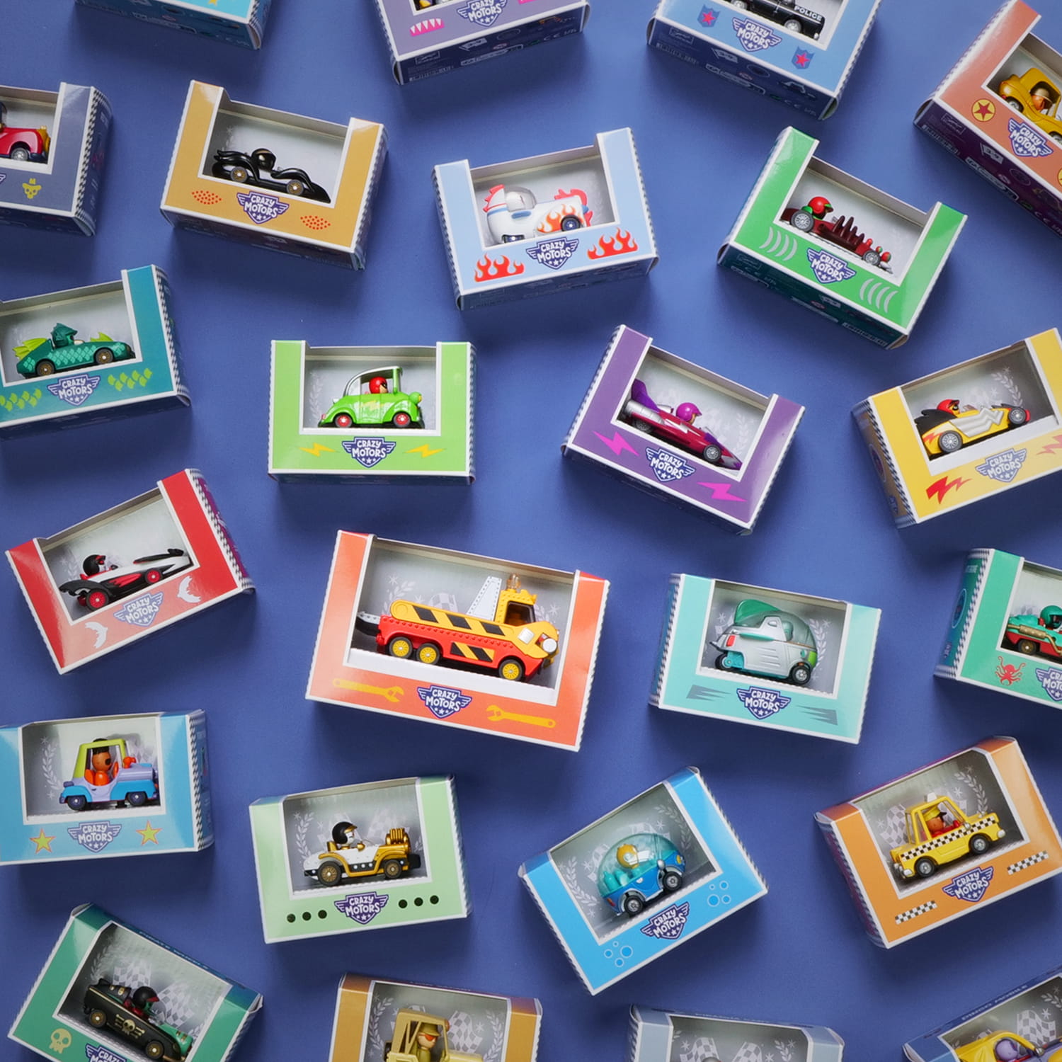 Zawartość: 1 laweta z dużą platformą, która zniża się do poziomu drogi i mieści autka z kolekcji Crazy Motors.