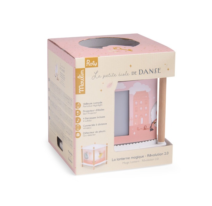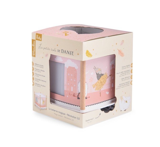 Magiczna lampka dekorowana uroczymi myszkami baletnicami z kolekcji La petite école de danse. Posiada kilka funkcji: wyświetla gwiazdki na suficie, wygrywa 4 kołysanki i nawet wykrywa płacz! W zestawie znajduje się kabel USB.