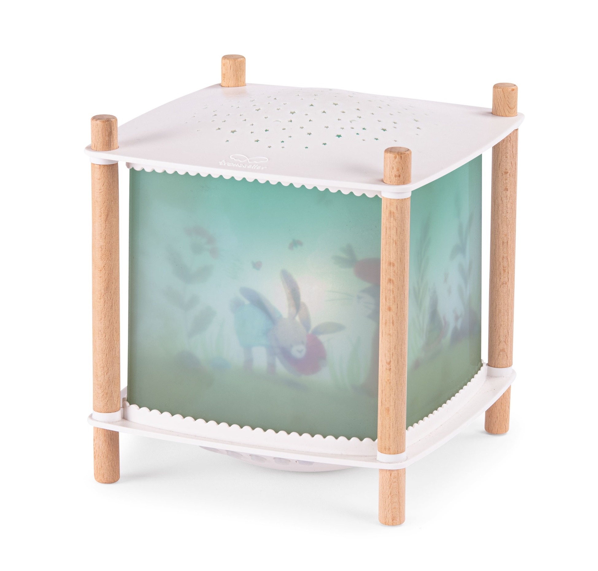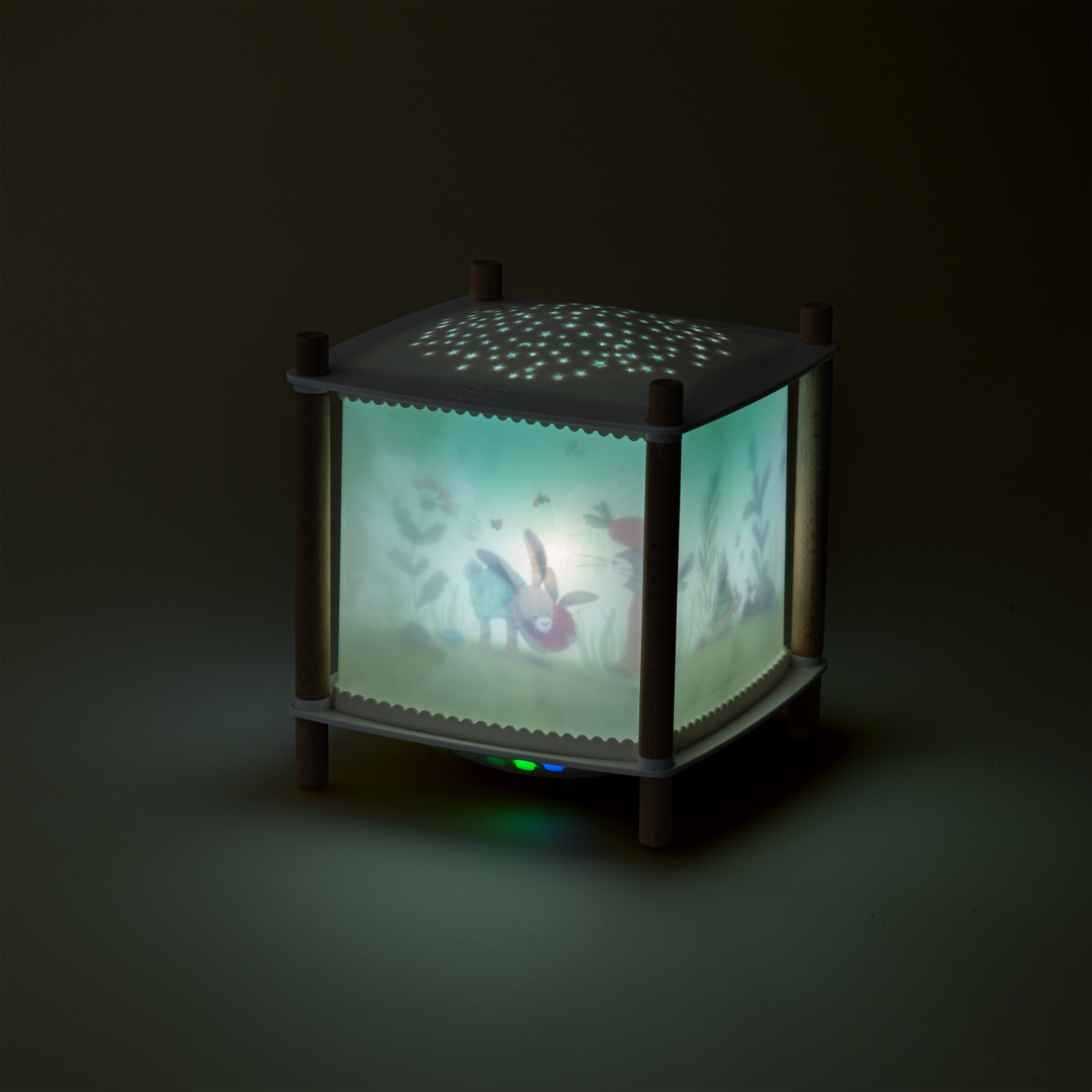 Magiczna lampka dekorowana uroczymi króliczkami z kolekcji Trois Petits Lapins. Posiada kilka funkcji: wyświetla gwiazdki na suficie, wygrywa 4 kołysanki i nawet wykrywa płacz! W zestawie znajduje się kabel USB.