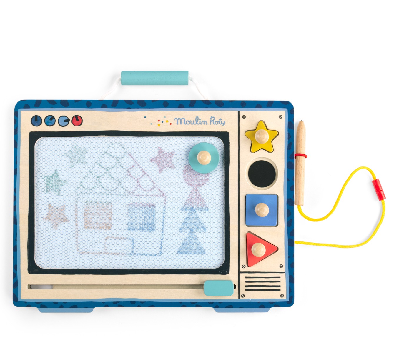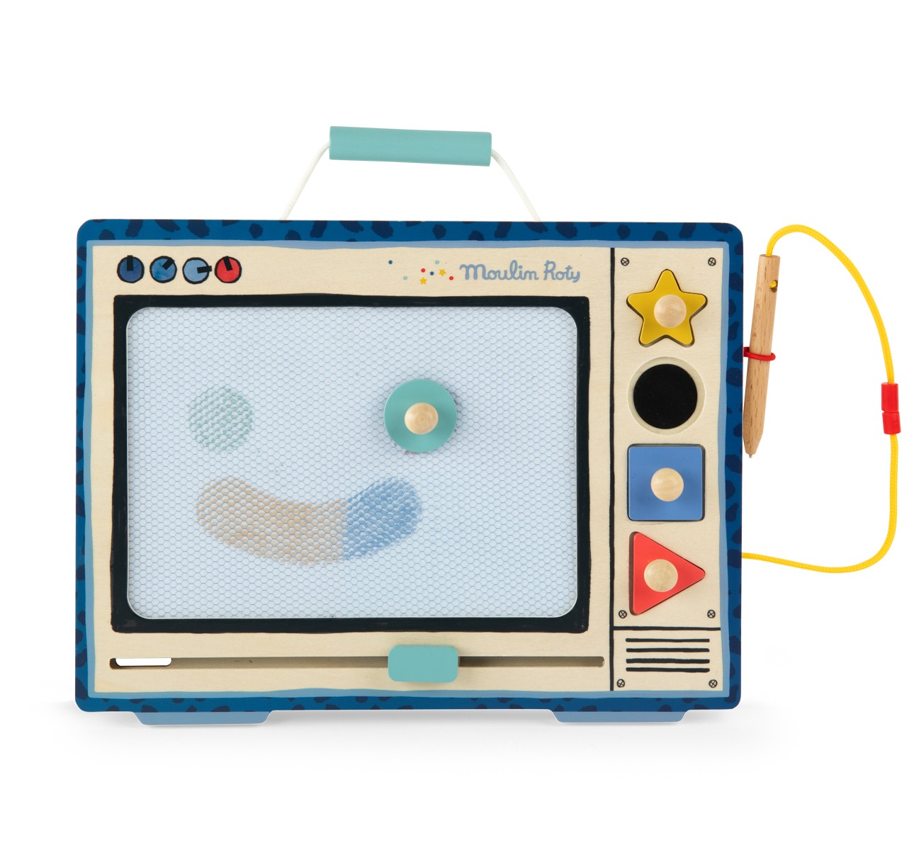Magnetyczny ekran do pisania i rysowania. Zasada jest prosta: w części o strukturze plastra miodu dziecko może tworzyć swoje obrazki lub zapisywać dowolne teksty za pomocą załączonego rysika. Zabawa może trwać bez końca: aby zapiski zniknęły należy przesunąć suwak. Tablica wyglądem przypomina telewizor starego typu i nawiązuje do stylu retro charakterystycznego dla kolekcji Puce & Pilou. Urozmaiceniem zabawy są dodatkowe drewniane elementy znajdujące się z boku ekranu. Ich kształty można odbijać jak pieczątki na ekranie i tworzyć jeszcze ciekawsze rysunki.
