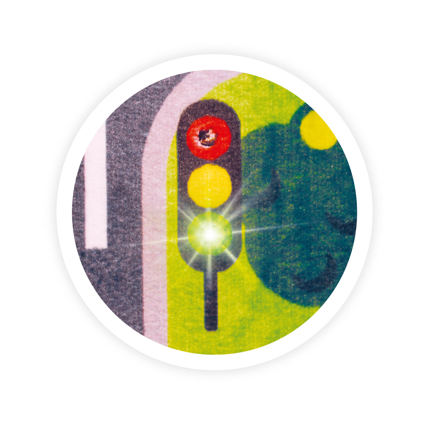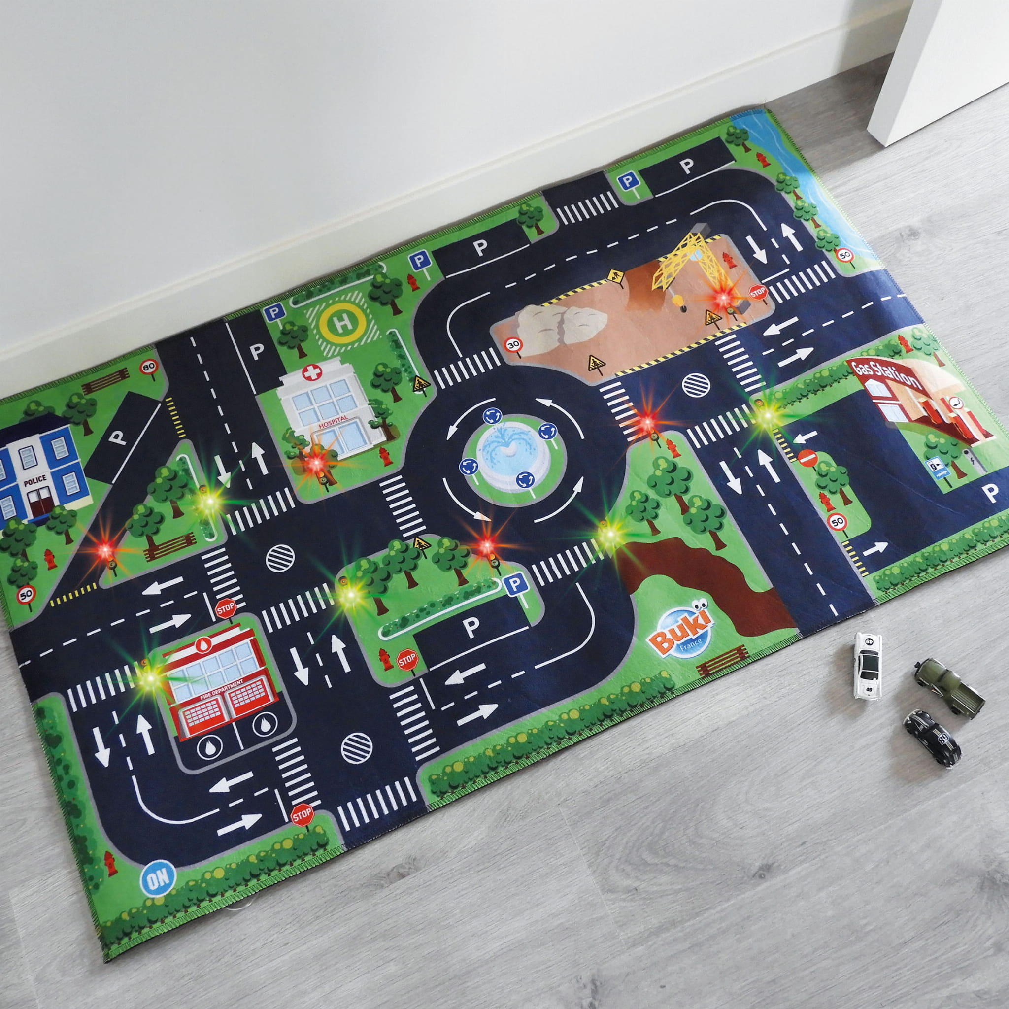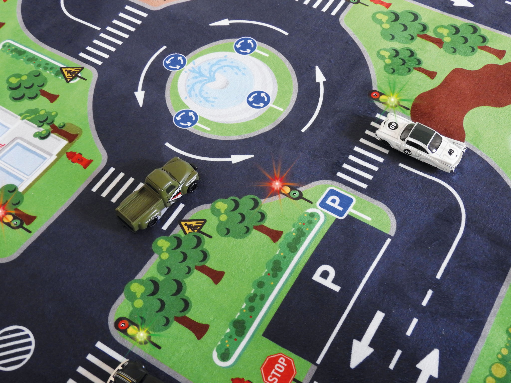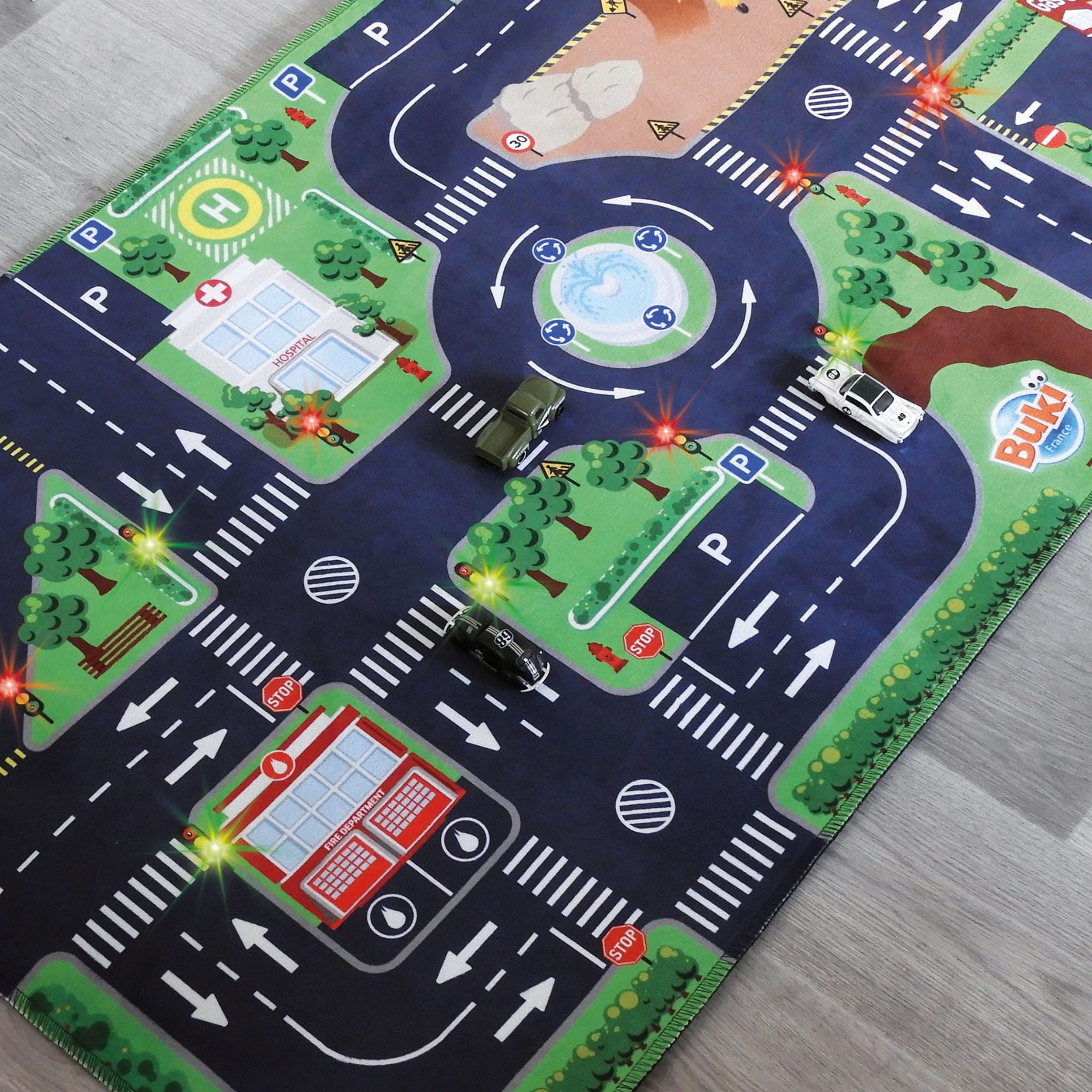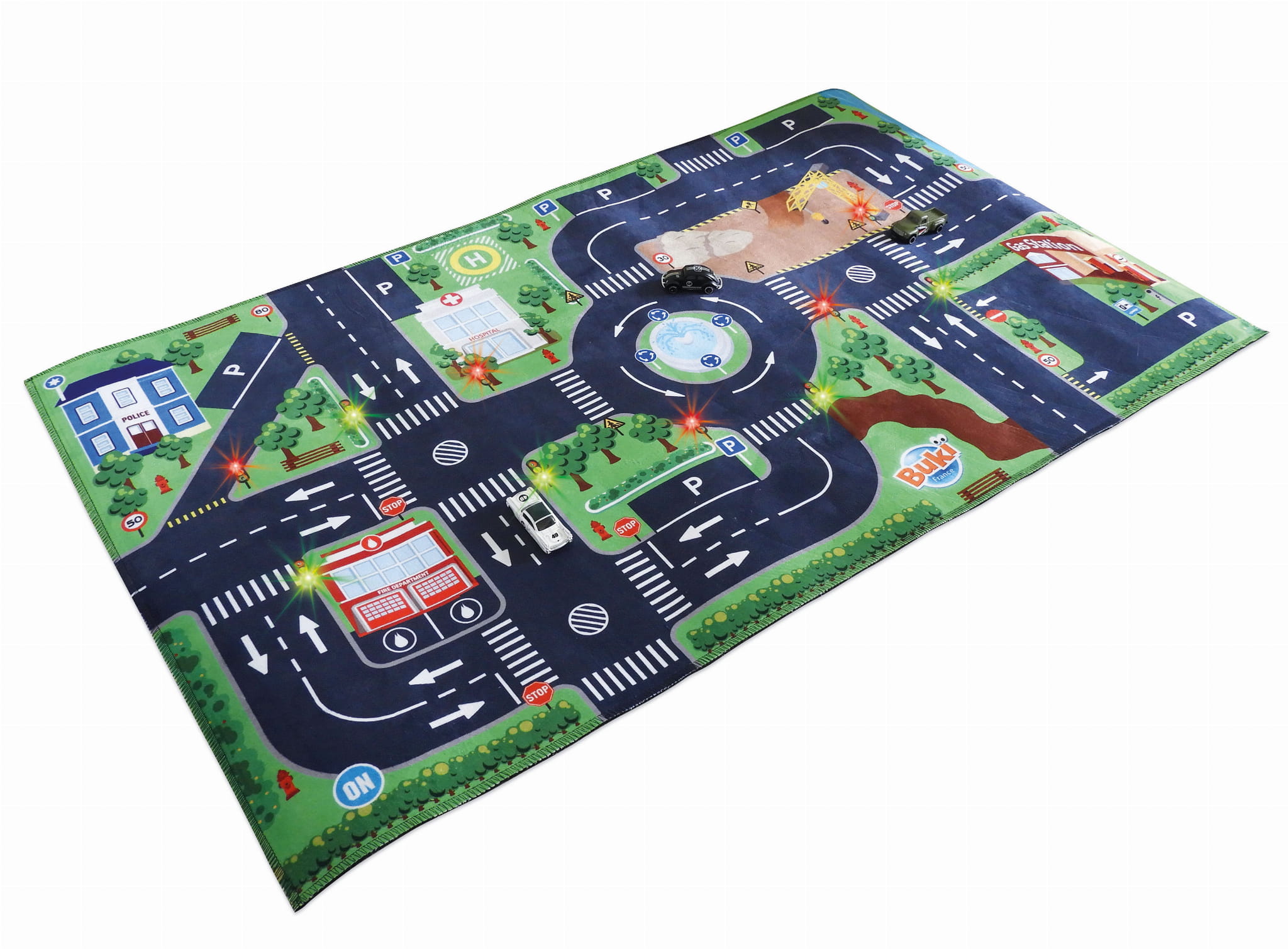 Miękka mata z ilustracją drogi oraz sygnalizacją świetlną, która świeci i