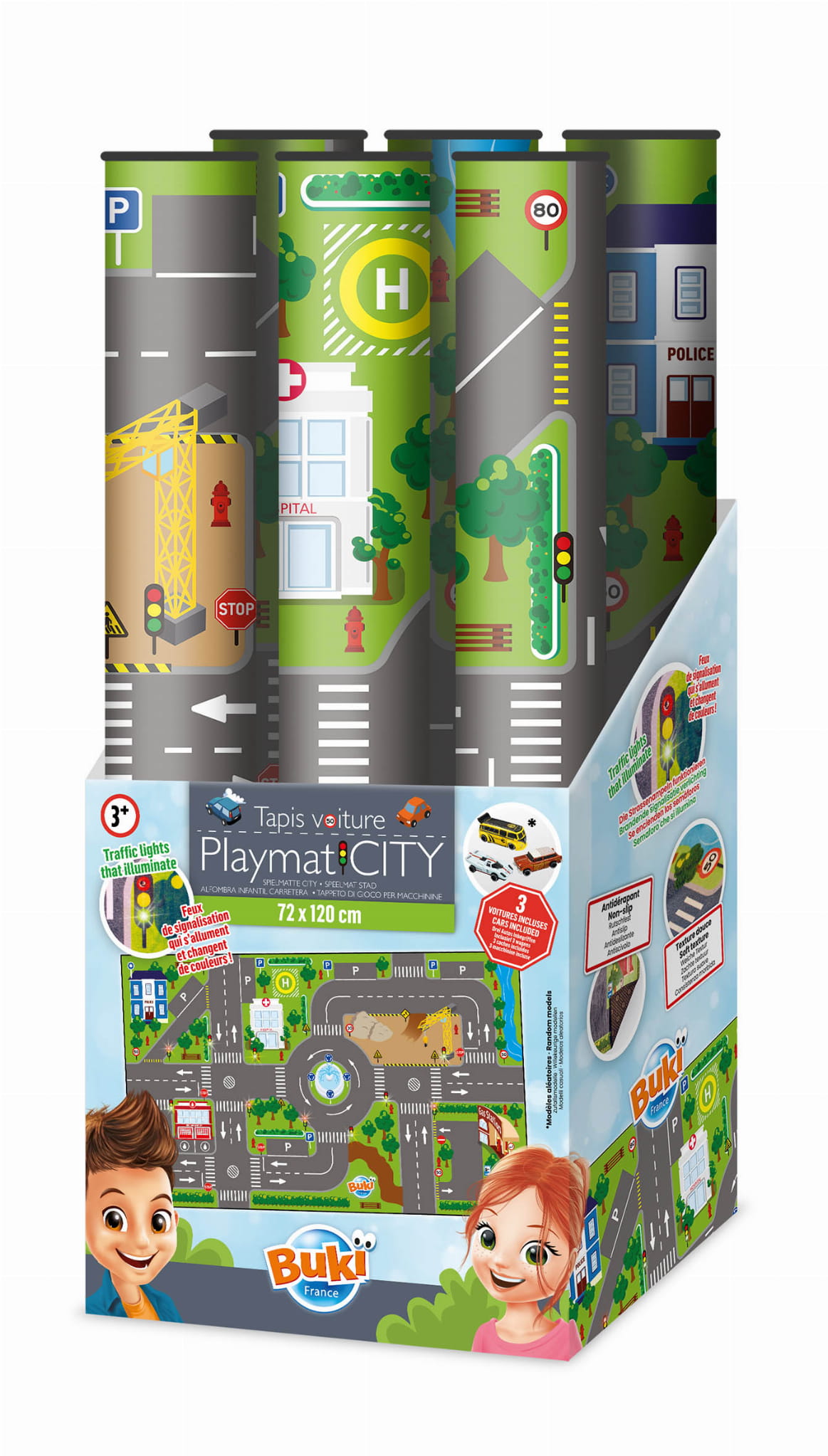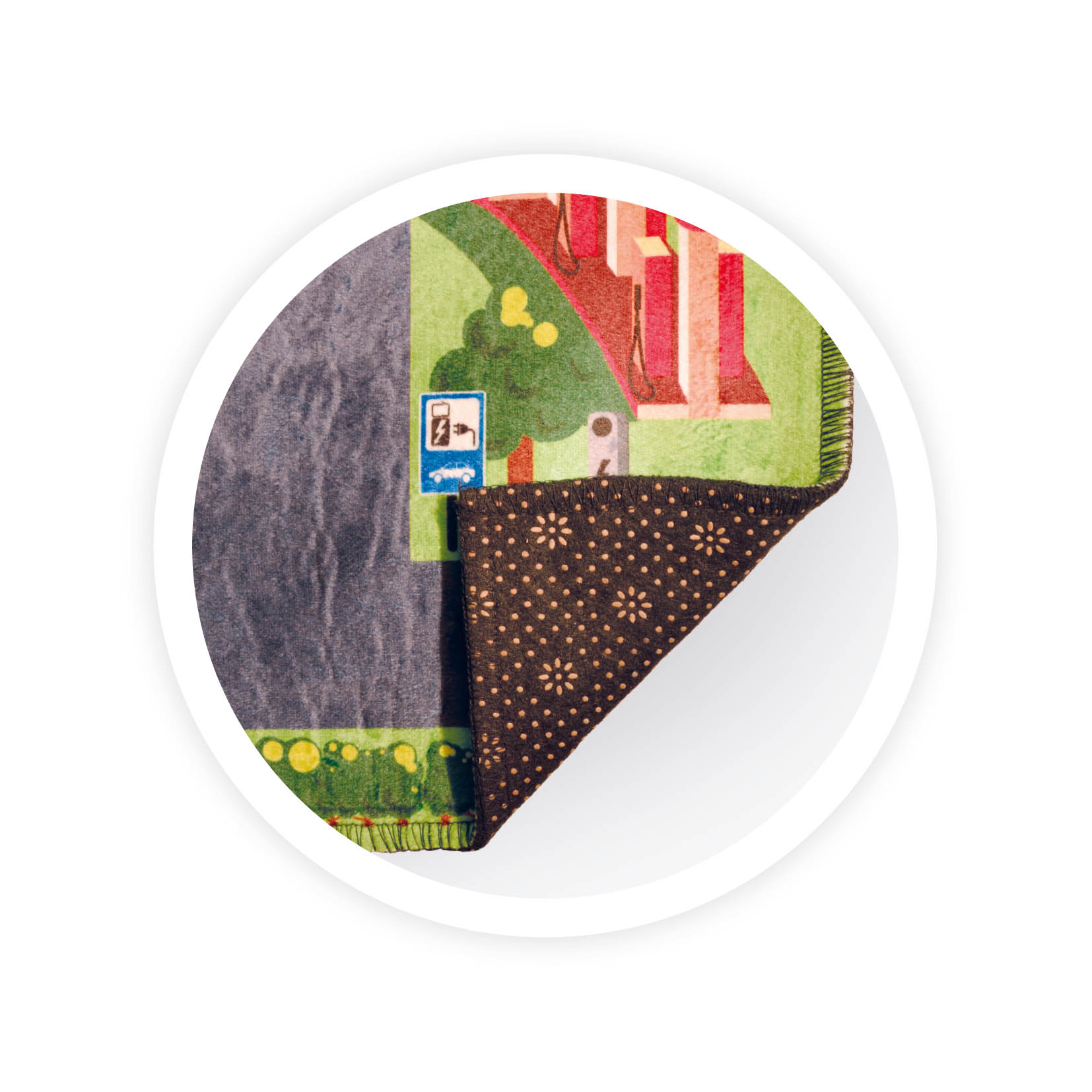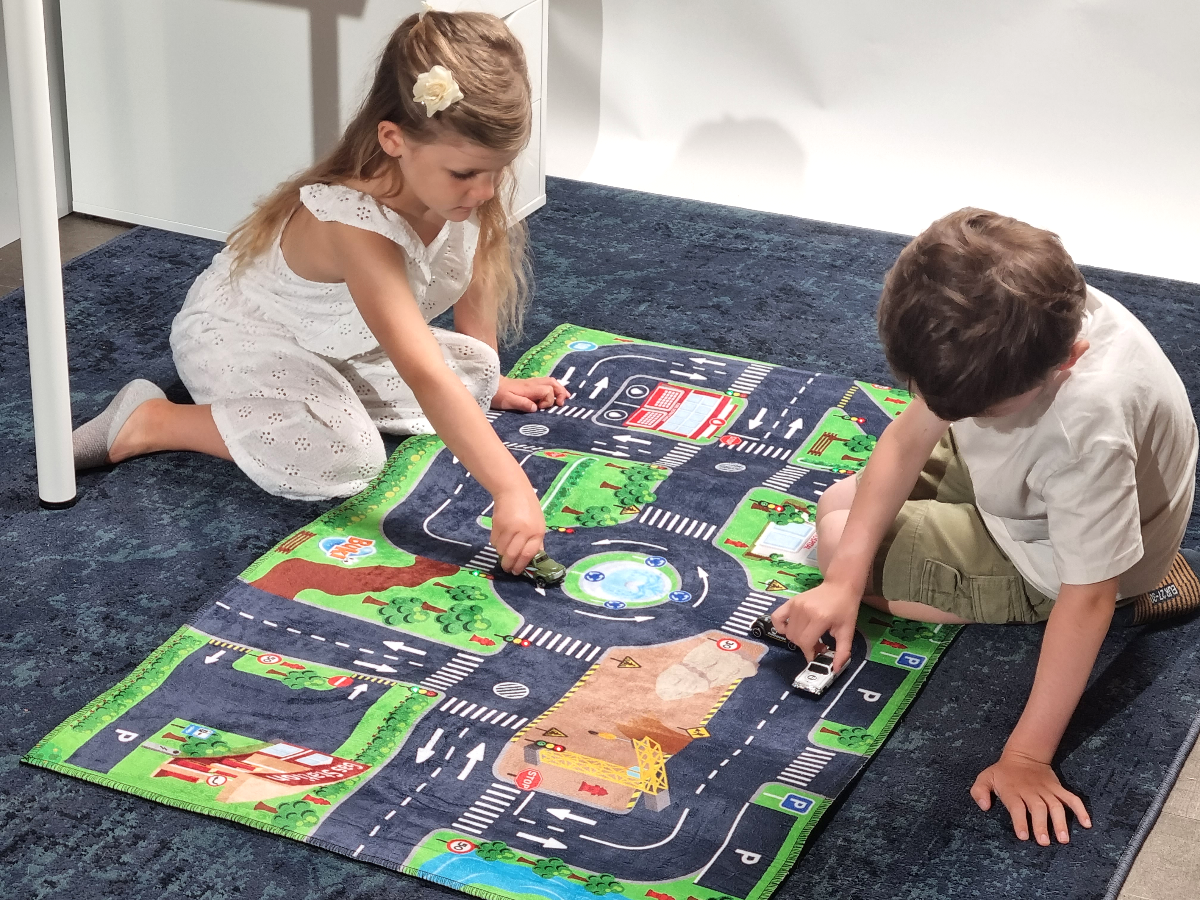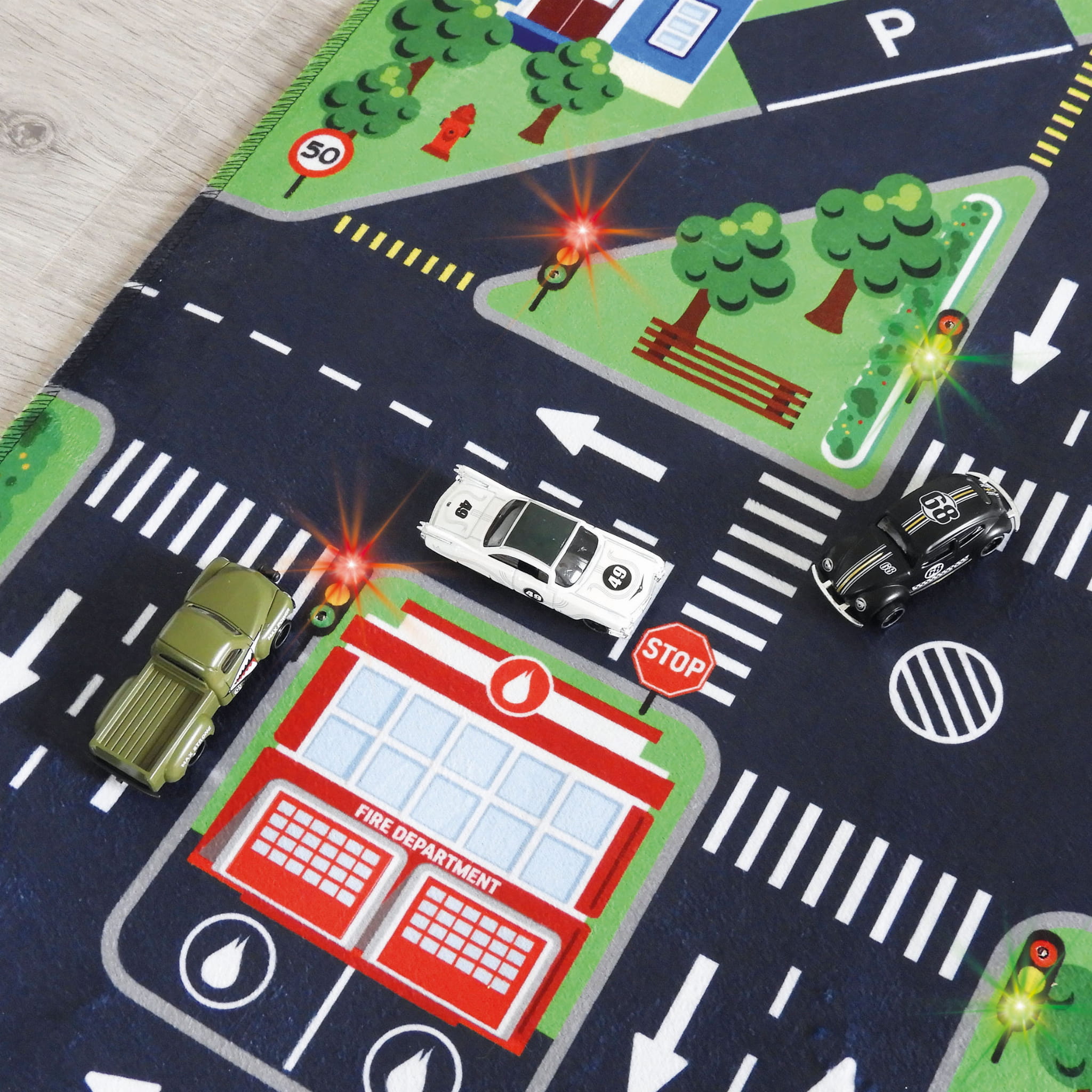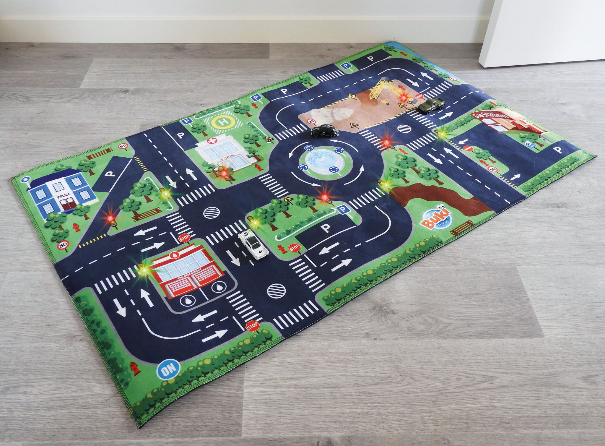 Miękka mata z ilustracją drogi oraz sygnalizacją świetlną, która świeci i