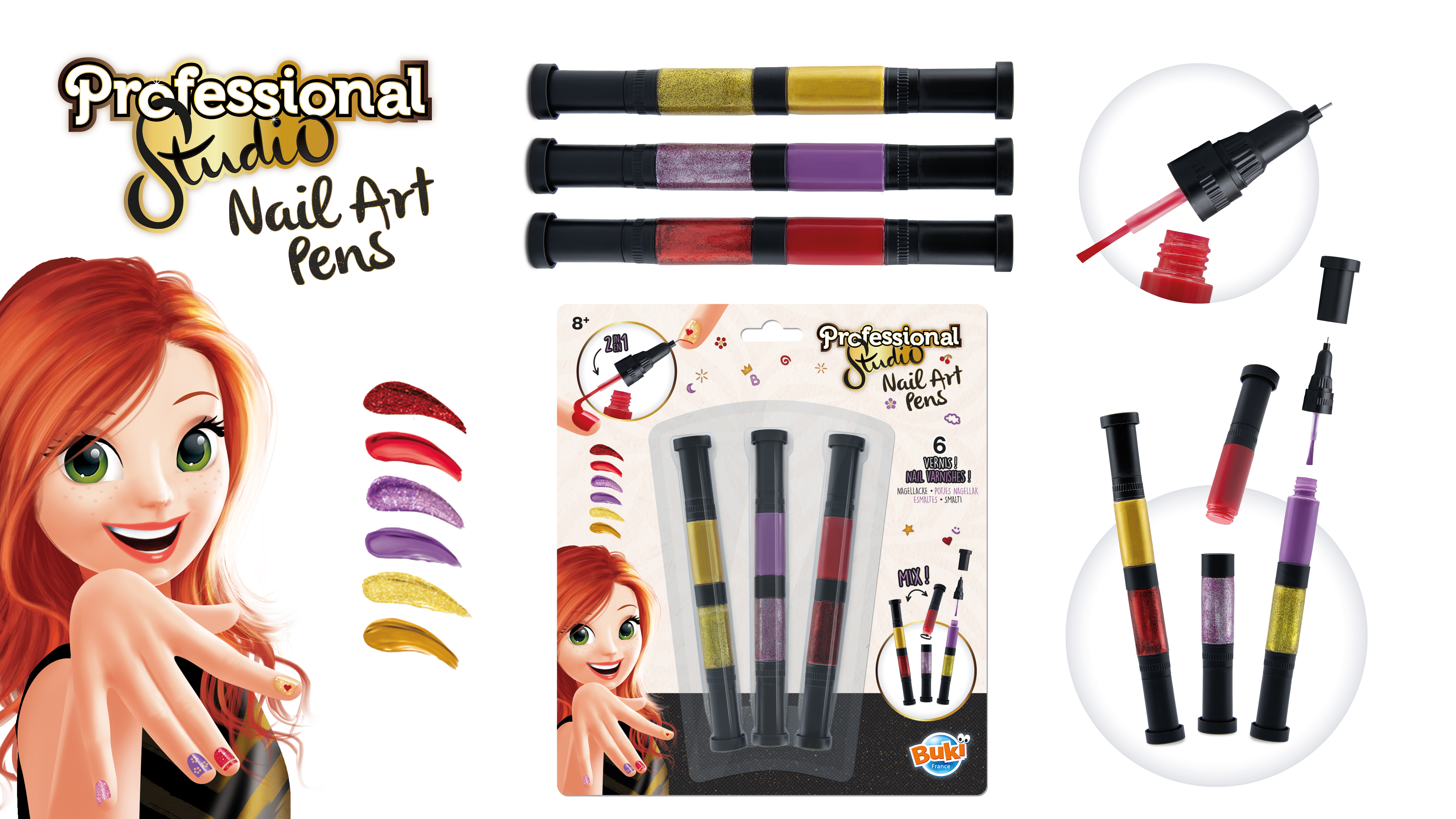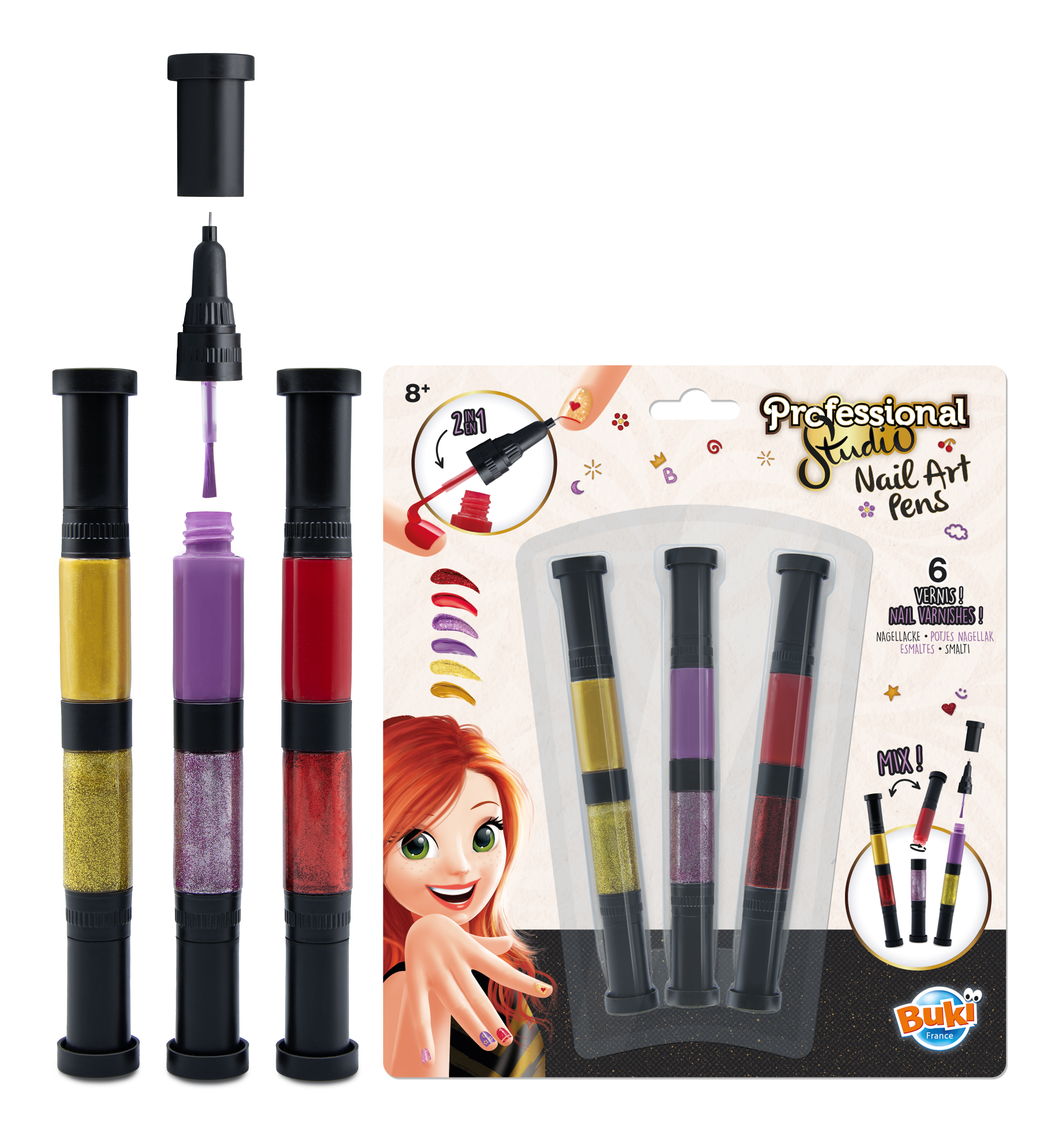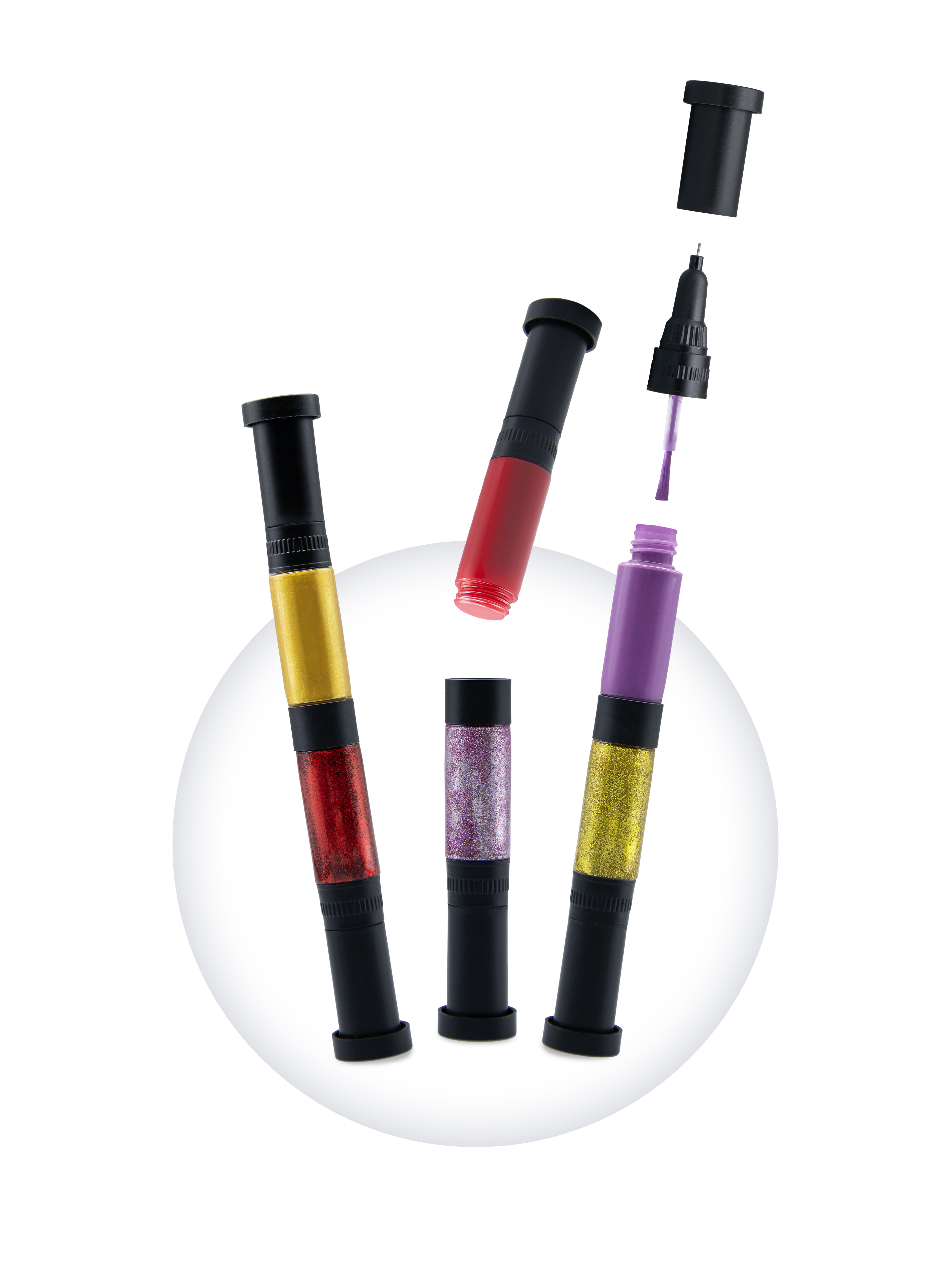 Mazaki do stylizacji paznokci 2 w 1: nałóż lakier na paznokcie końcówką z pędzelkiem, a następnie ozdób pisakiem.